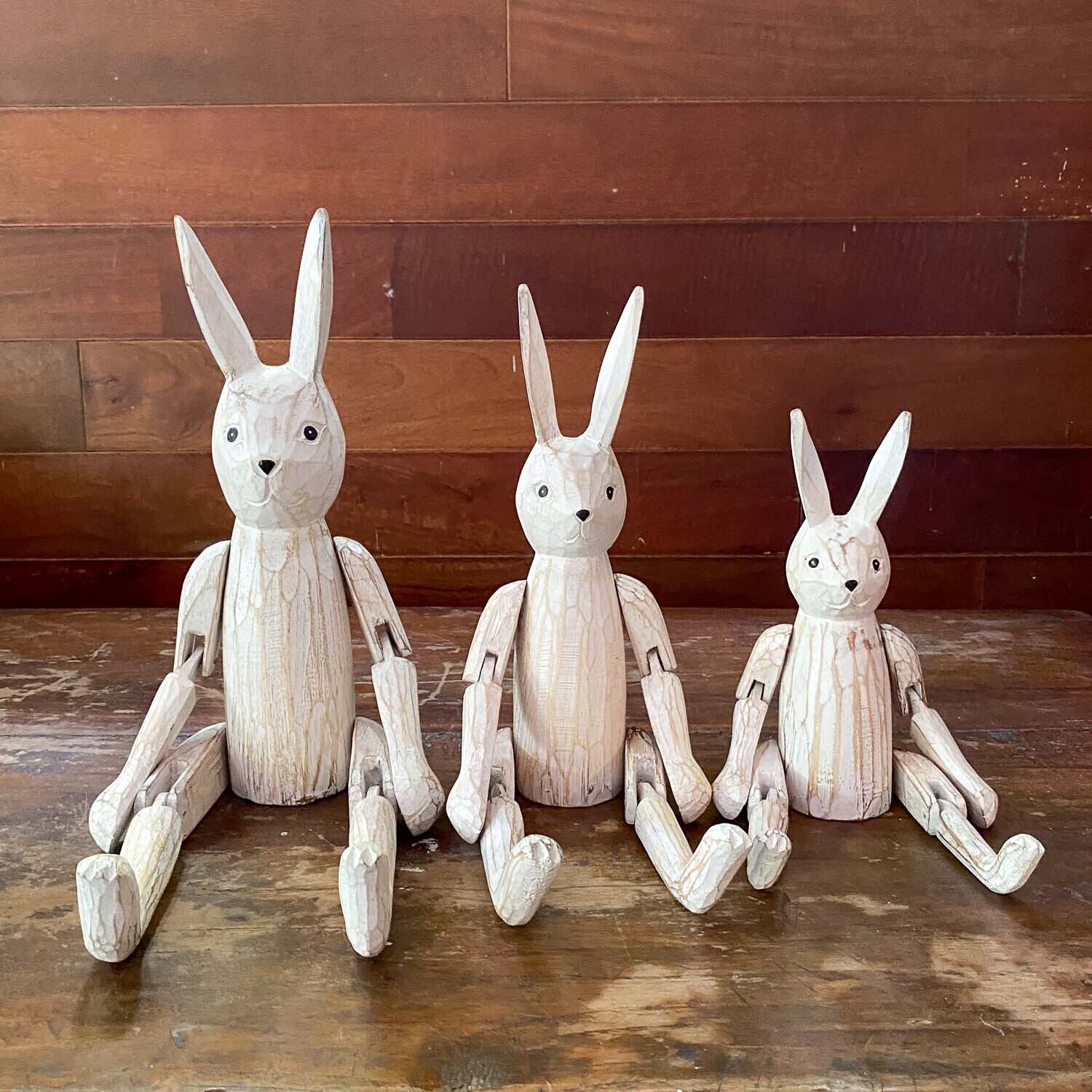 手足がぶらぶらしている木彫りのうさぎ。