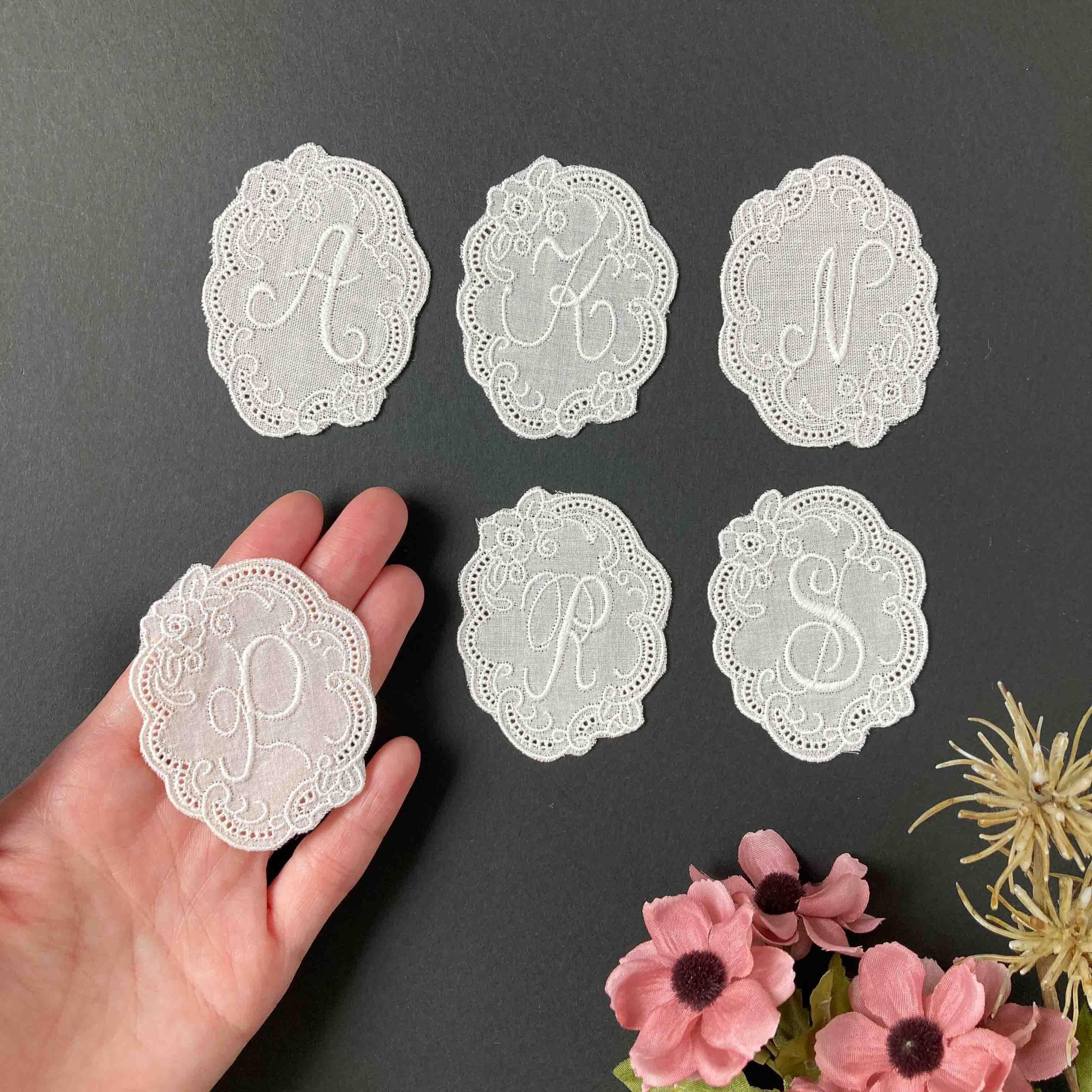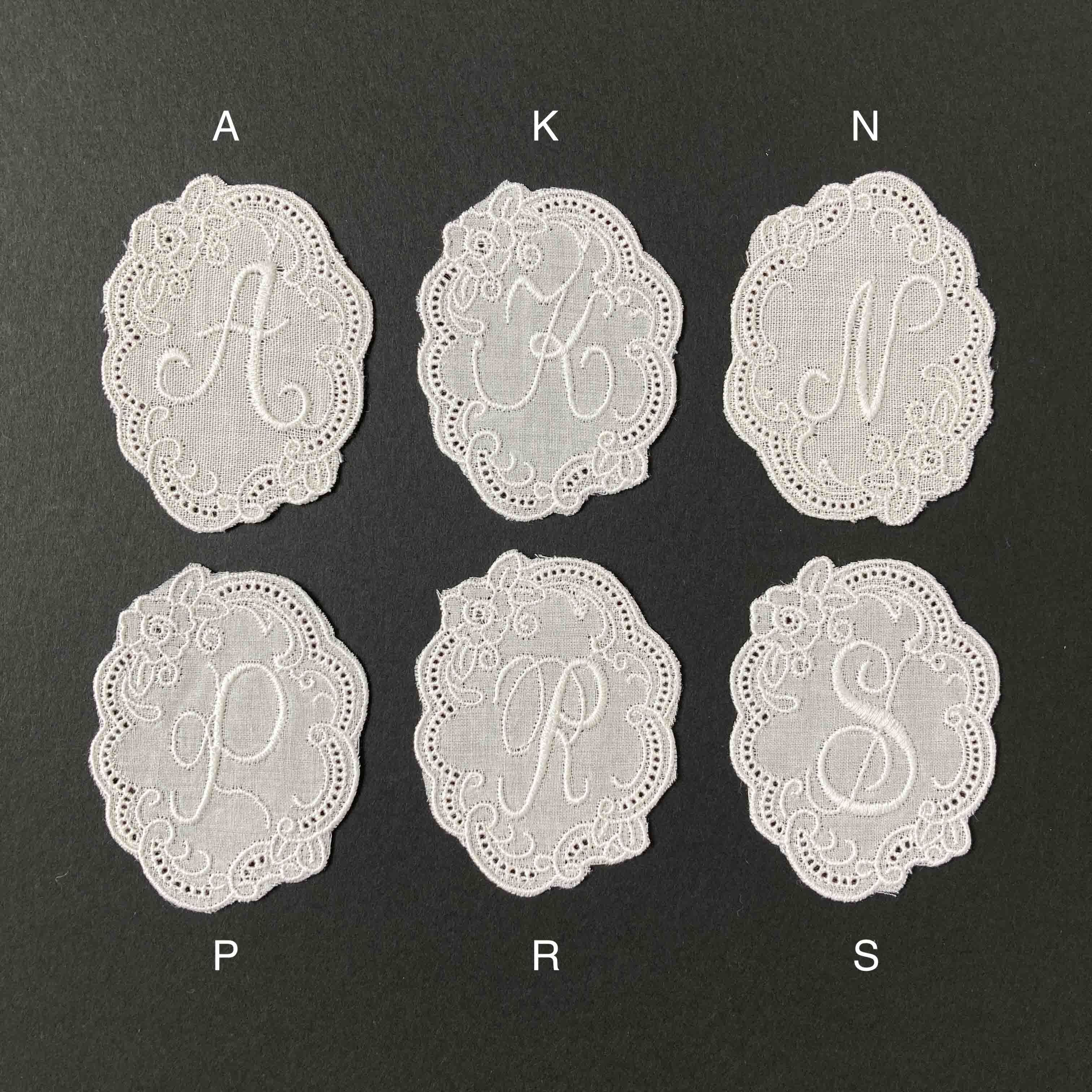 筆記体調のイニシャル入りのレース。