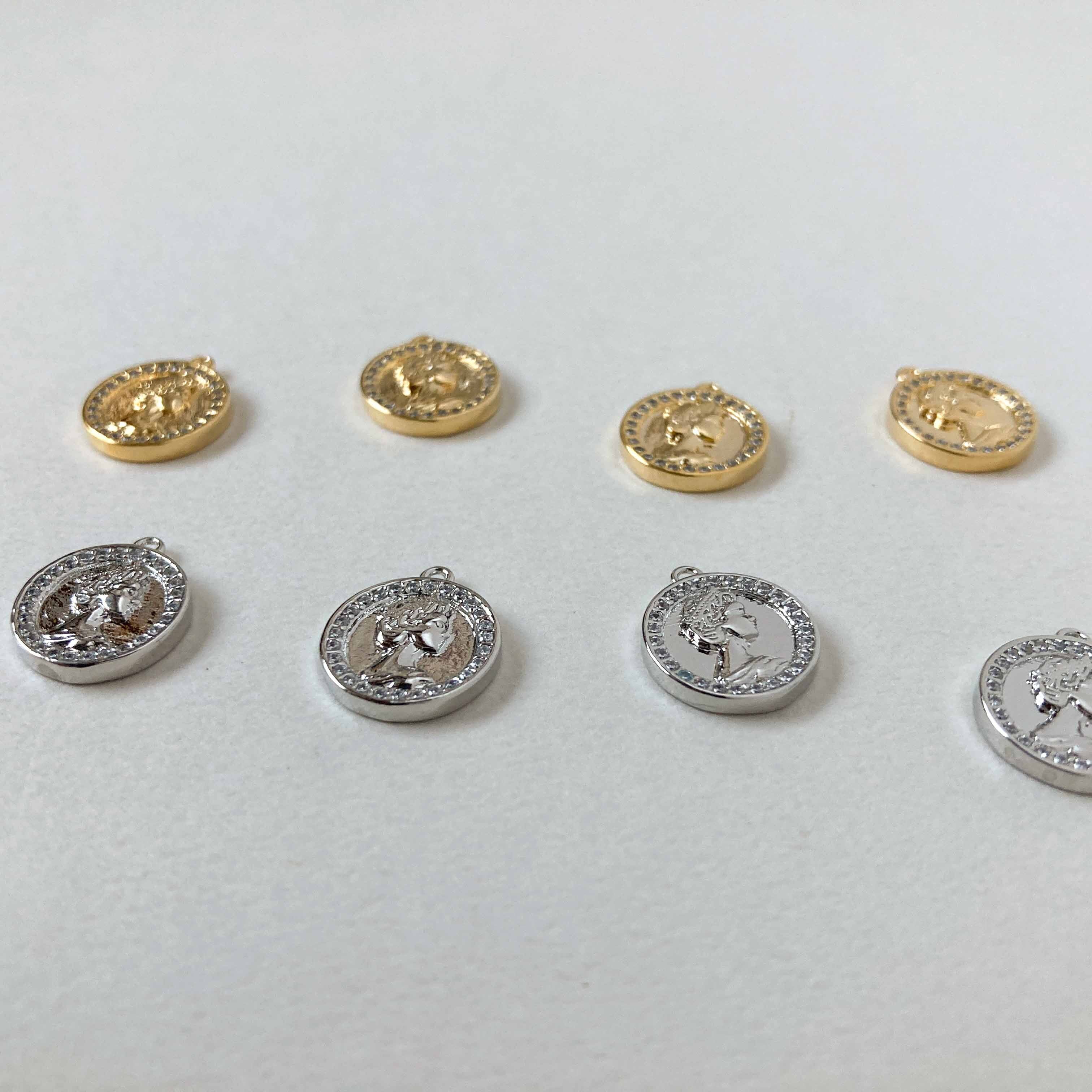 外国のコインのようなデザインがオシャレなチャーム。 縁のビジューが煌めきます。 ■販売単位:1個 ■種類:Aゴールド、Bシルバー ■サイズ(縦×横×厚み/奥行):約14×12×2mm ■素材:メタル(16K/プラチナメッキ)、ジルコニア ■ビジュー部分の貼り付けにズレが生じてる場合がございます。 ■素材の性質上、細かいスレ、傷がある場合がございます。 予めご了承ください。 ■商品コード:CH2510115