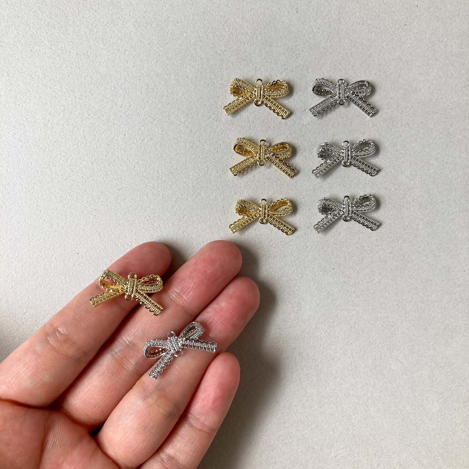 繊細なレース模様が可愛いりぼんチャーム。 上下にカンが付いているので 様々なアレンジがしやすいパーツです。 ■販売単位:1個 ■種類:Aゴールド、Bシルバー ■サイズ(縦×横×厚み/奥行):約13×22×3mm ■素材:ジルコニア、メタル(16K/プラチナメッキ) ■素材の性質上、折れ曲がりやすいので取り扱いにご注意ください。 ■商品コード:CH2510053 2025/11 価格変更