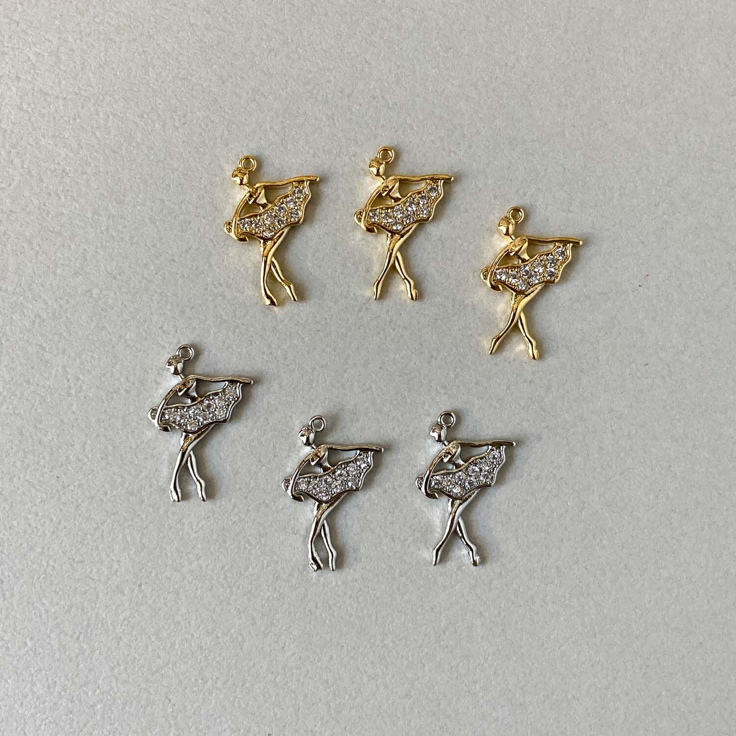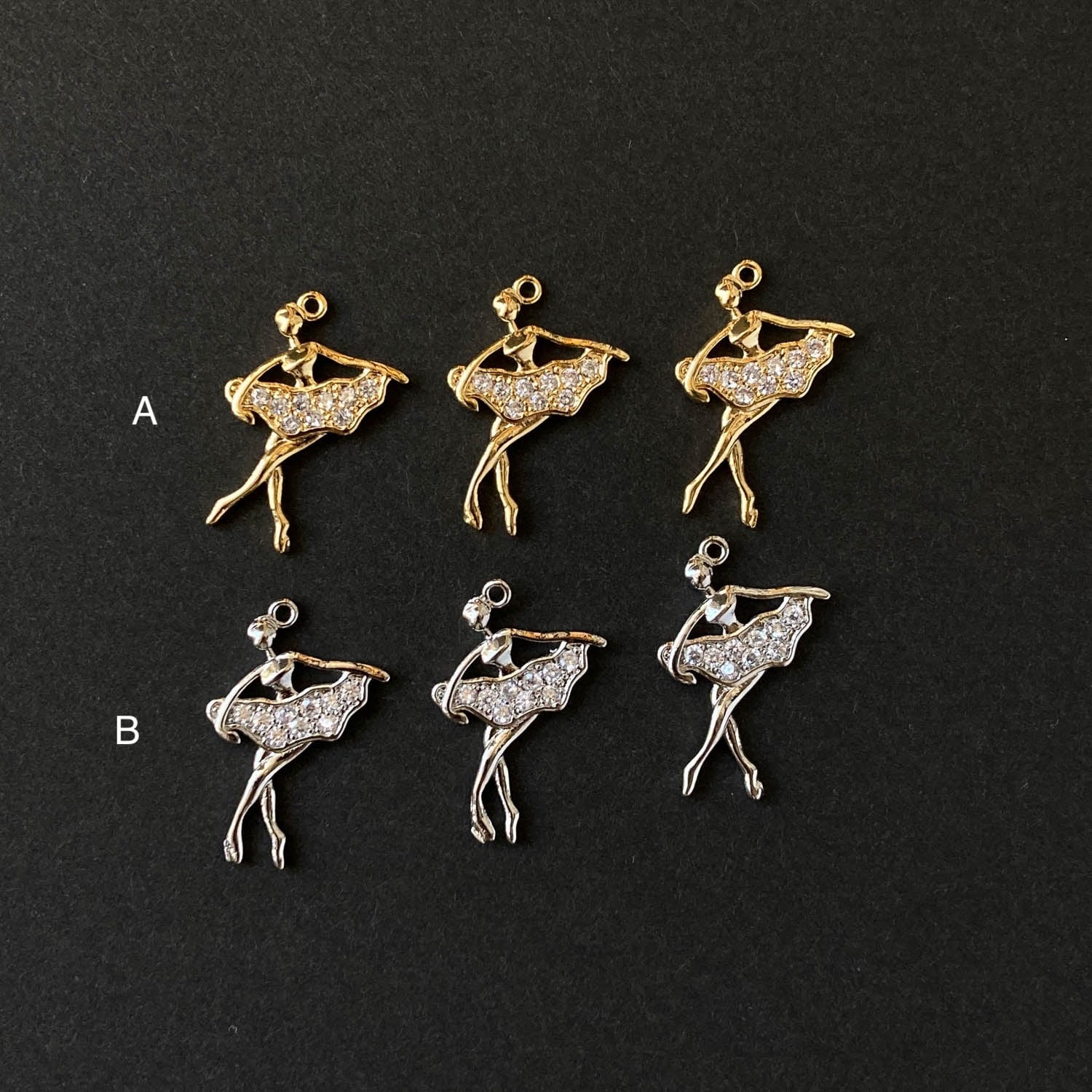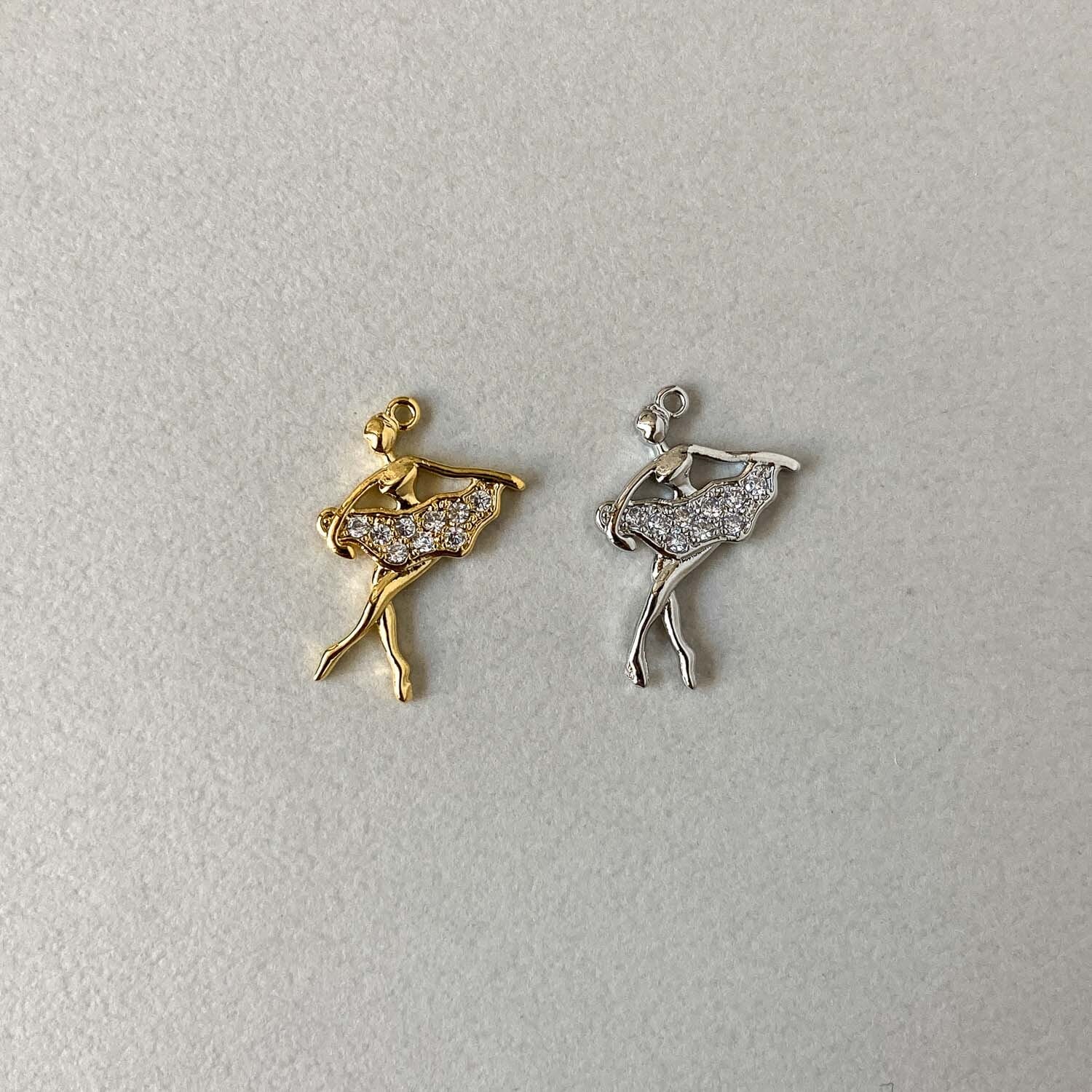 踊るバレリーナのチャーム。 揺れるたびにジルコニアがキラキラと輝きます。 ■販売単位:1個 ■種類:Aゴールド、Bシルバー ■サイズ(縦×横×厚み/奥行):約21×14×2mm ■素材:メタル(16K/プラチナメッキ)、ジルコニア ■ビジュー部分の貼り付けにズレが生じてる場合がございます。 ■素材の性質上、細かいスレ、傷がある場合がございます。 予めご了承ください。 ■商品コード:CH2510104