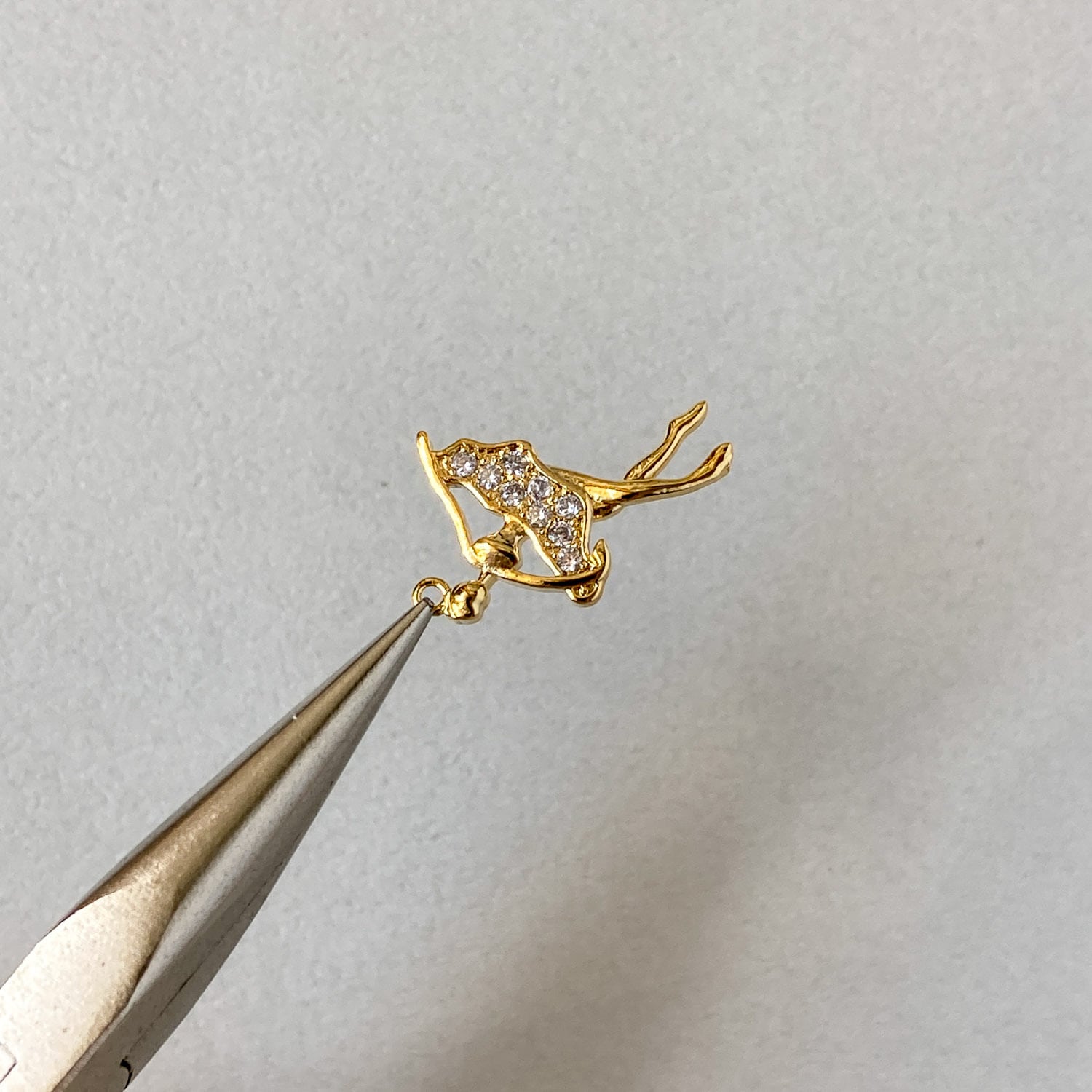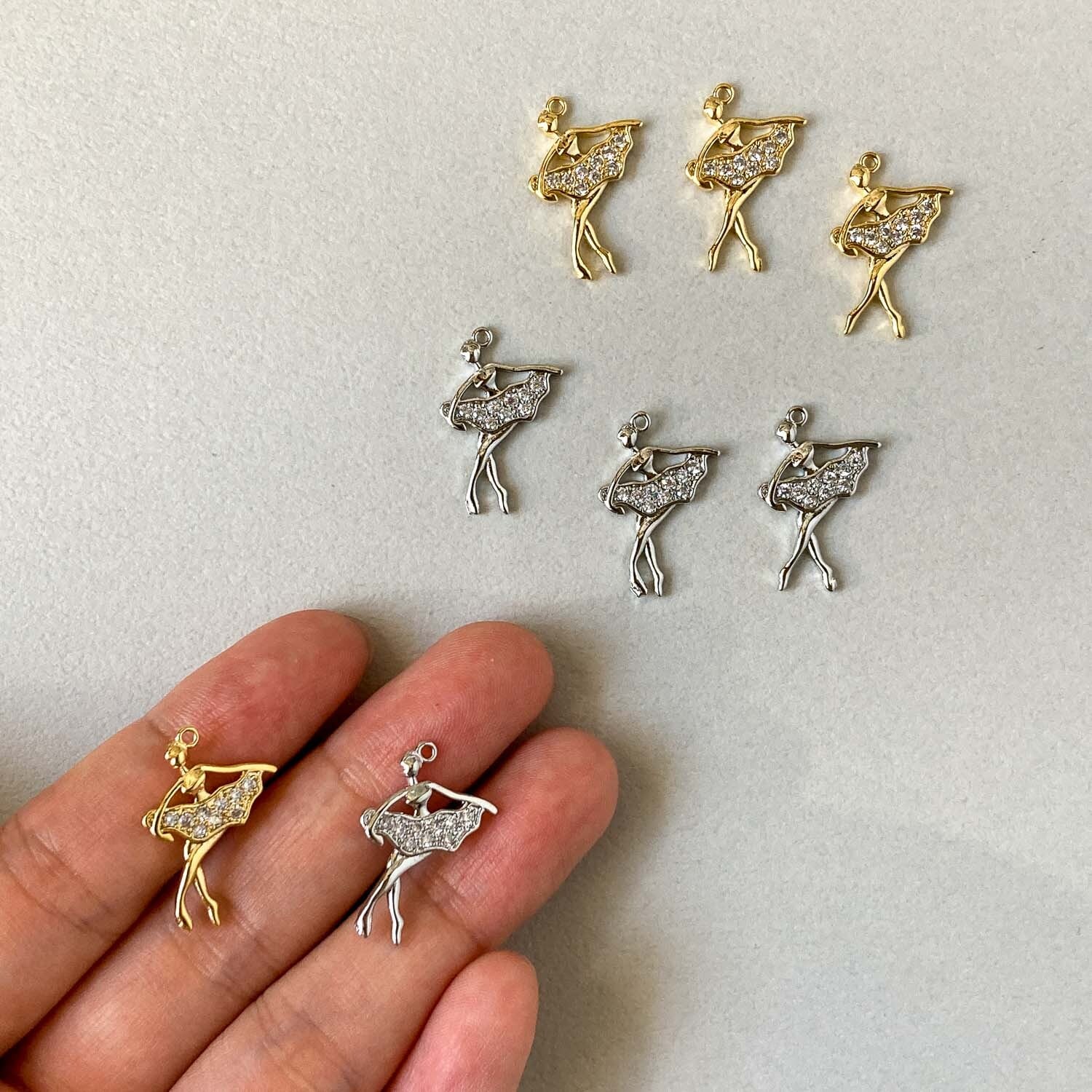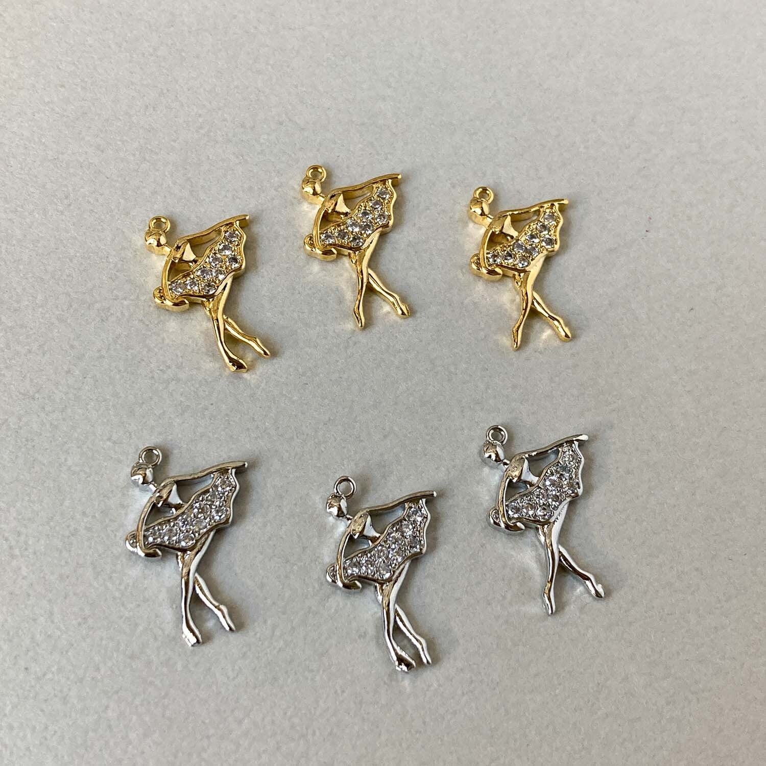 踊るバレリーナのチャーム。 揺れるたびにジルコニアがキラキラと輝きます。 ■販売単位:1個 ■種類:Aゴールド、Bシルバー ■サイズ(縦×横×厚み/奥行):約21×14×2mm ■素材:メタル(16K/プラチナメッキ)、ジルコニア ■ビジュー部分の貼り付けにズレが生じてる場合がございます。 ■素材の性質上、細かいスレ、傷がある場合がございます。 予めご了承ください。 ■商品コード:CH2510104