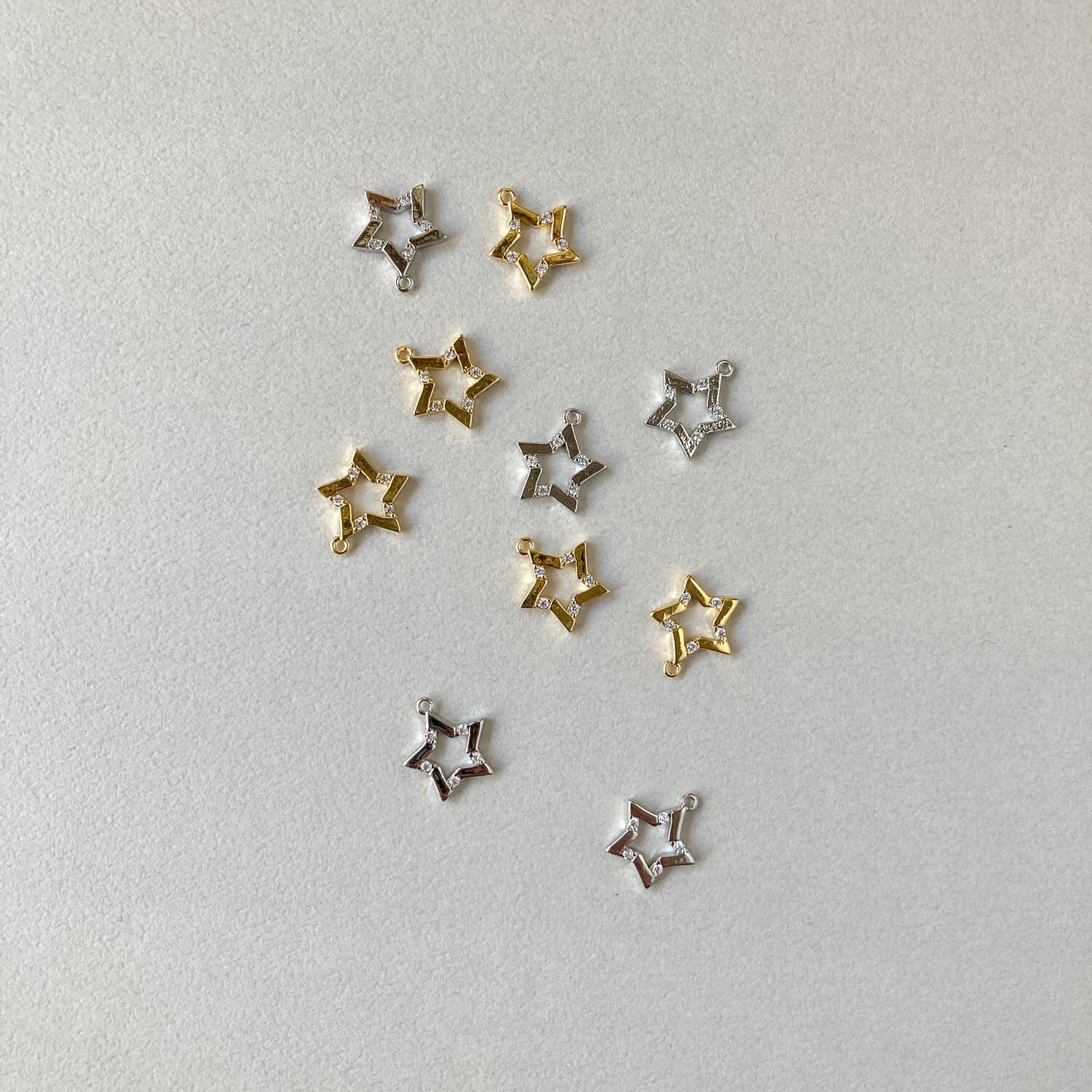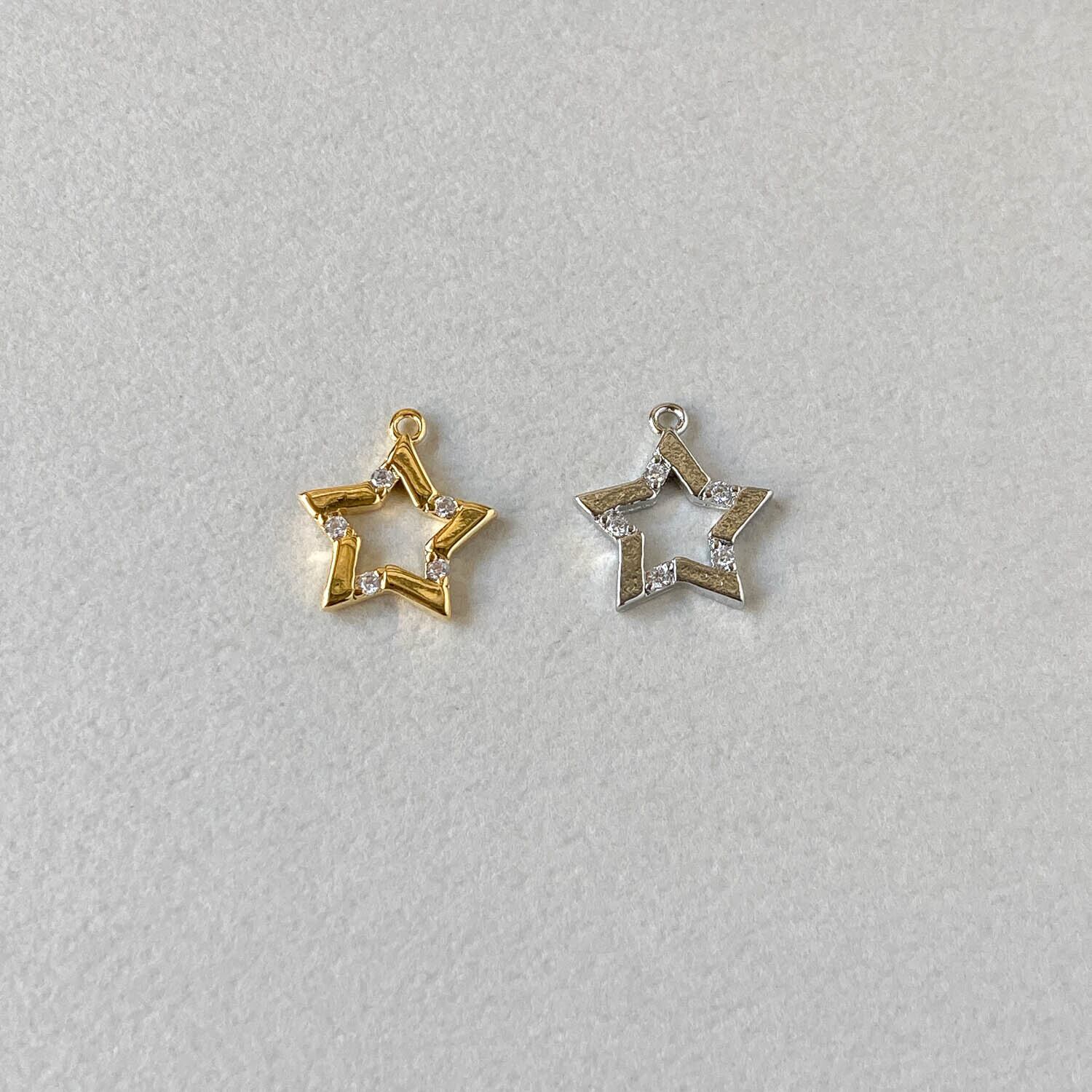 所々に散りばめられたジルコニアが綺麗な 人気の星モチーフチャーム。 ■販売単位:1個 ■種類:Aゴールド、Bシルバー ■サイズ(縦×横×厚み/奥行):約13×12×2mm ■素材:メタル(16K/プラチナメッキ)、ジルコニア ■ビジュー部分の貼り付けにズレが生じてる場合がございます。 ■素材の性質上、細かいスレ、傷がある場合がございます。 予めご了承ください。 ■商品コード:CH2510118