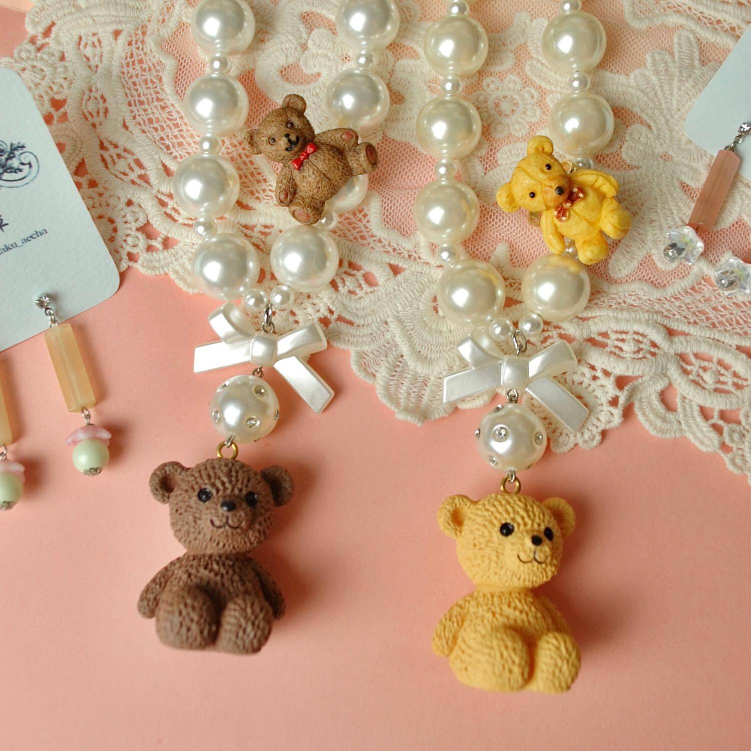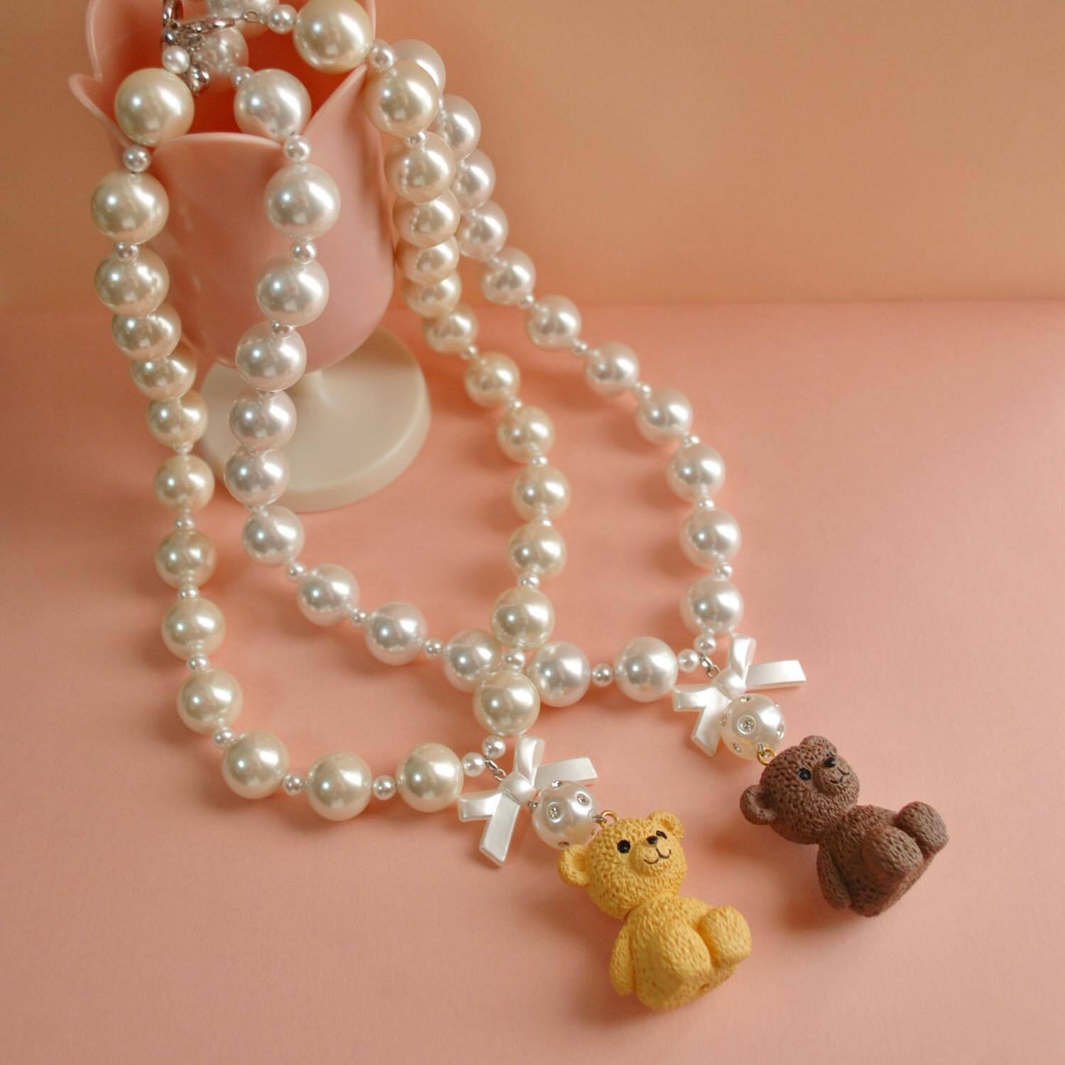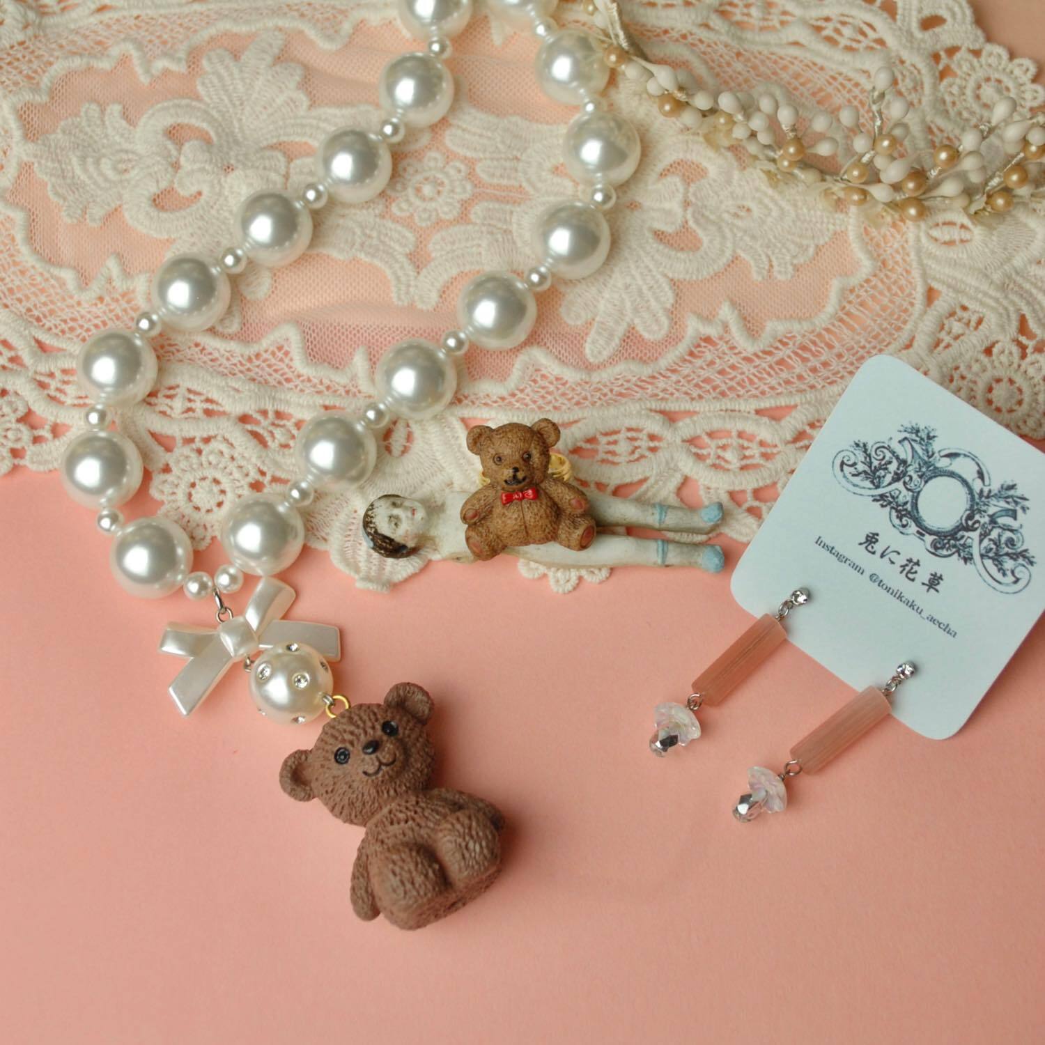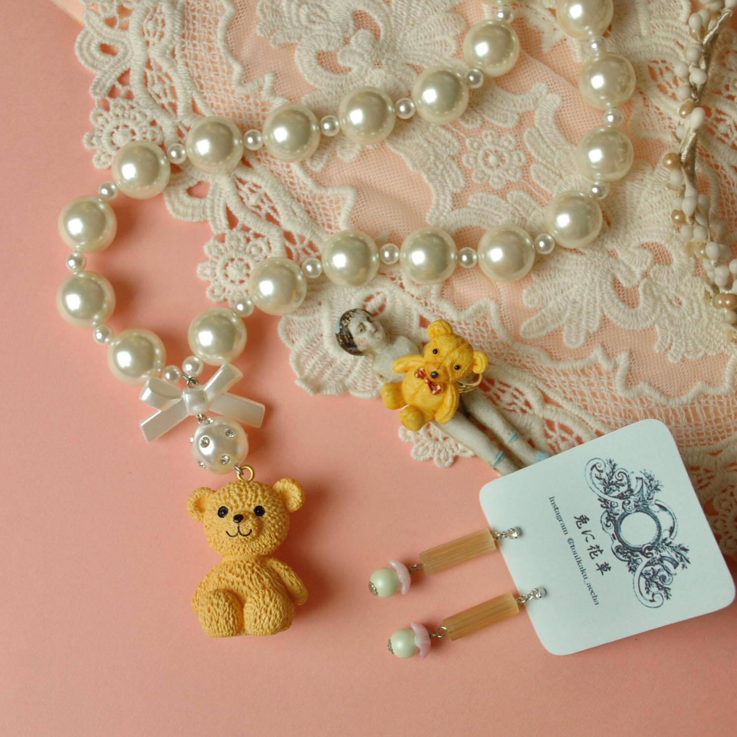 愛らしいテディベアをモチーフにしたパールネックレスとリング、