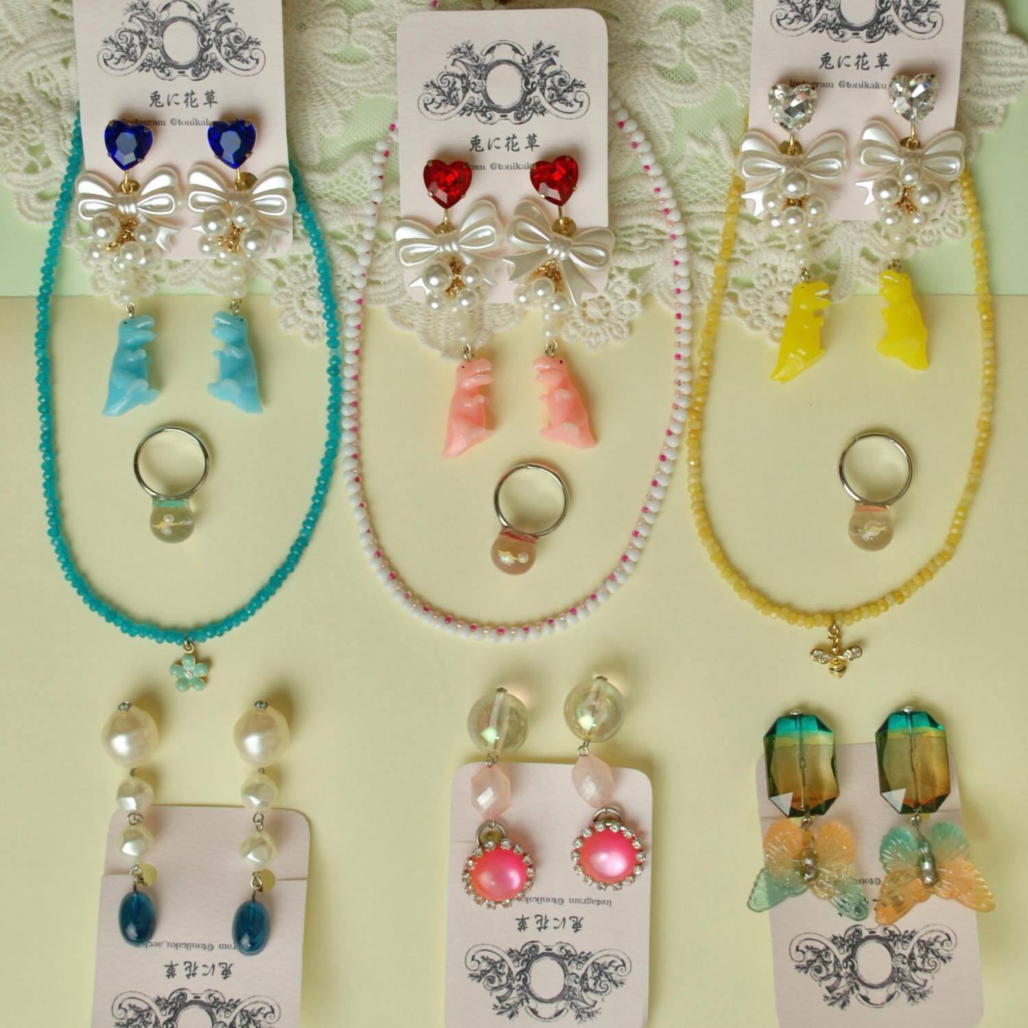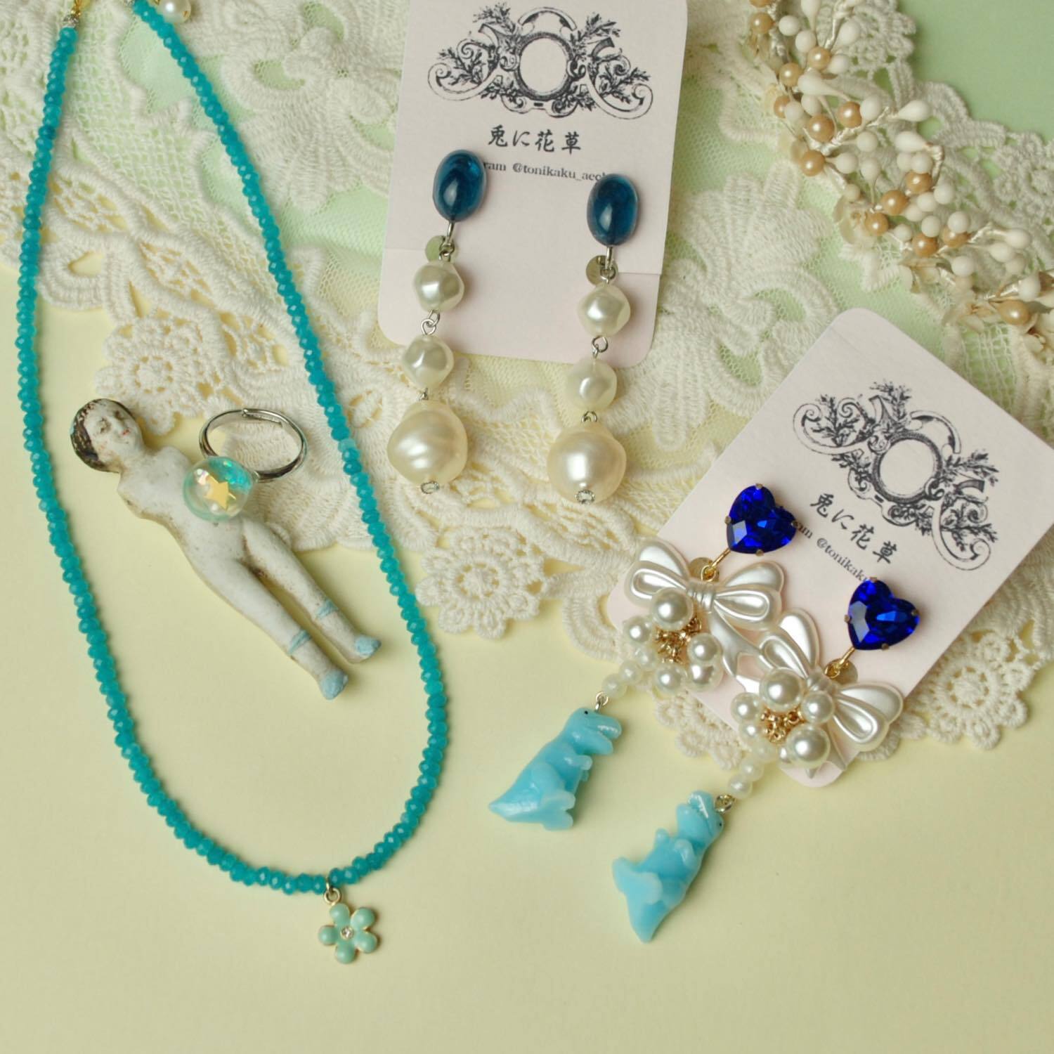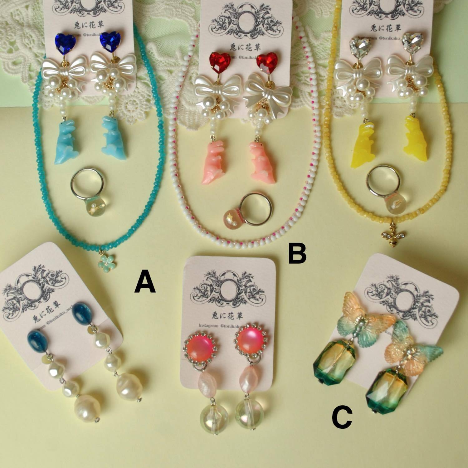 イヤリング2点、ネックレス1点、リング1点がセットになった、