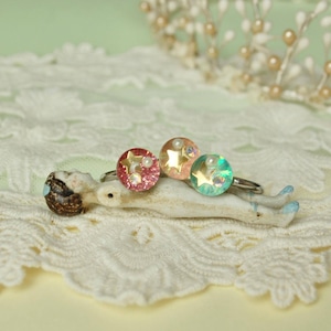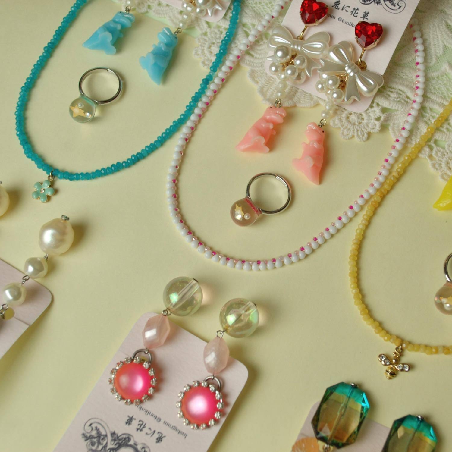 小さな恐竜の耳飾りにきらめく星を閉じ込めたリングなど遊び心あふれるアクセサリー。