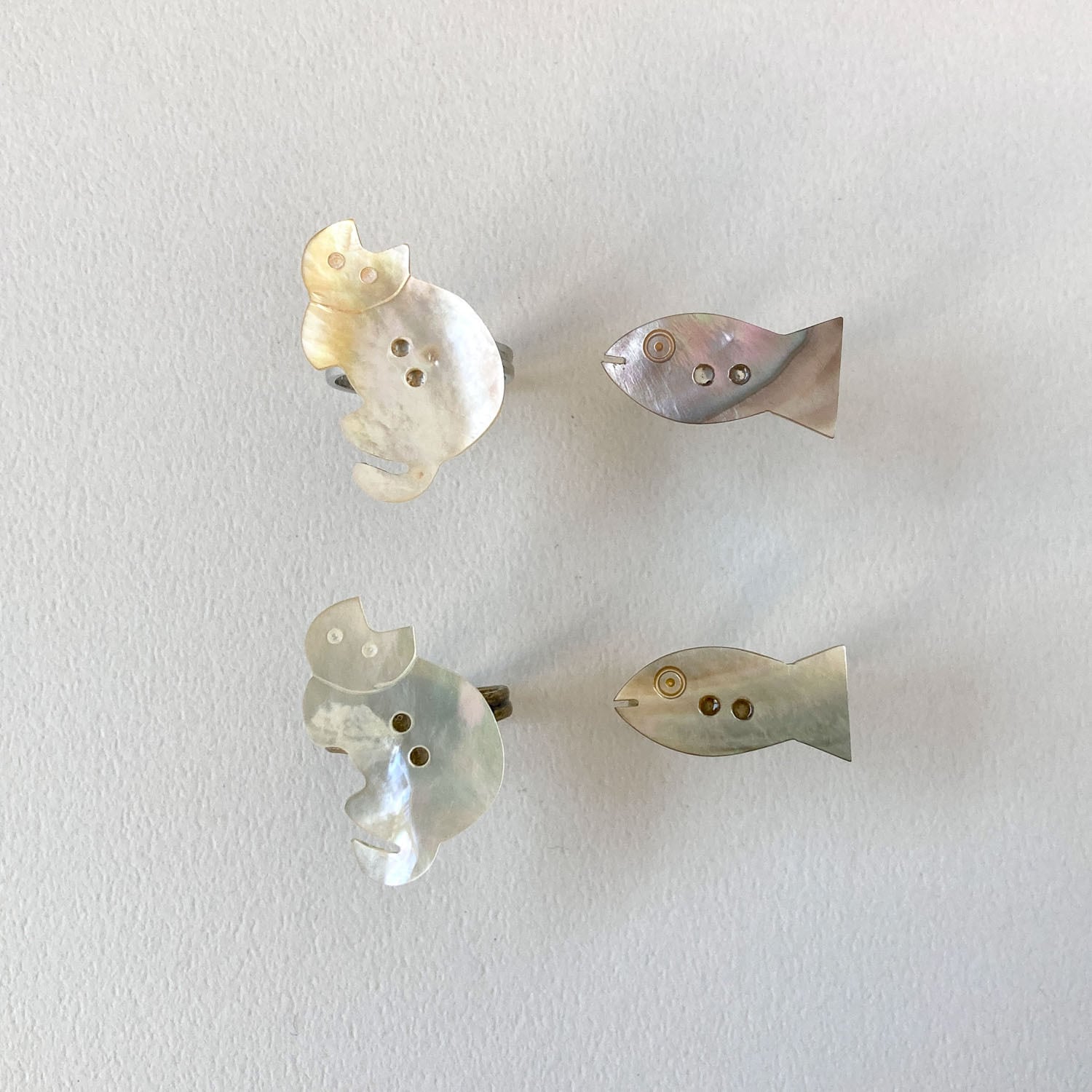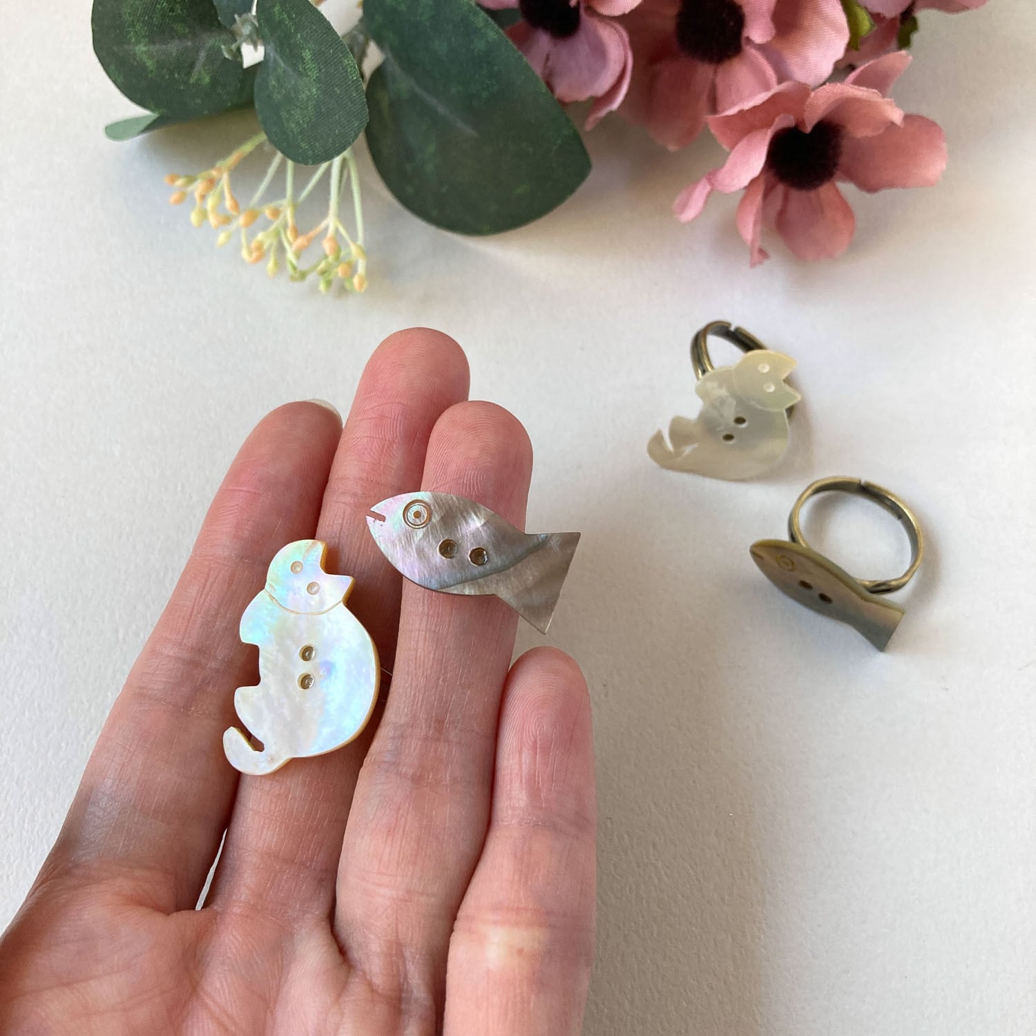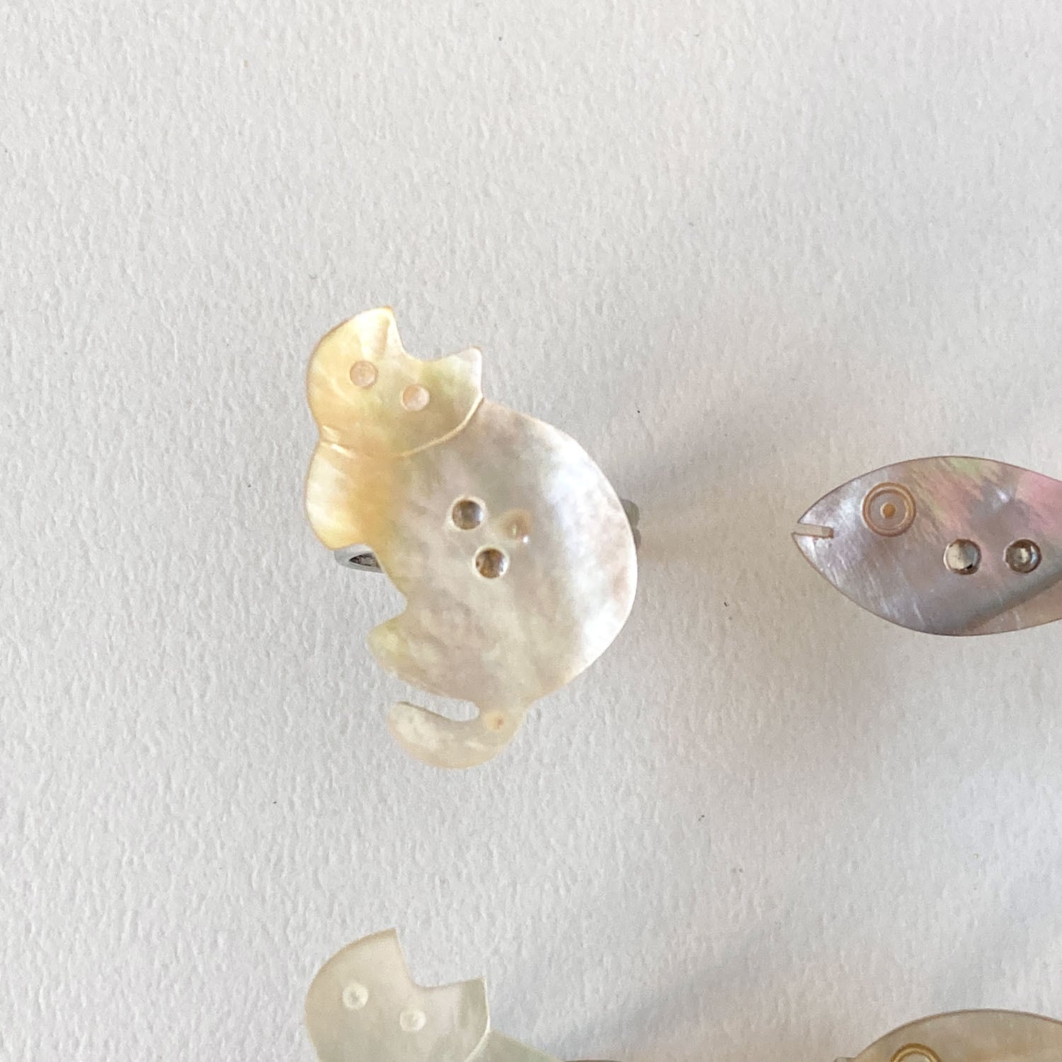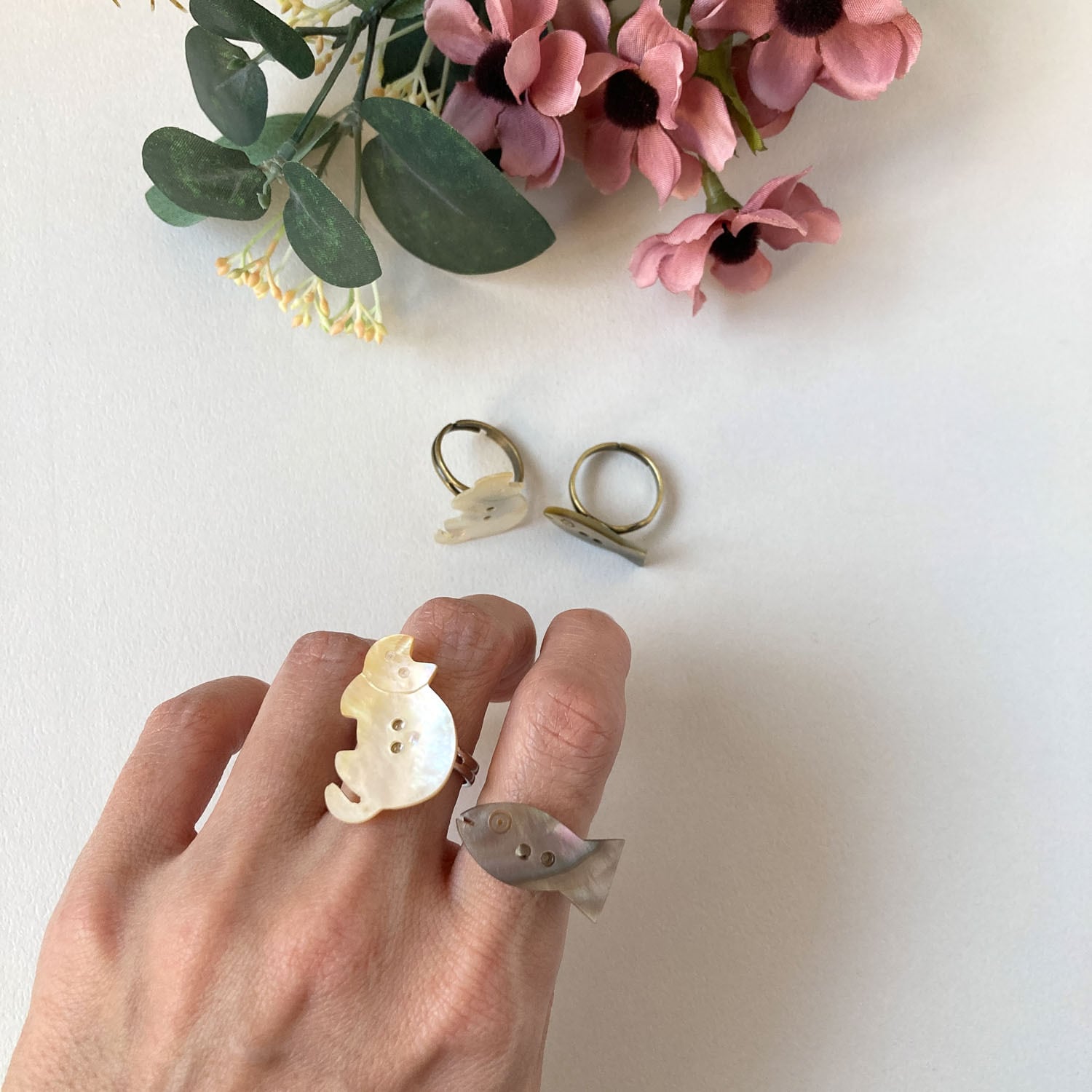 可愛らしい猫と魚のシェルボタンをリングに仕立てました。