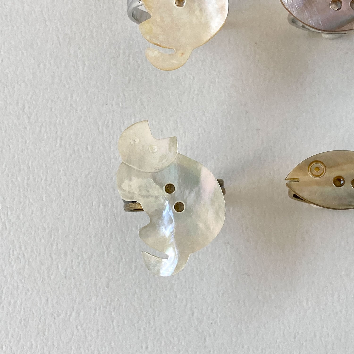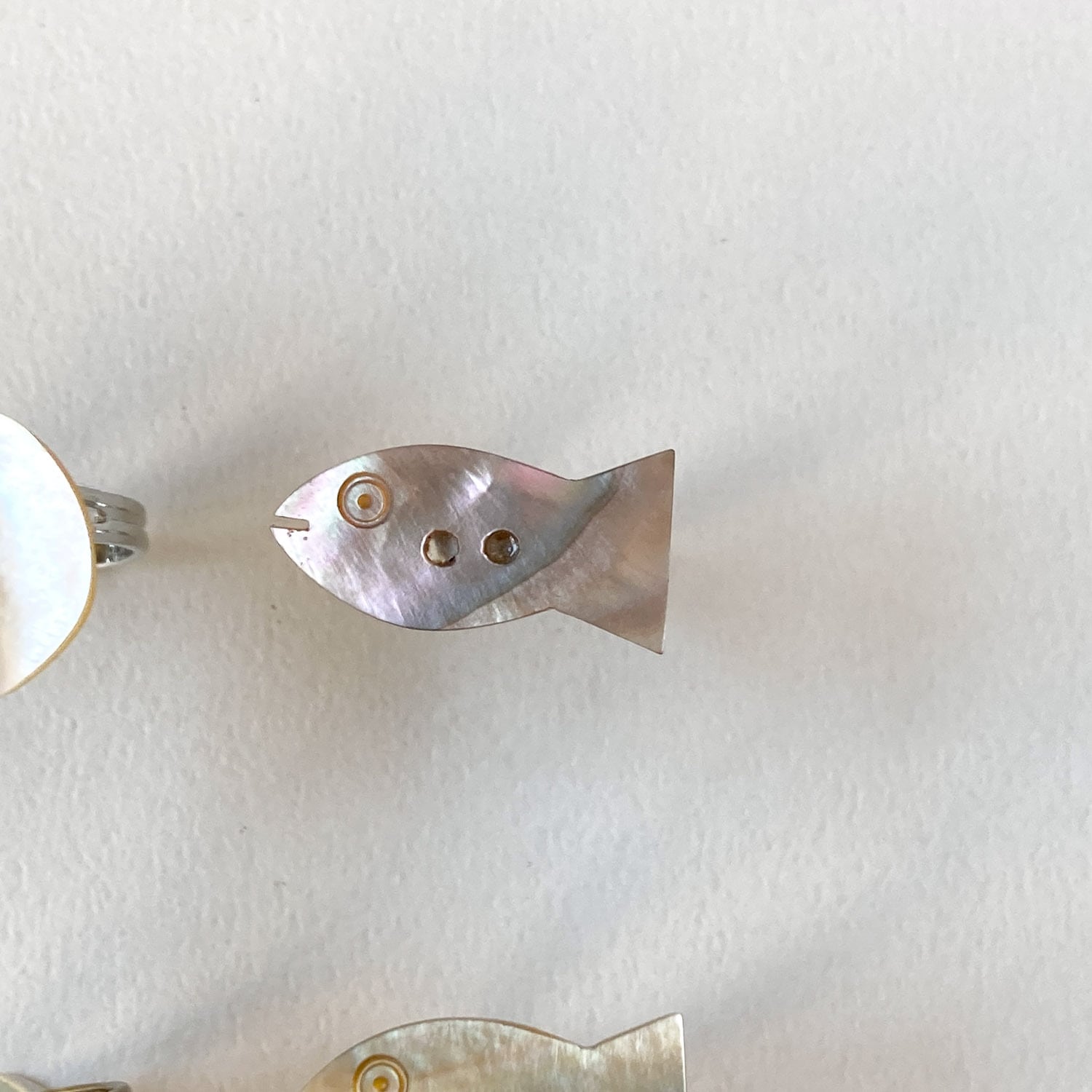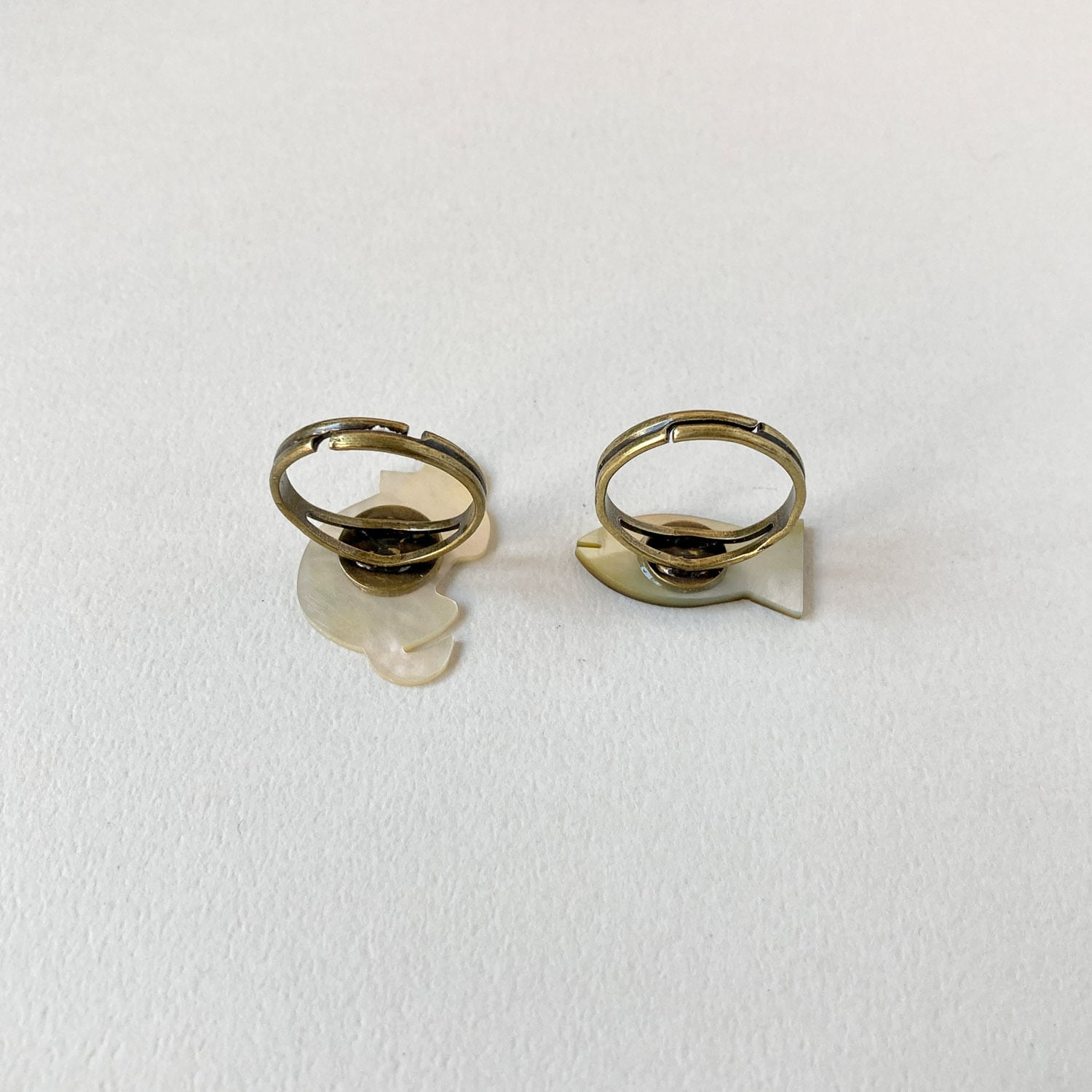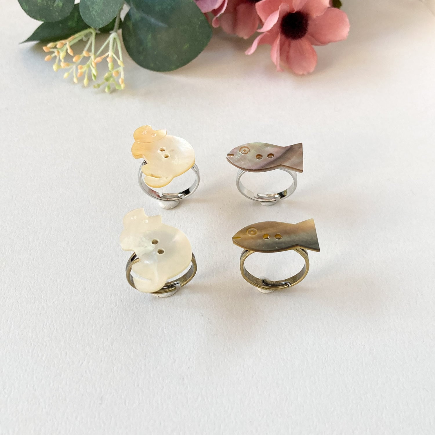 可愛らしい猫と魚のシェルボタンをリングに仕立てました。