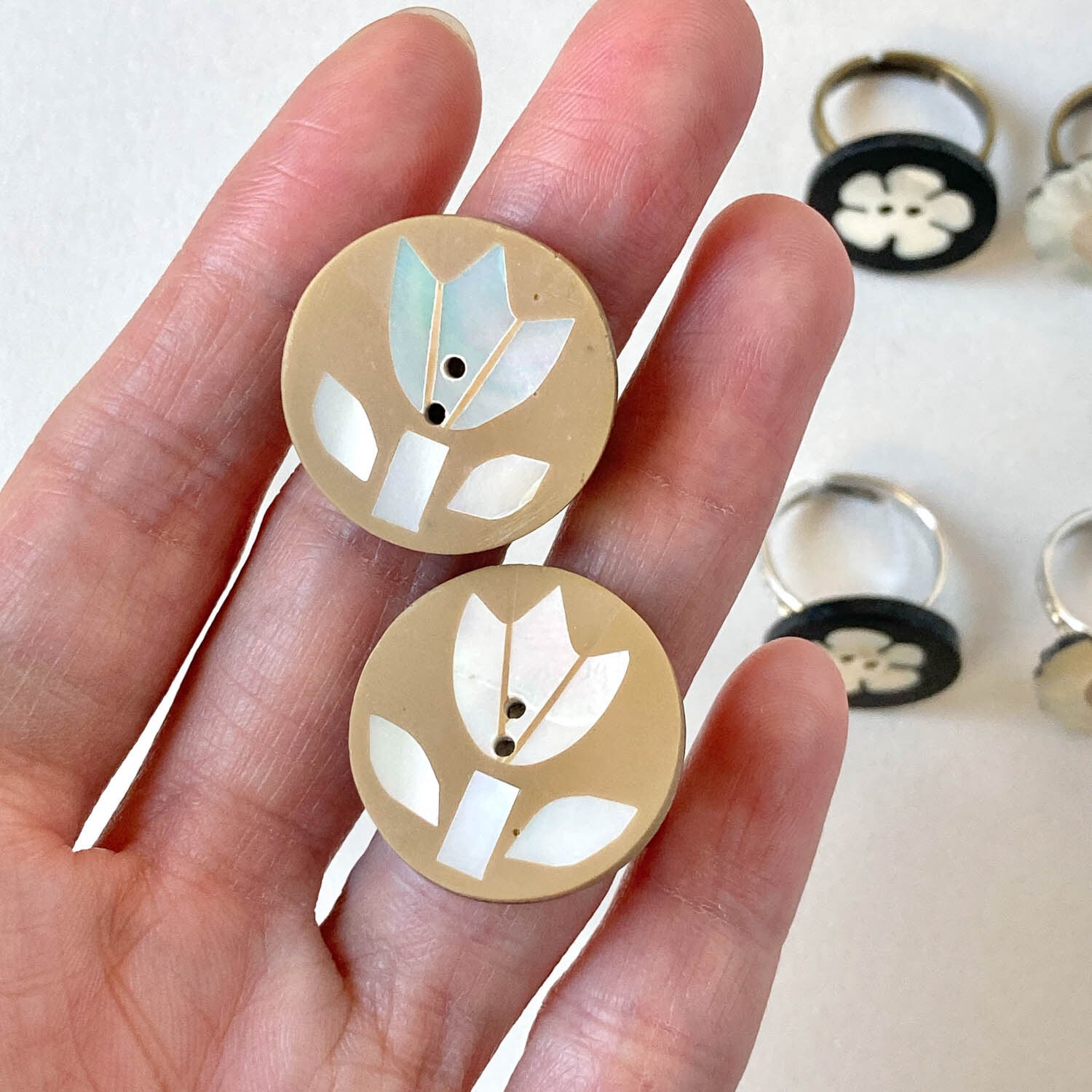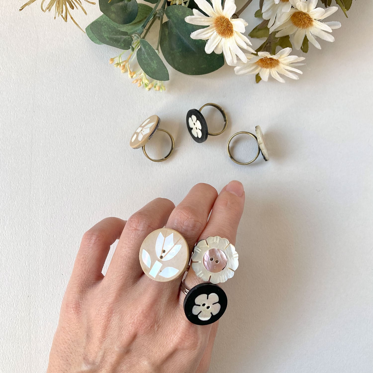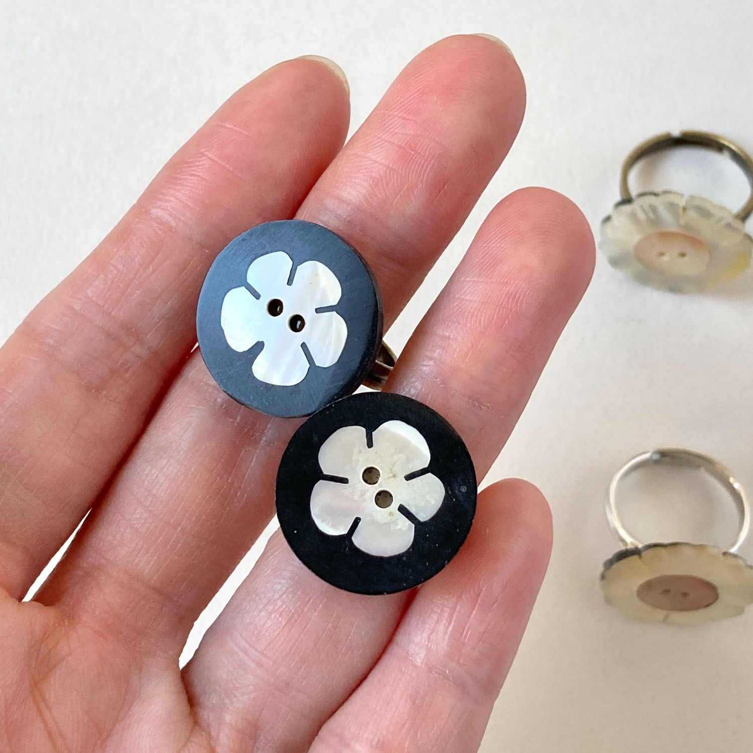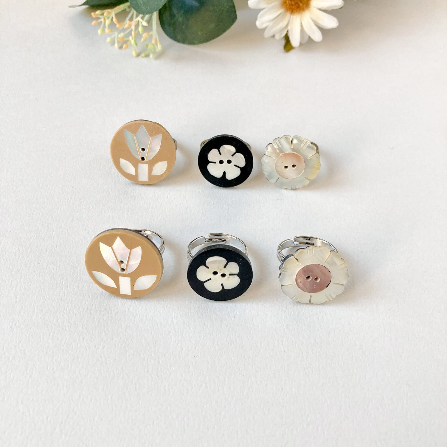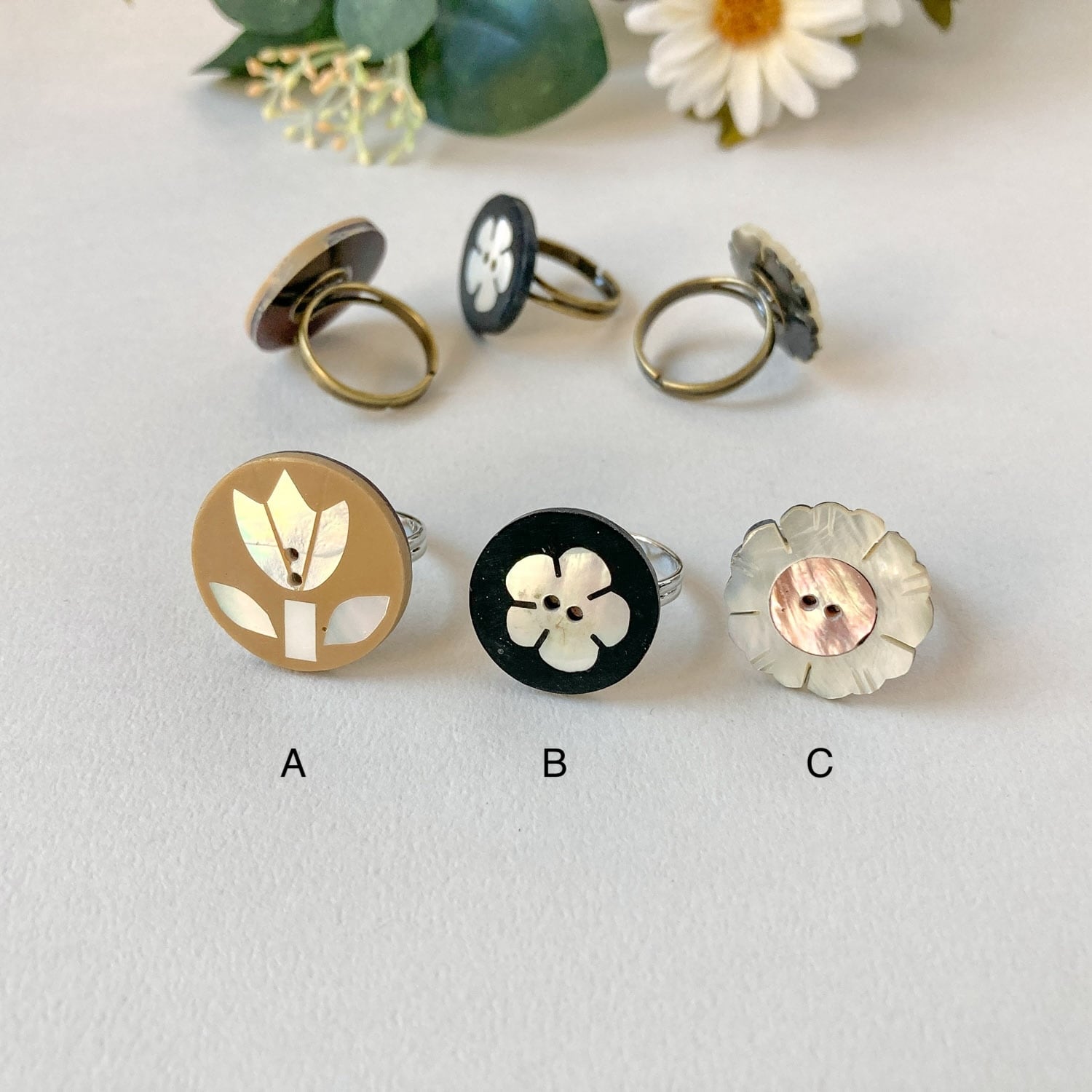 フラワーモチーフのシェルボタンをリングに仕立てました。