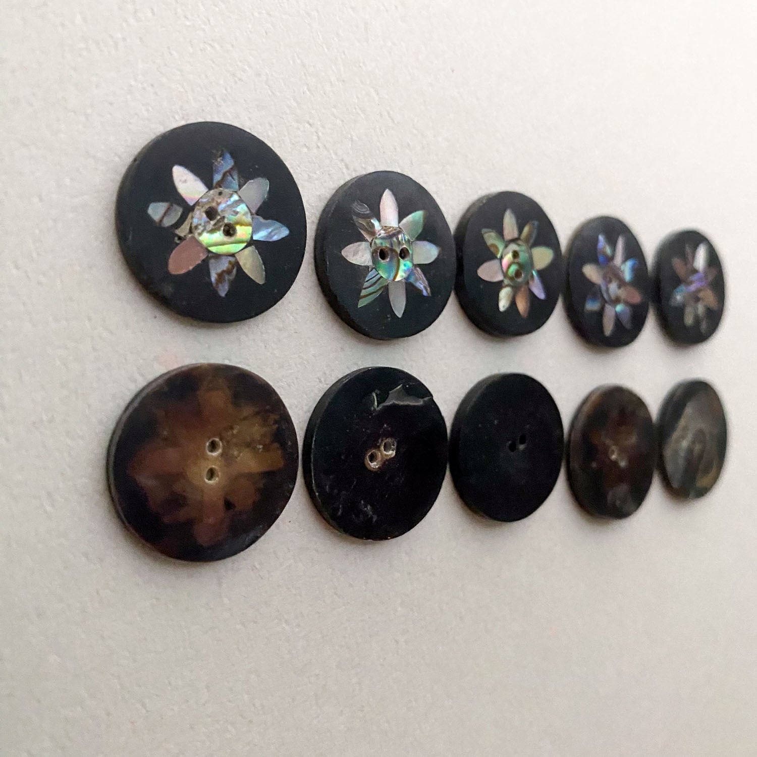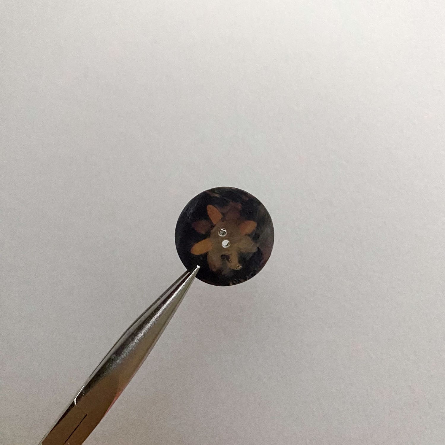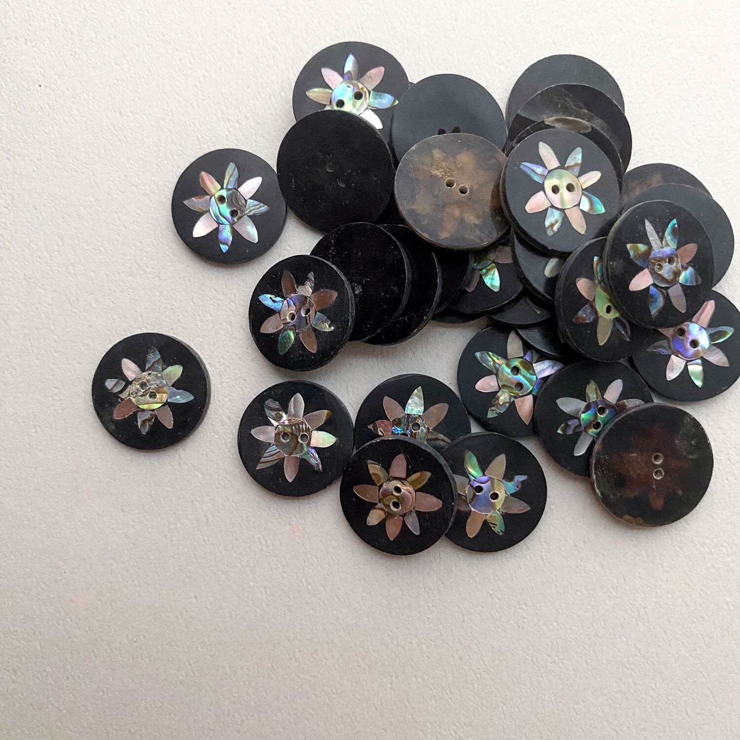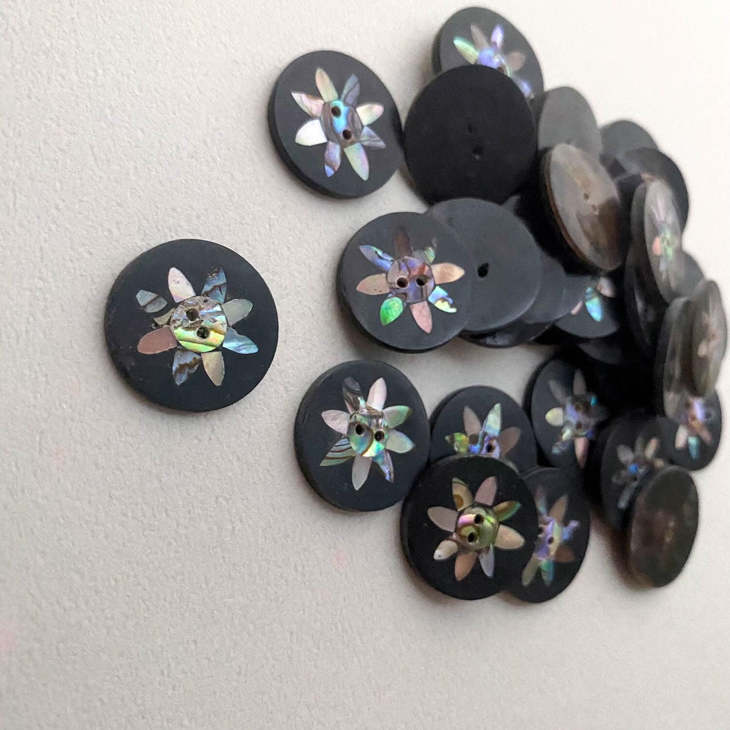 オーロラの偏光カラーが美しいシェルのボタン。