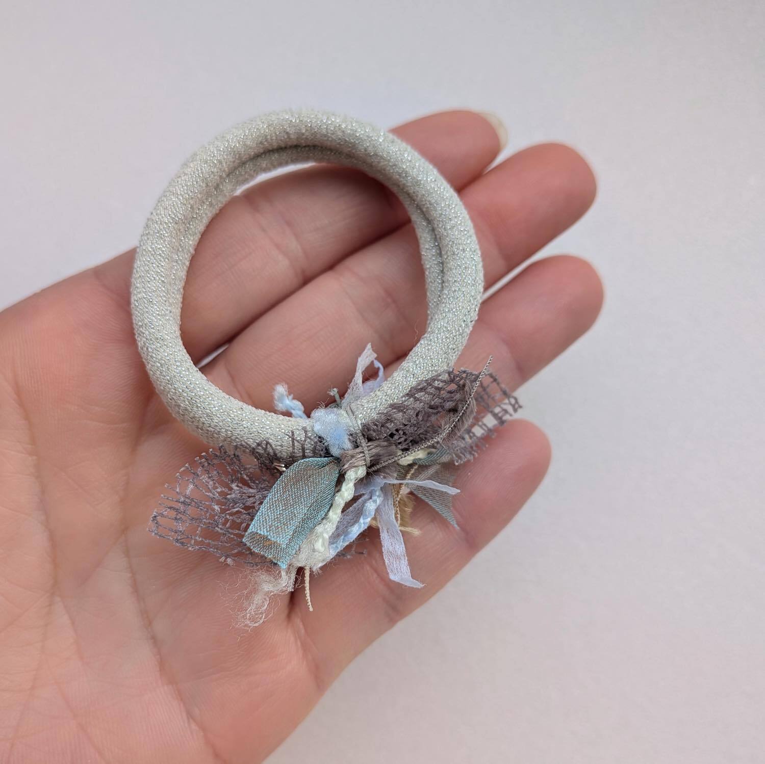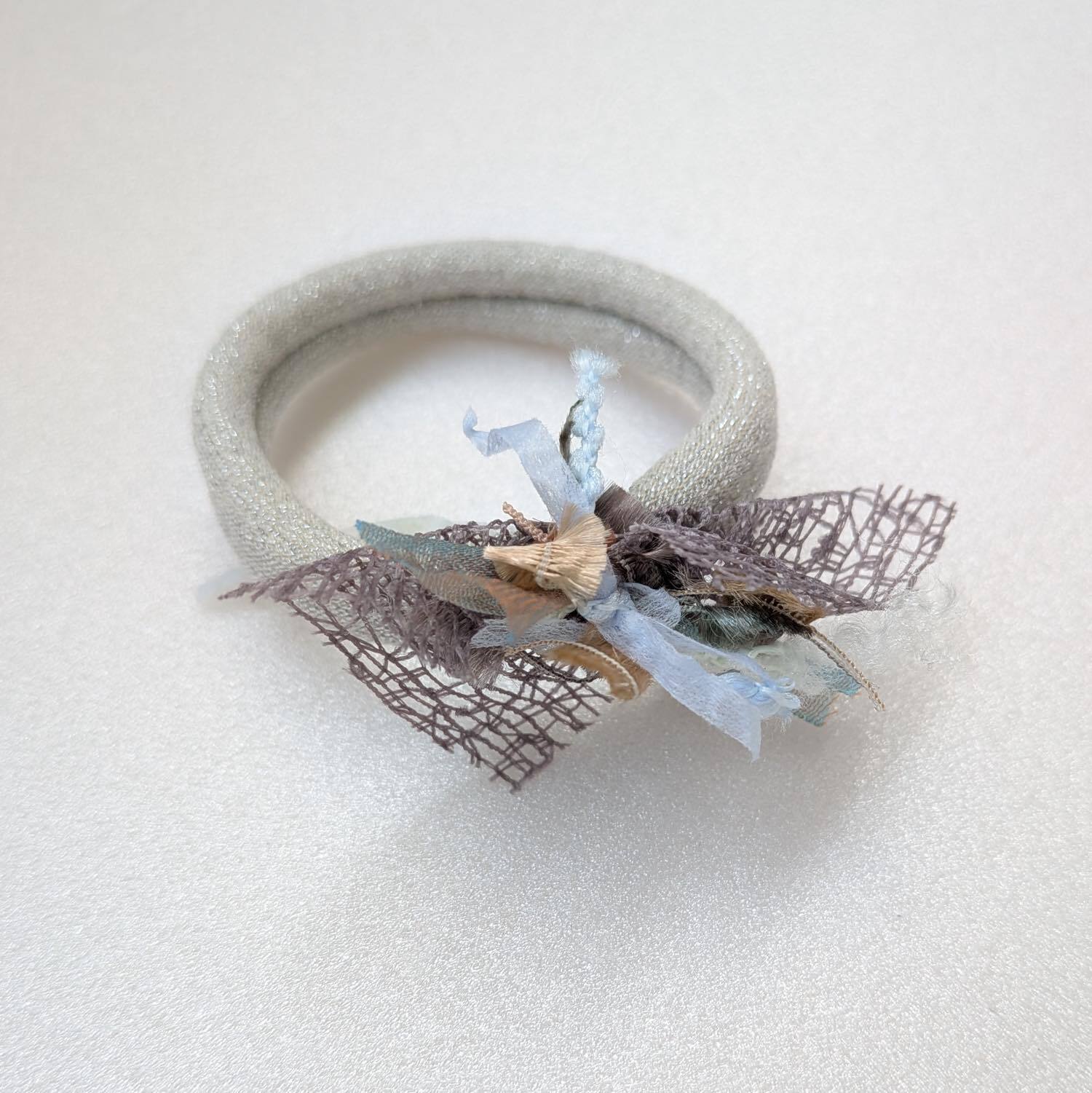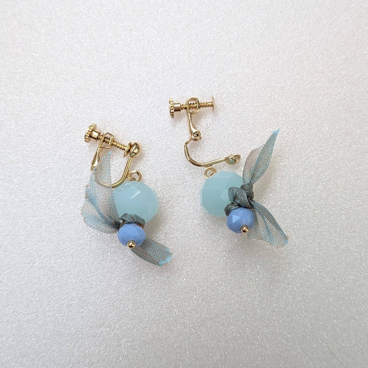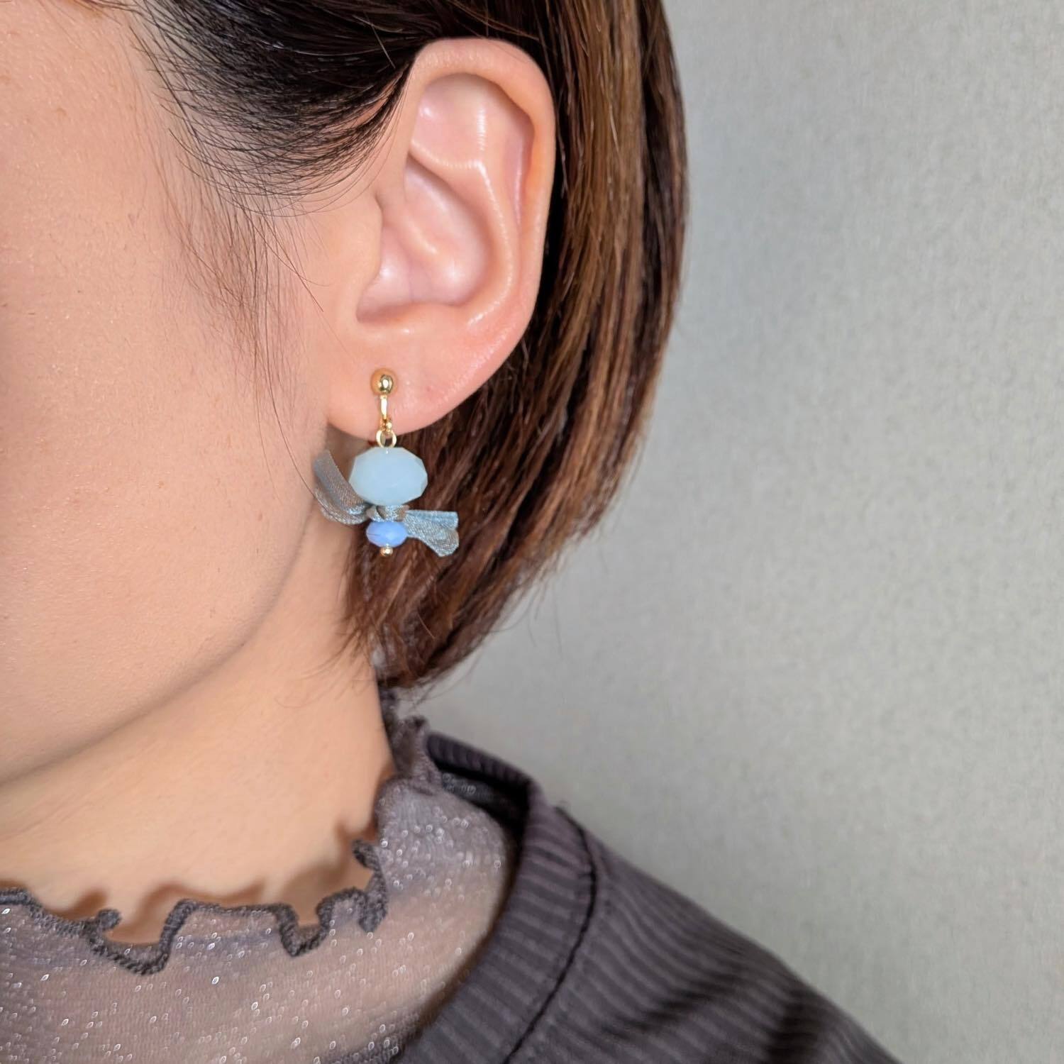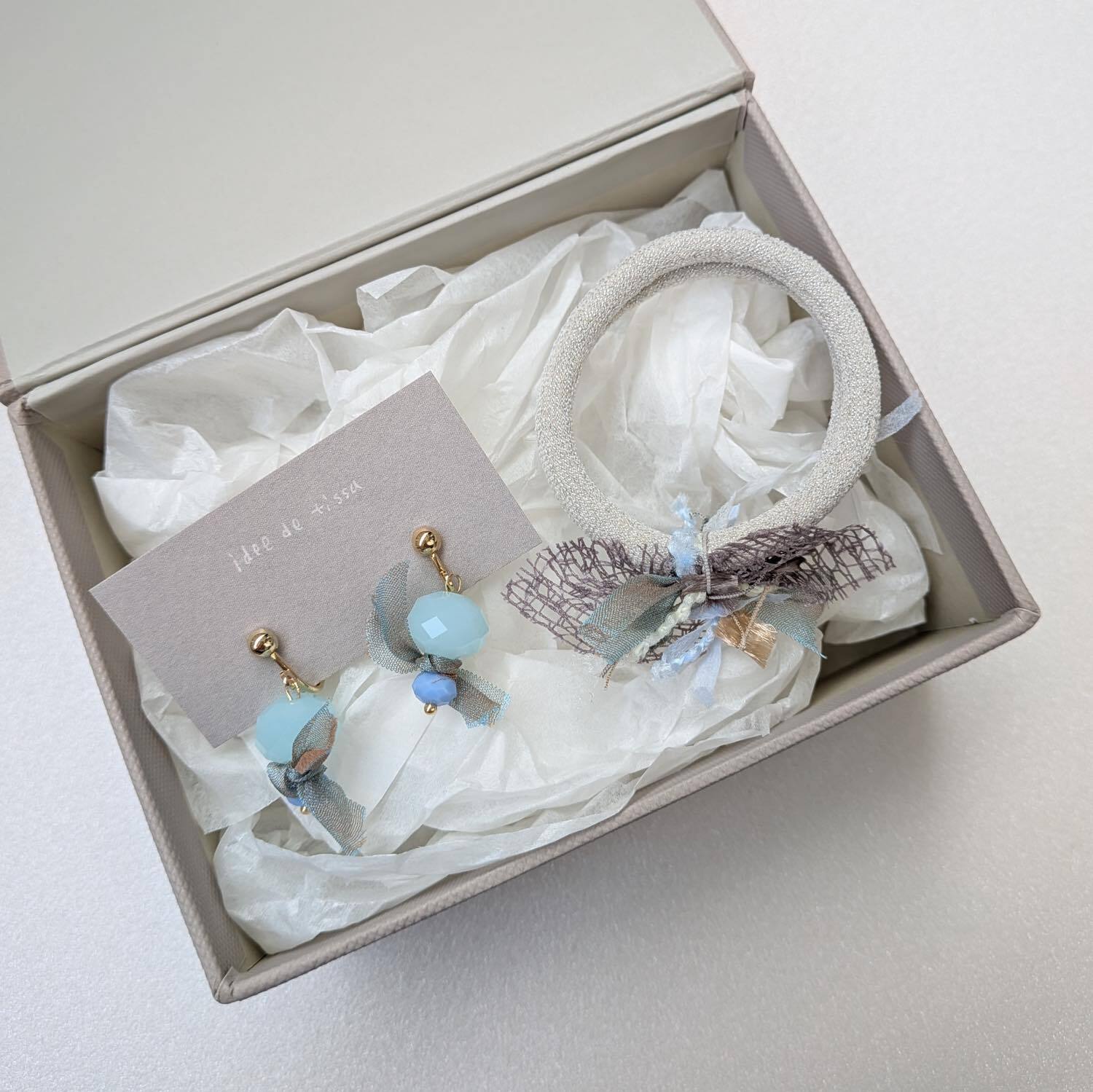 コロンとしたブルーのビーズにリボンが踊る耳飾りとシックカラーのヘアゴム。