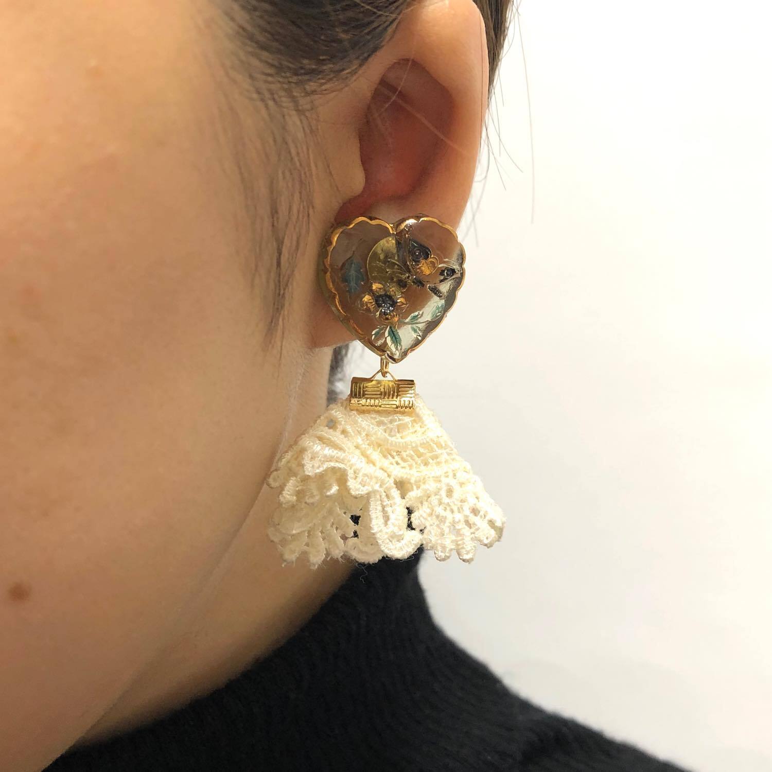 クリアハートガラスカボションとレースタッセルの〈ピアス/イヤリング〉