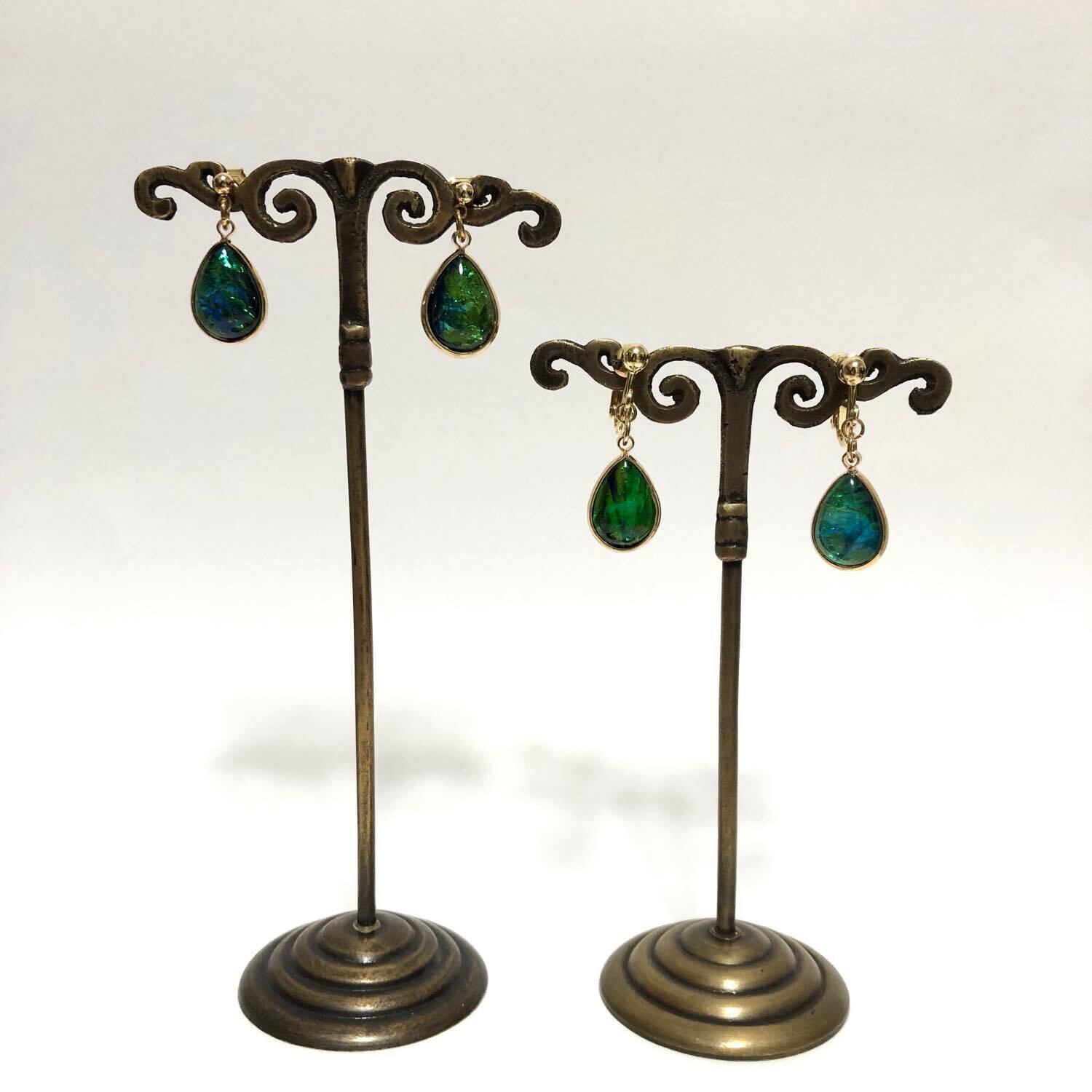 落ち着いた色味の角度による変化が神秘的な耳飾りです。