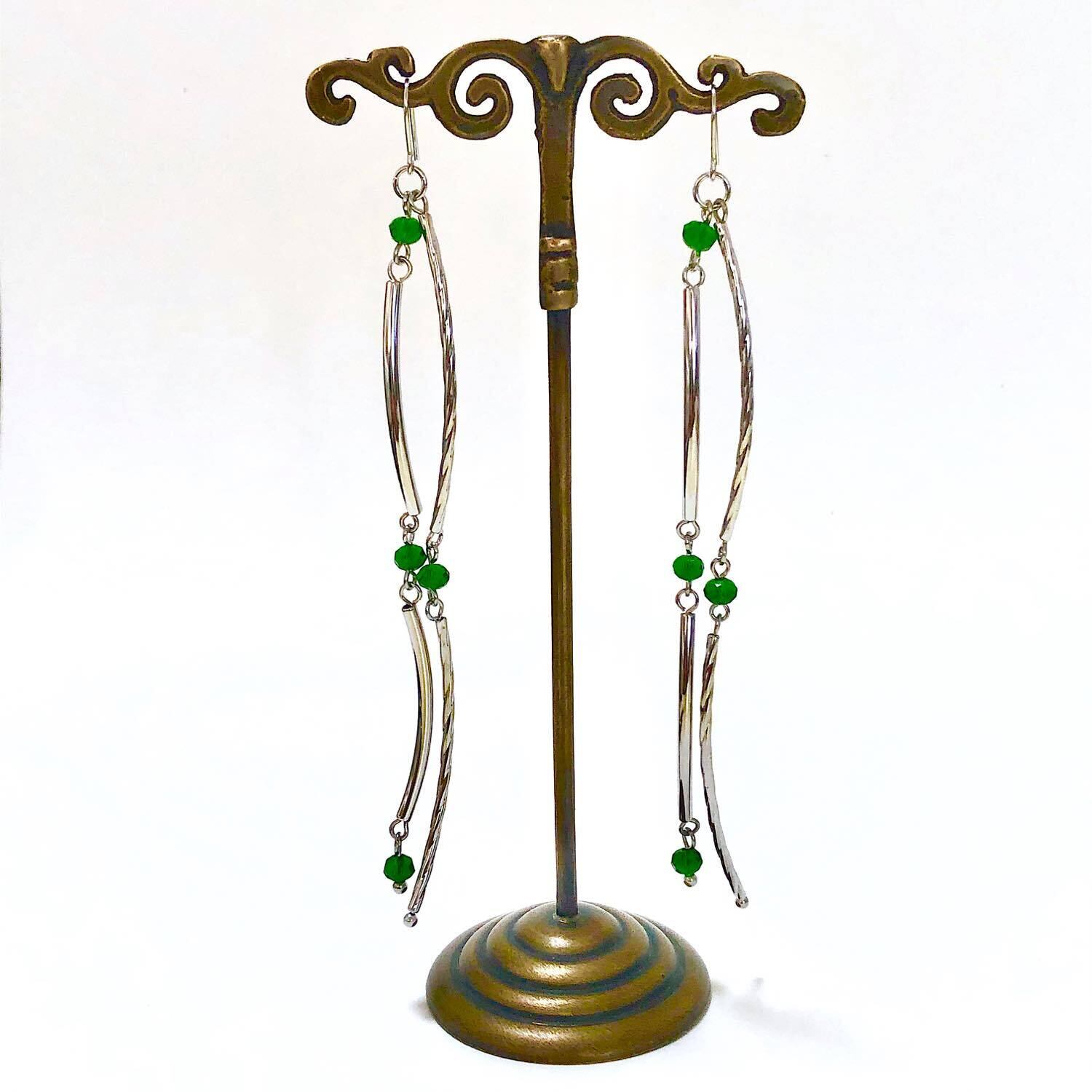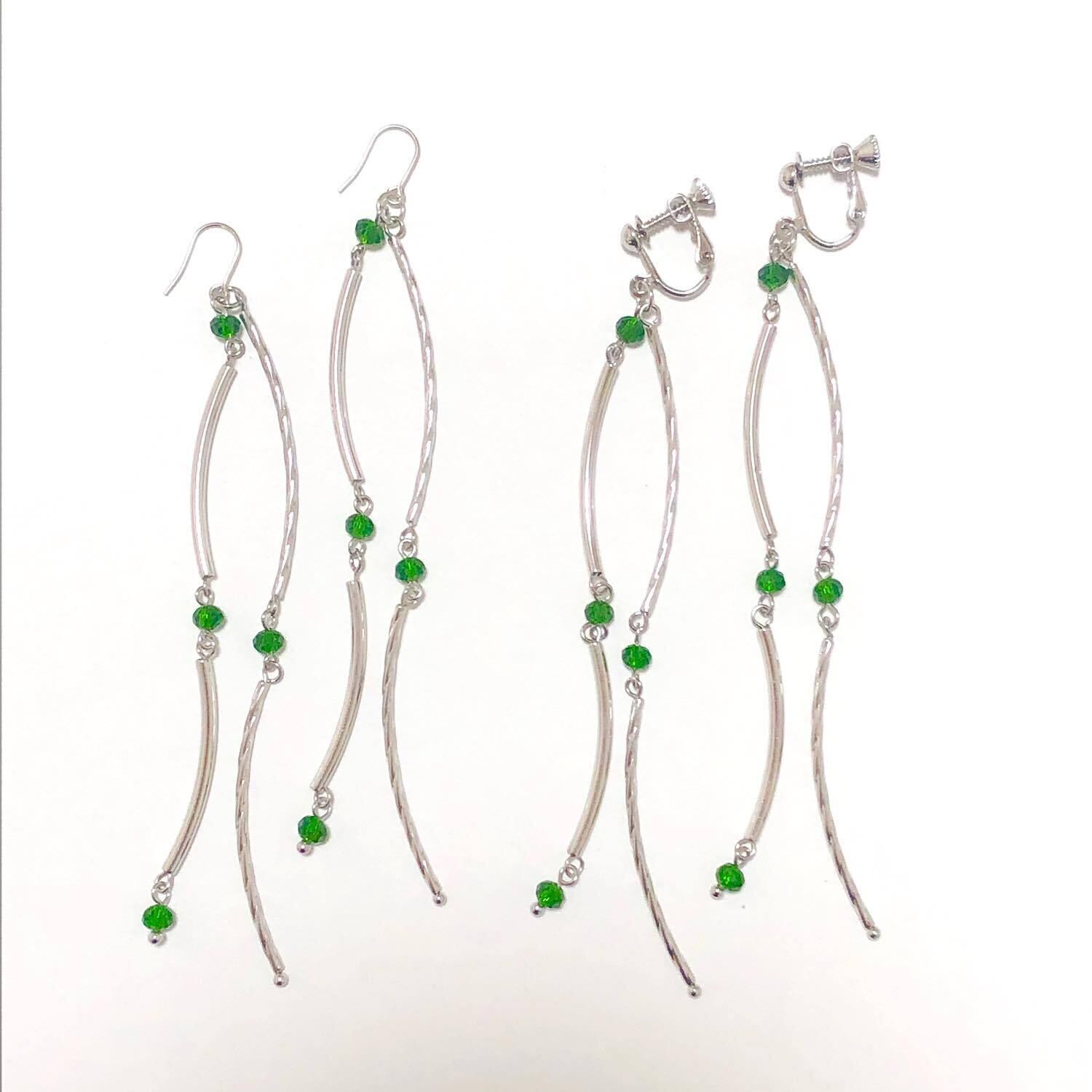 シルバーのパイプパーツに配置したグリーンのビーズがアクセントの耳飾り。