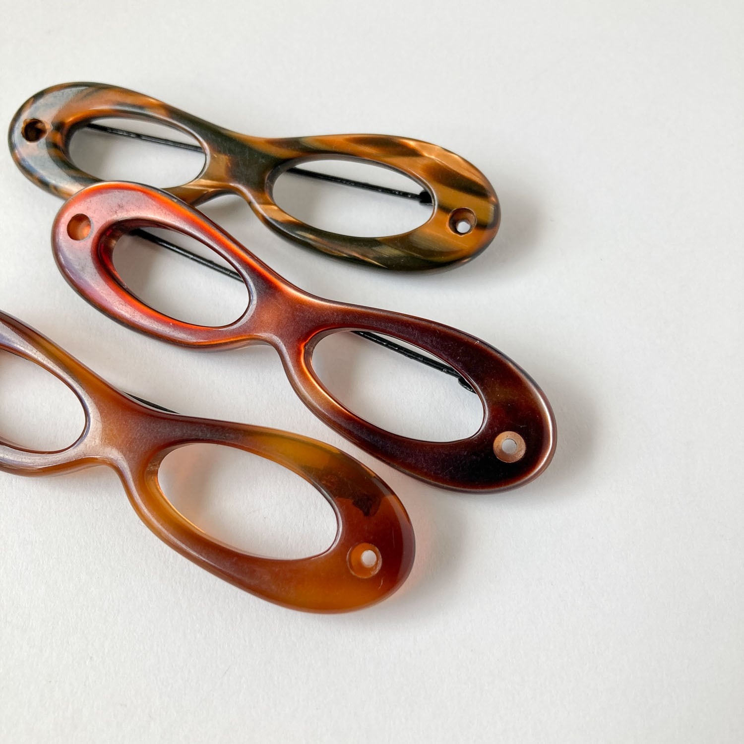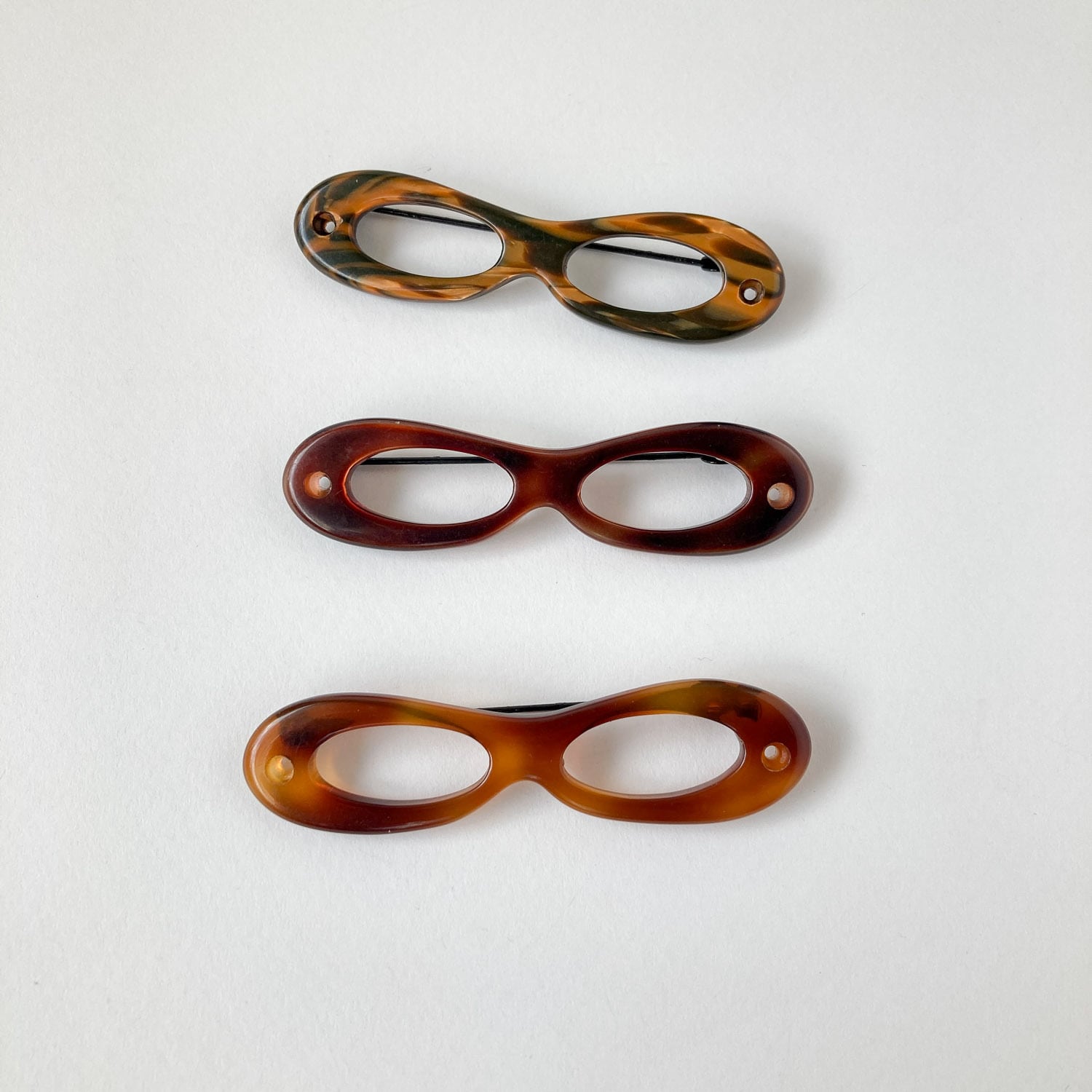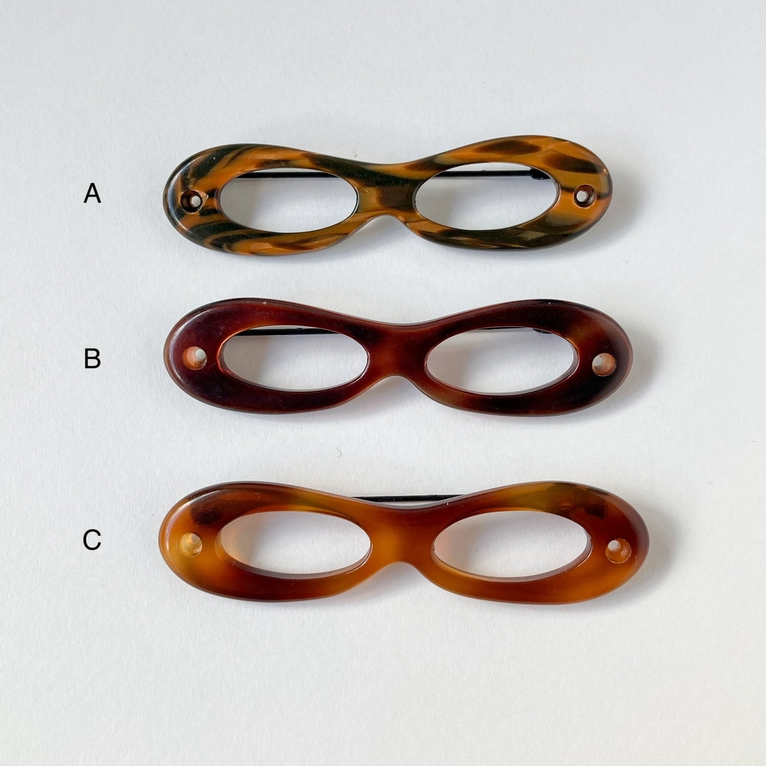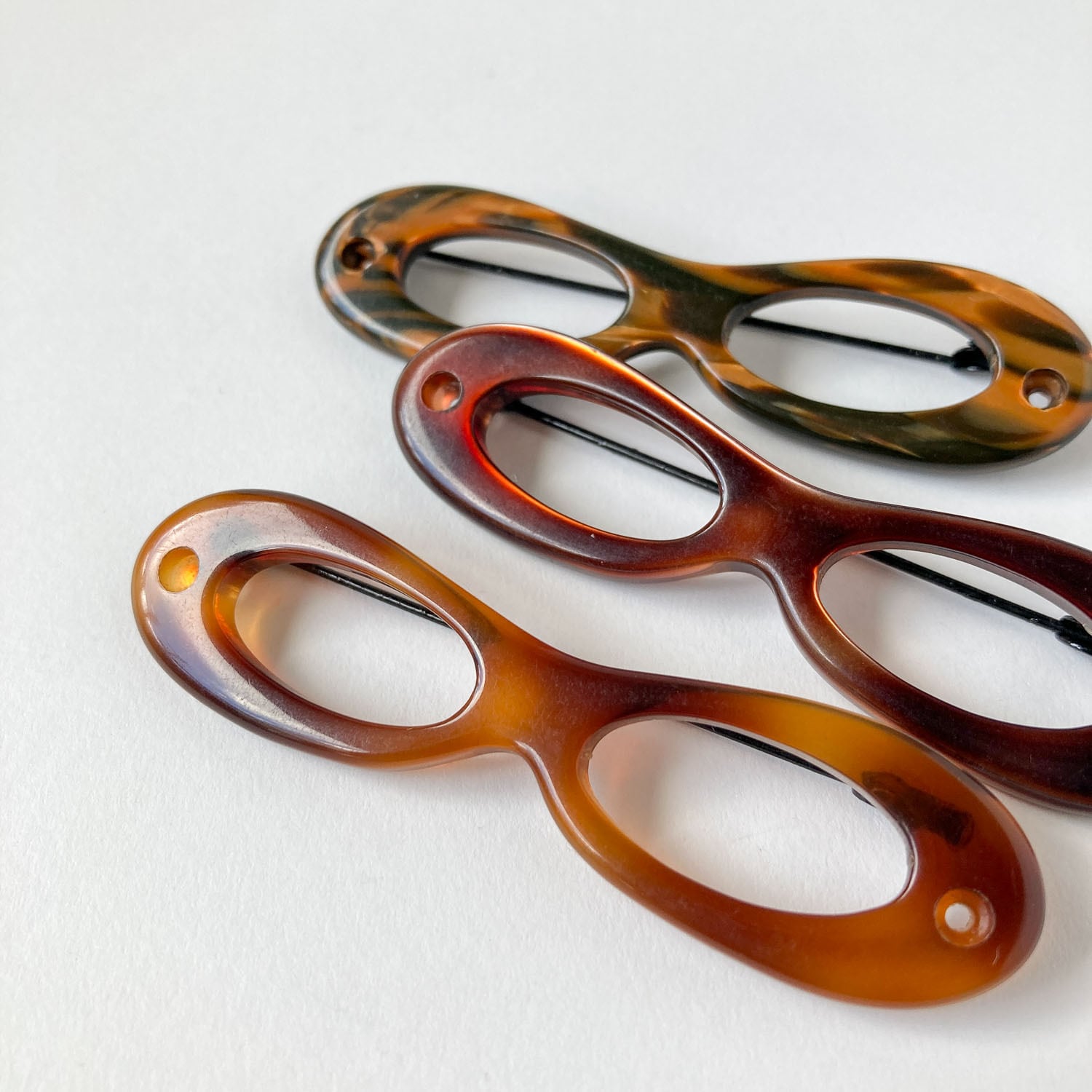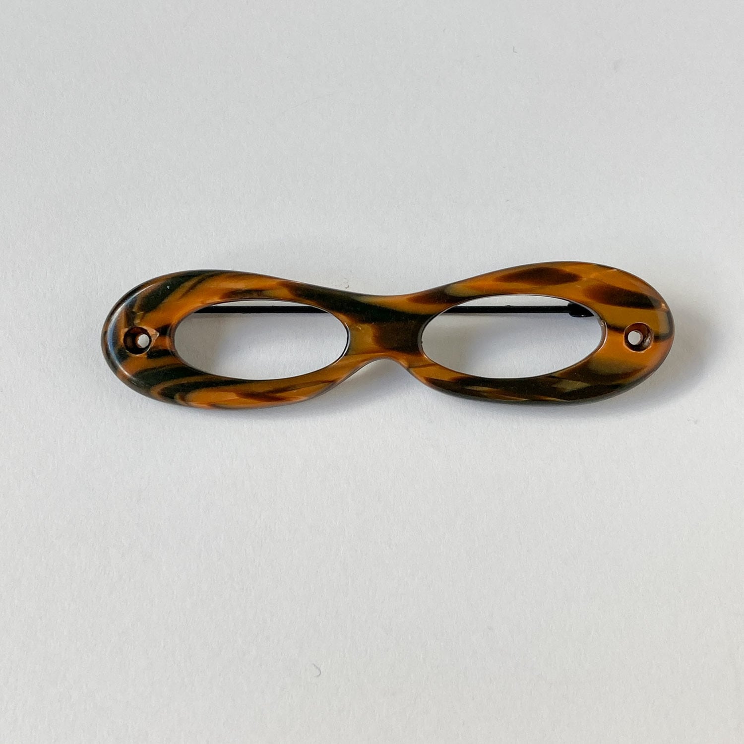 メガネのようなモチーフがおしゃれな、べっ甲風カラーのブローチ。
