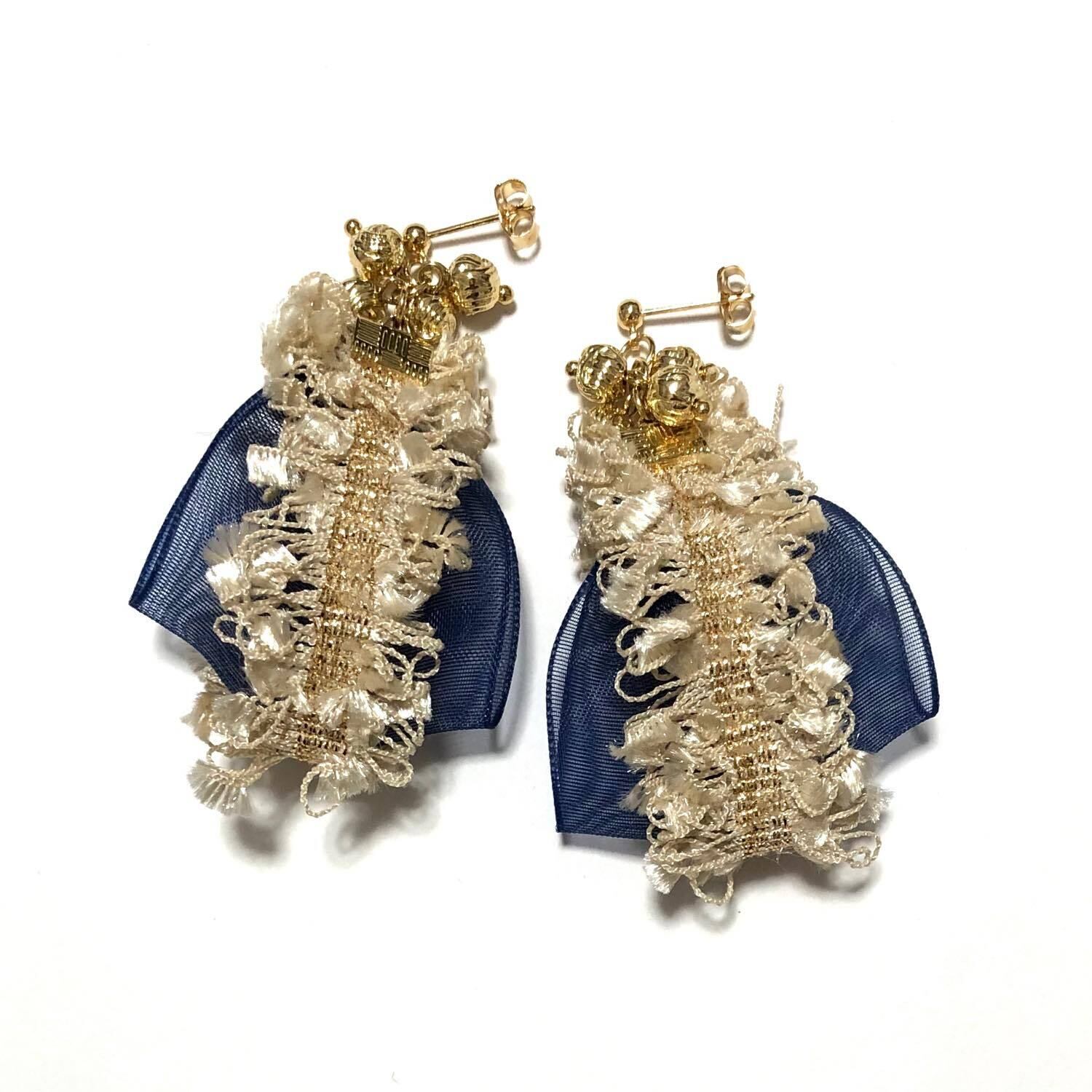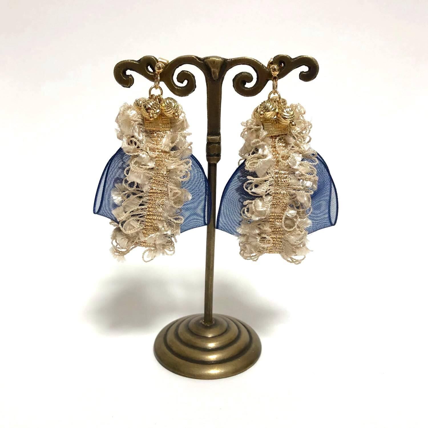 ふわふわフリンジとネイビーオーガンジーリボンのピアス