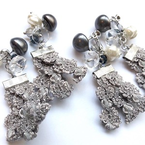 グレーのレースを3重に重ねたタッセルに じゃらじゃらとビーズを組み合わせた耳飾りです◎ ピアスはキャッチにぶら下がり部分が付いています。 ◾︎サイズ:P55×30 / E63×30mm ◾︎金具:メッキ ◾︎一部個体差のあるパーツを使用しております。 ◾︎ピアス・イヤリングのご交換はいたしかねます。 予めご了承くださいませ。 ◾︎商品コード:SAC2005052