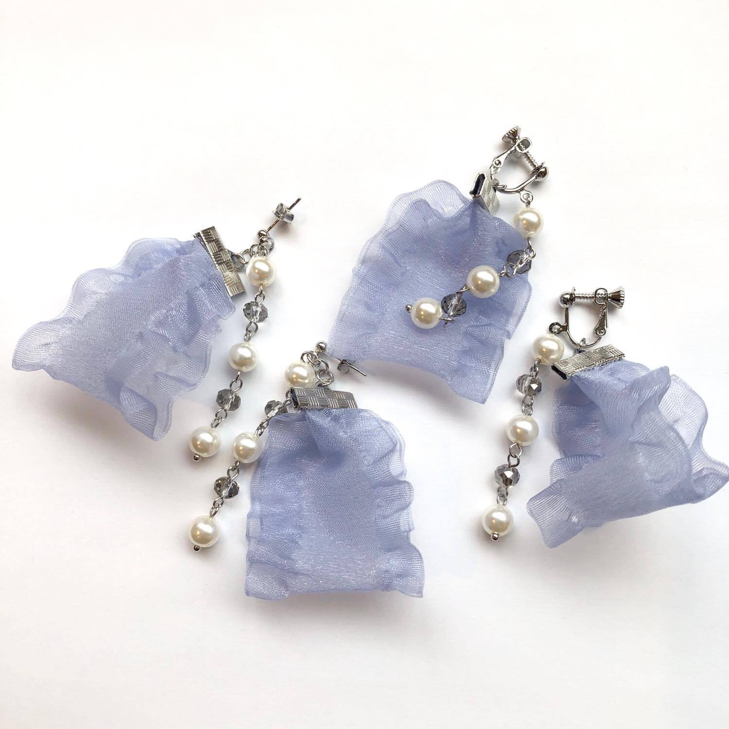 パールとフリルリボンが可愛いガーリーな耳飾り。
