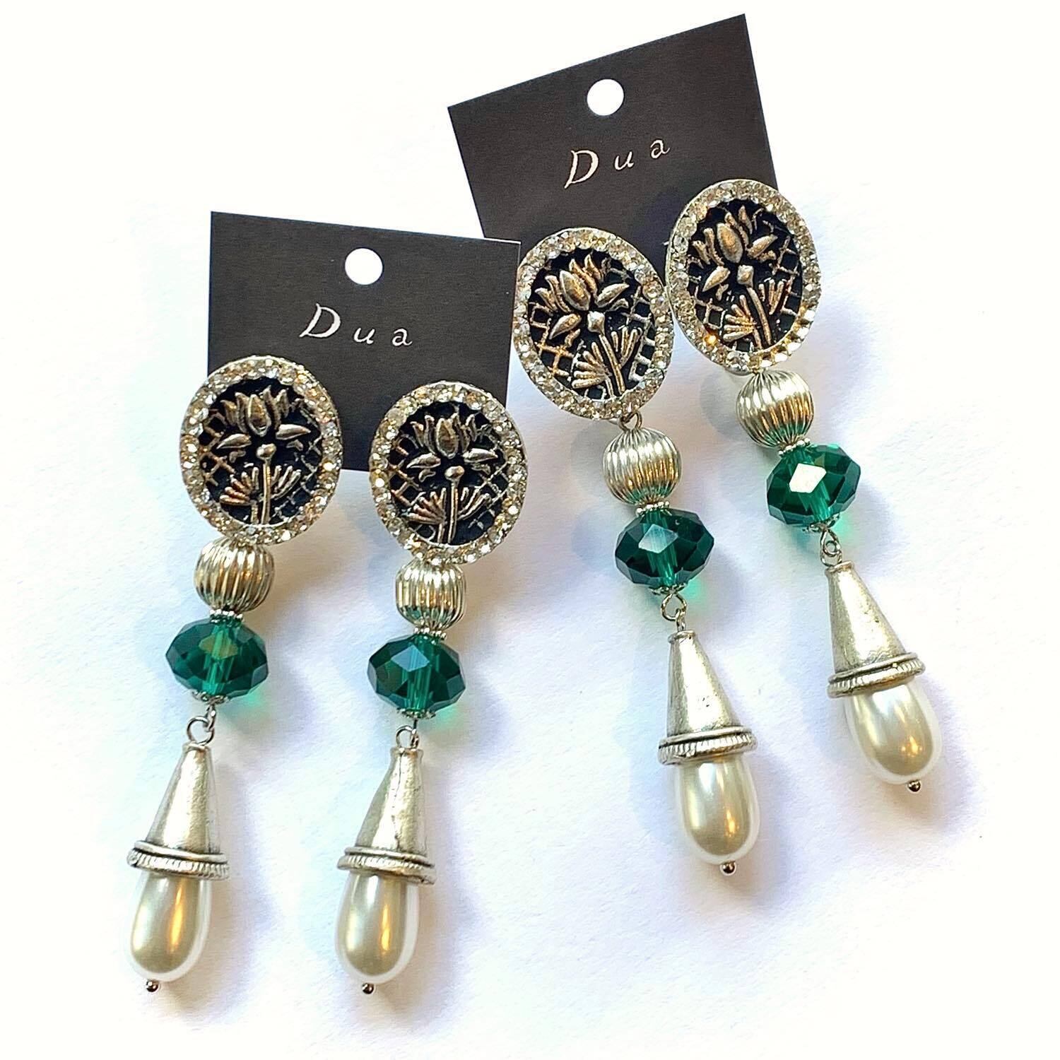 蓮の花とビジューがあしらわれたインドボタンを使った耳飾り。