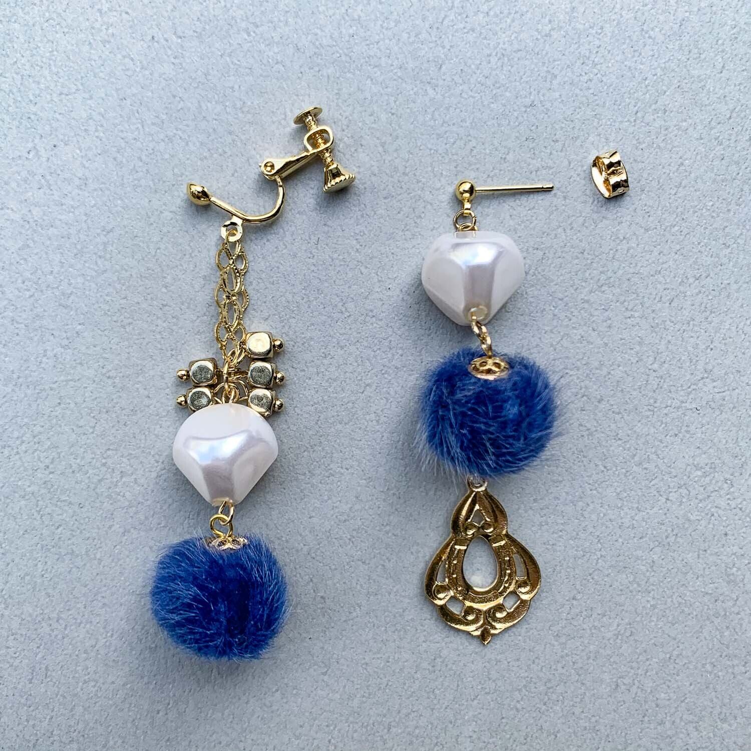 ネイビーポンポンのアシンメトリー〈ピアス/イヤリング〉