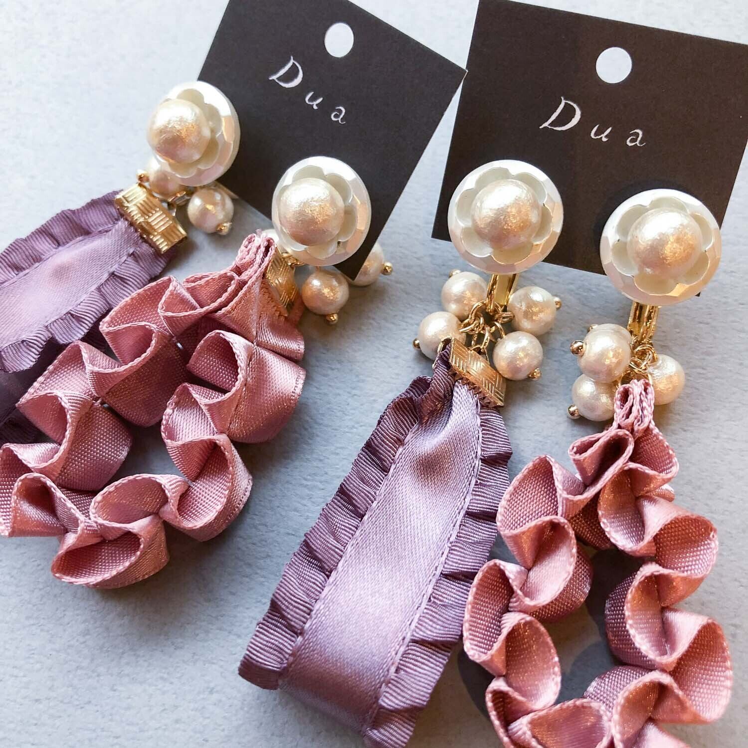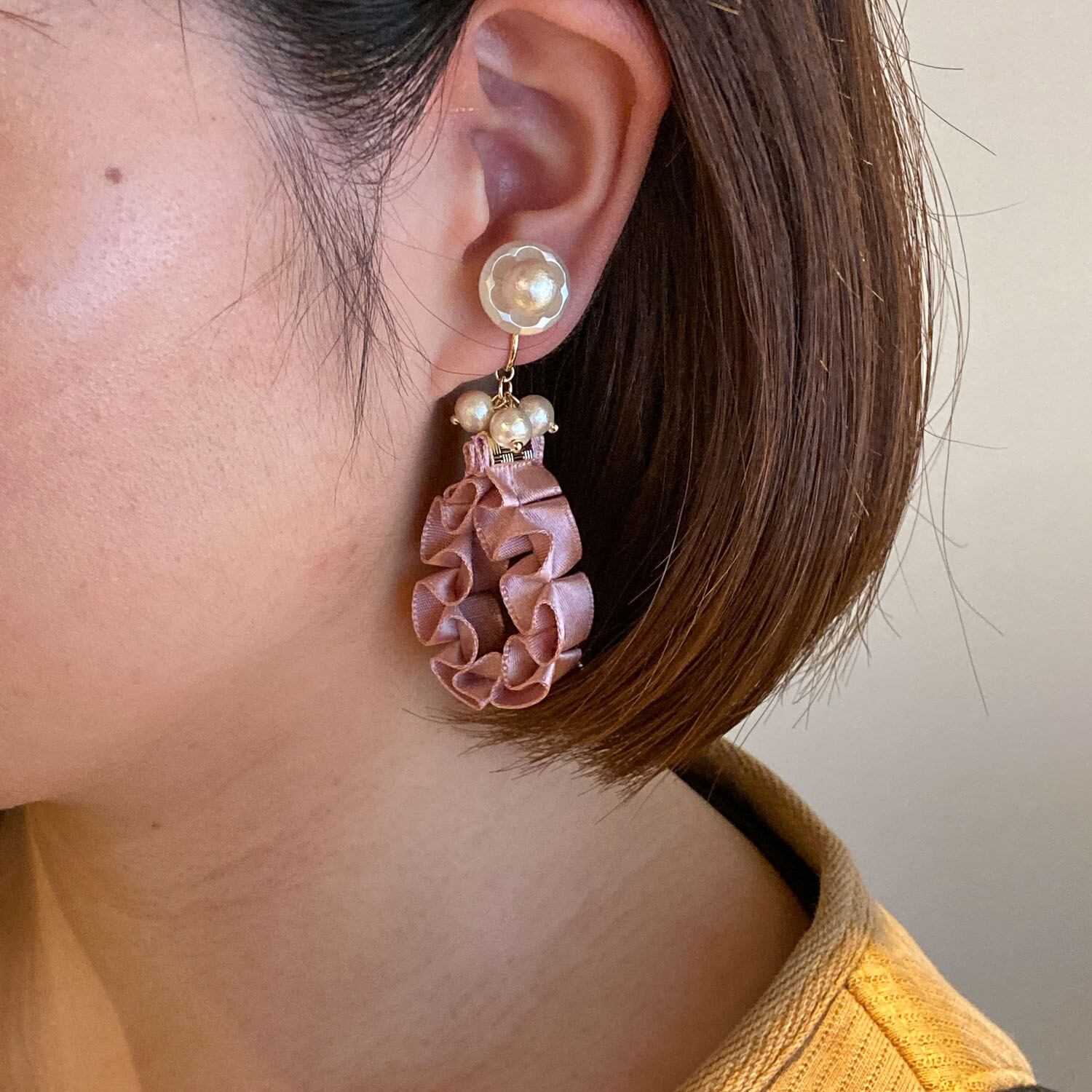 くすみピンクリボンとパールお花の〈ピアス/イヤリング〉