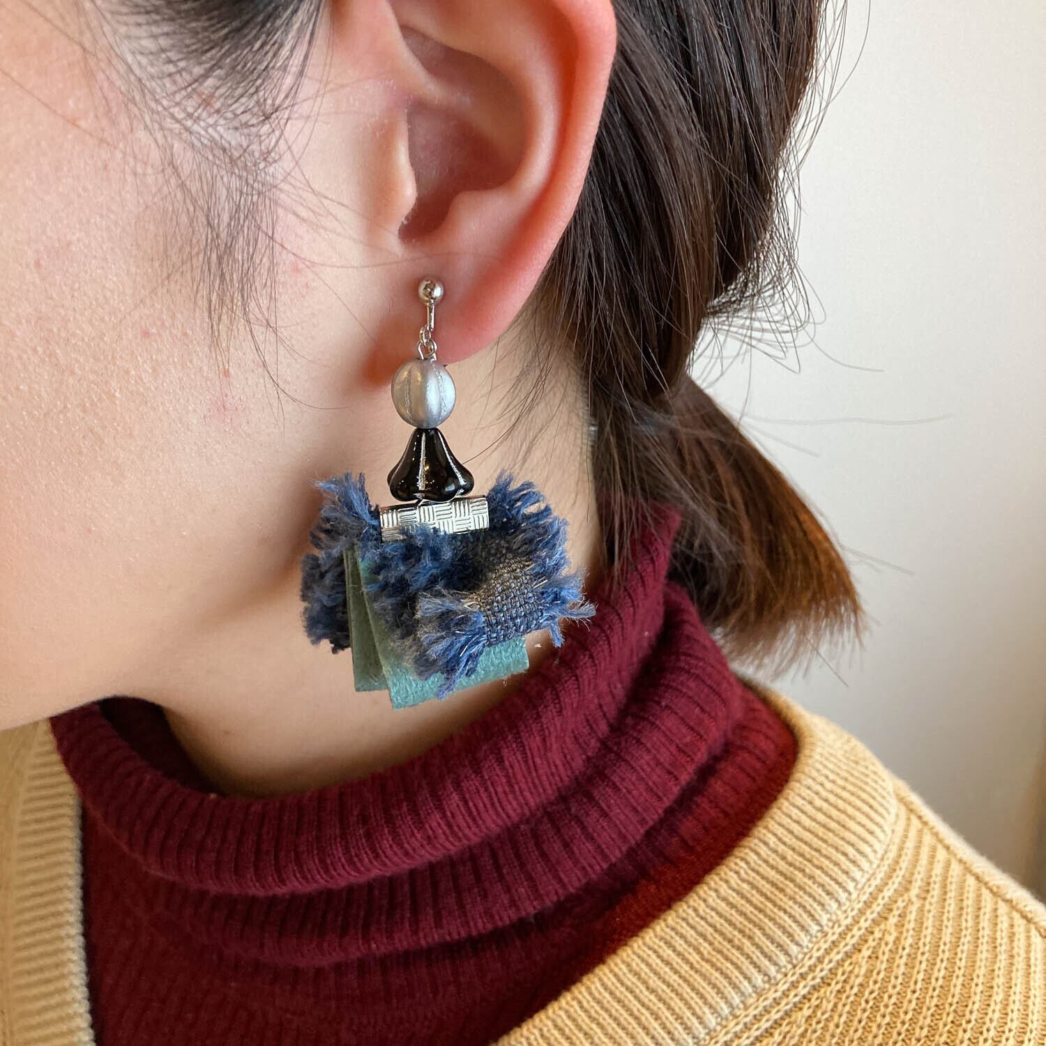 シルバー×黒ビーズとブルーリボンの〈ピアス/イヤリング〉