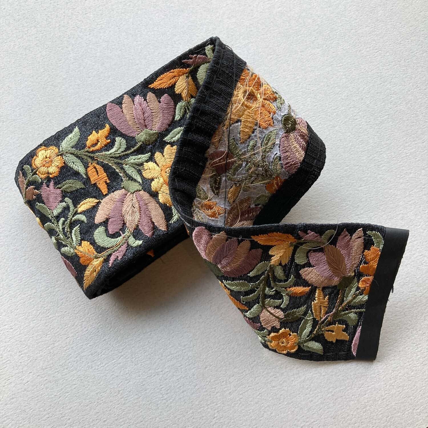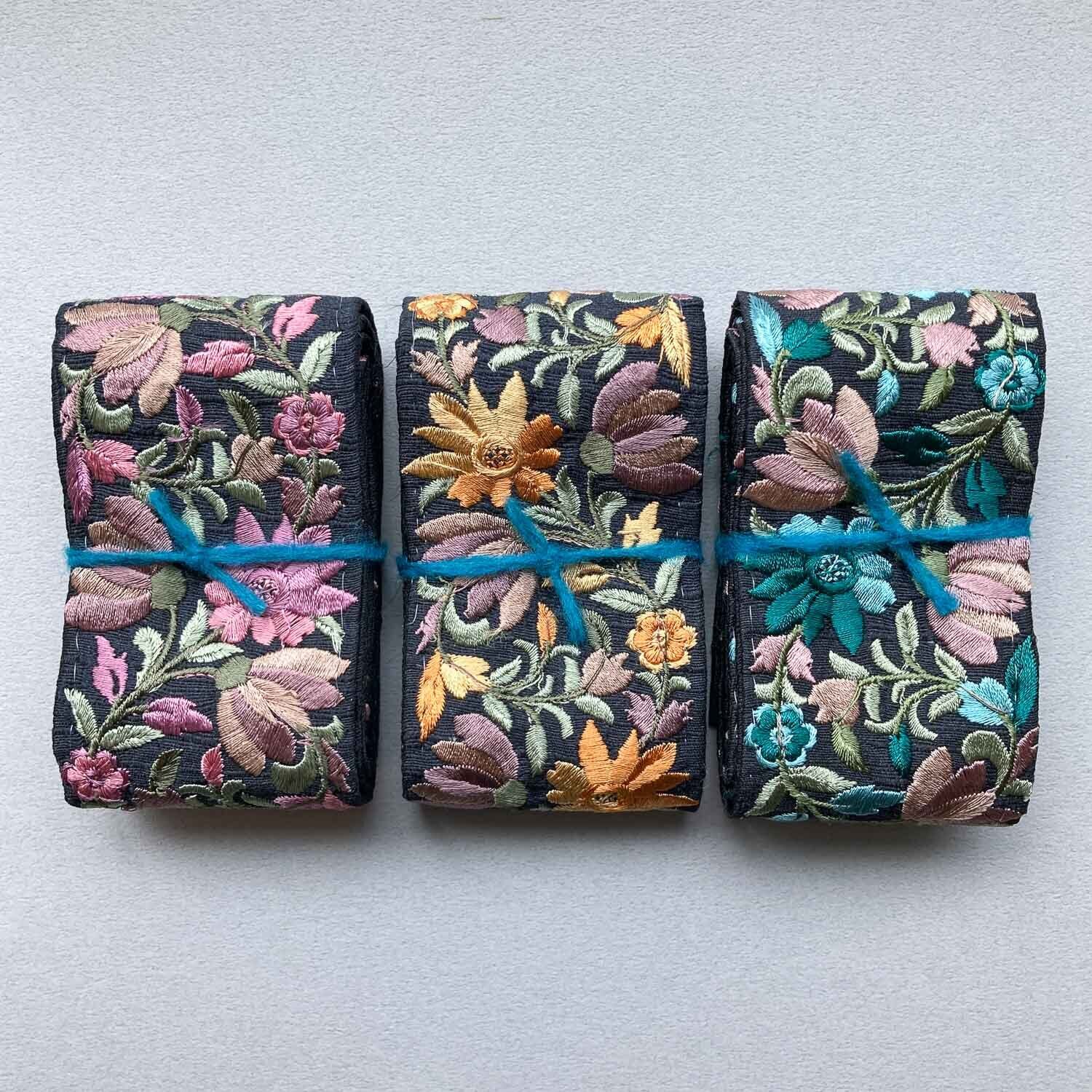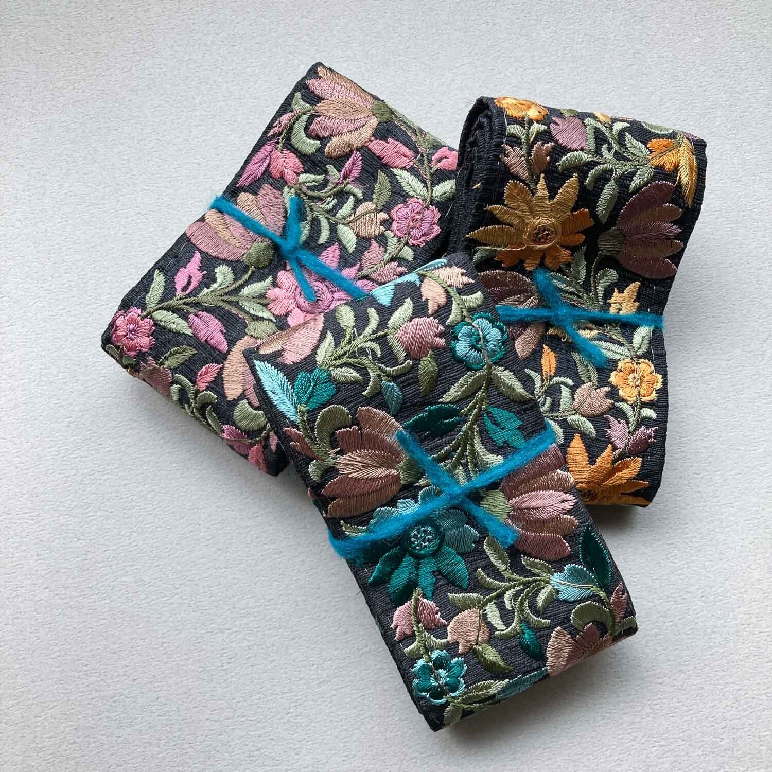 黒地にカラフルな草花の刺繍が映える刺繍リボン。