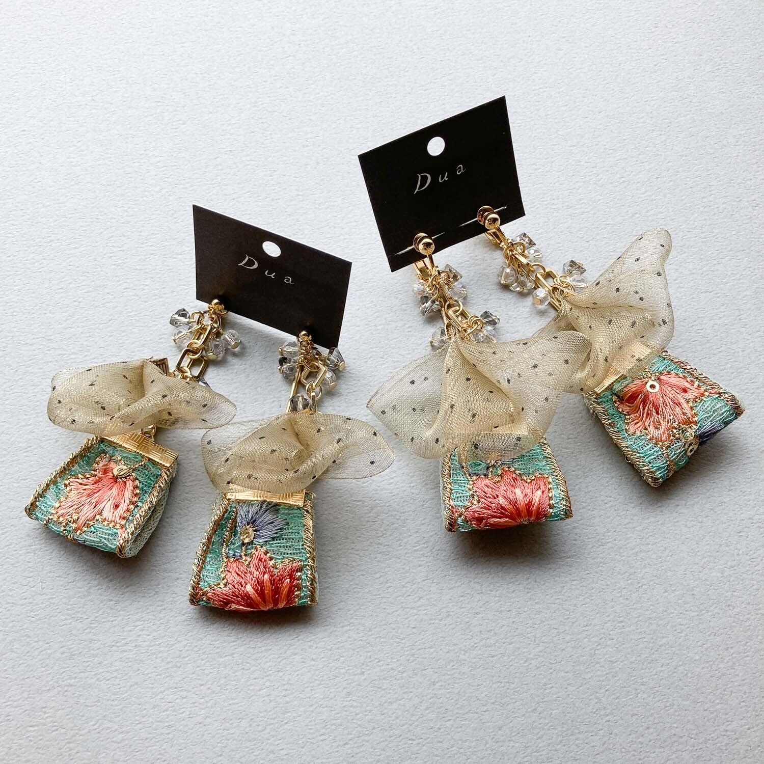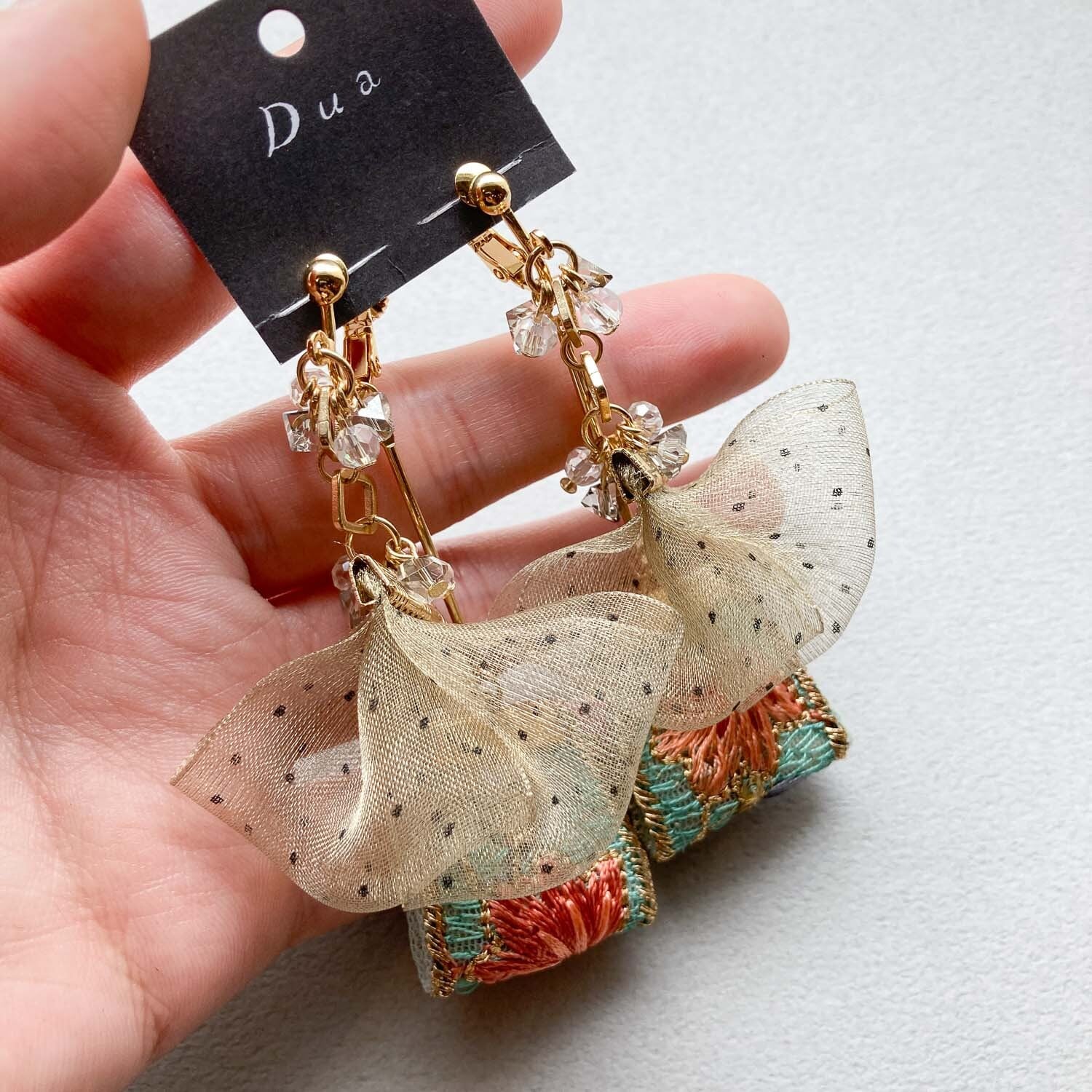 インド刺繍リボン×ドットオーガンジータッセルの〈ピアス/イヤリング〉