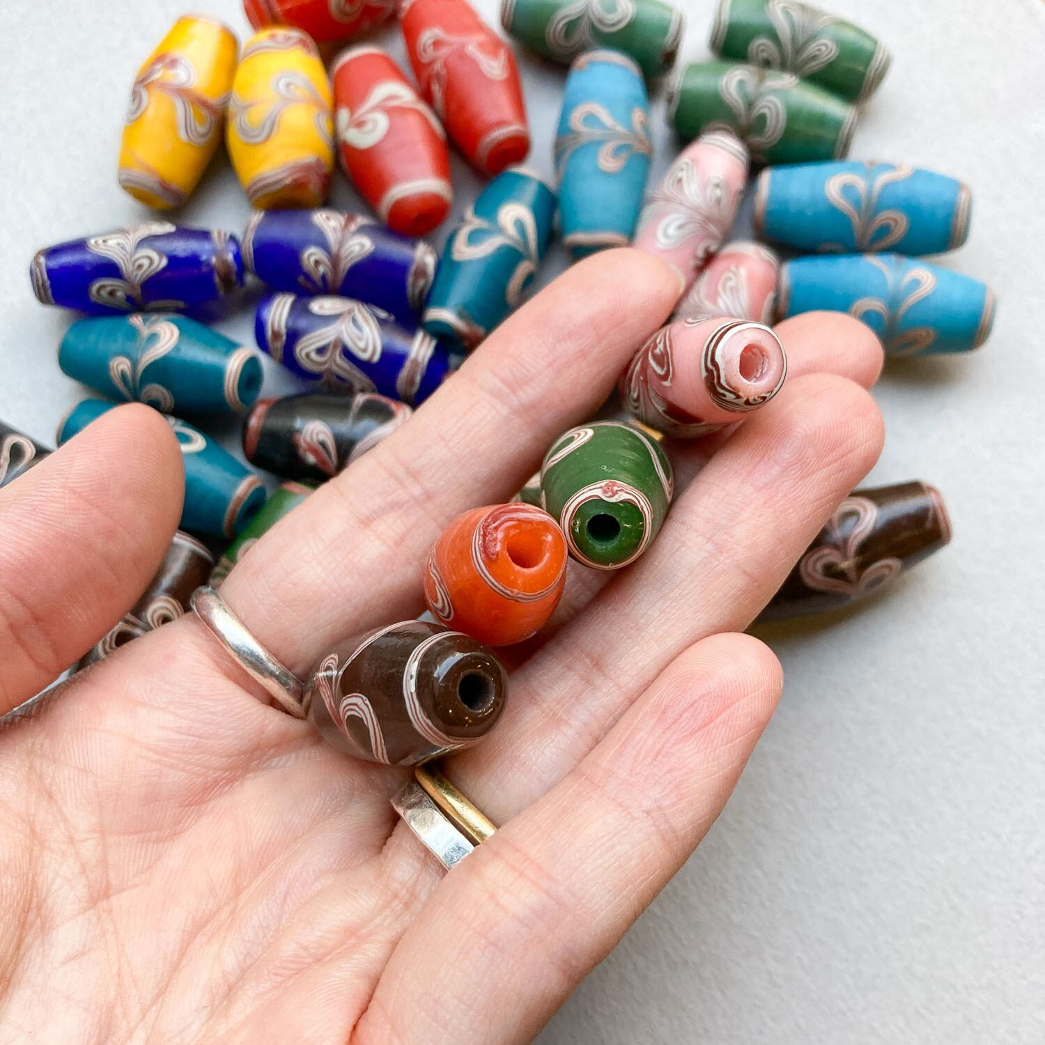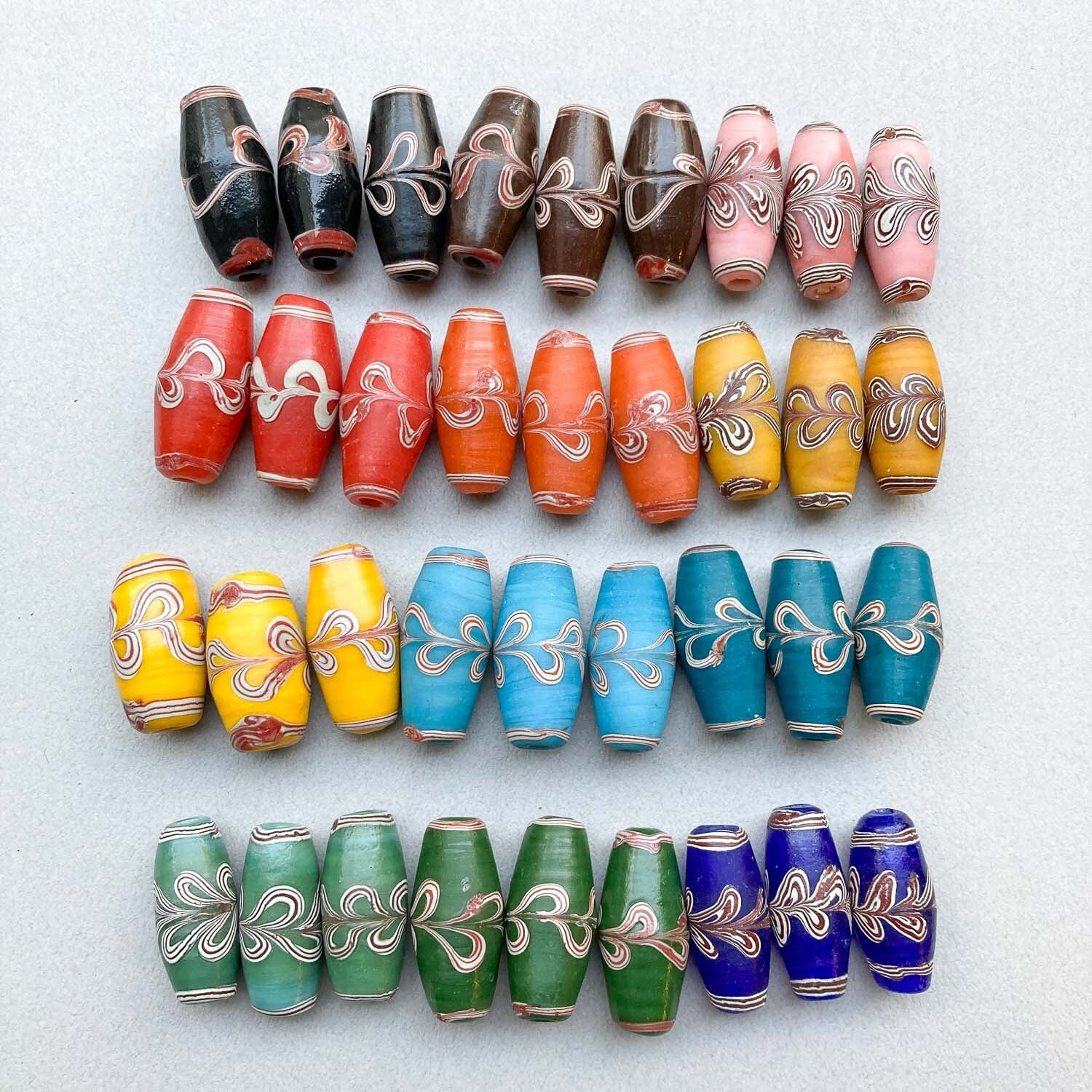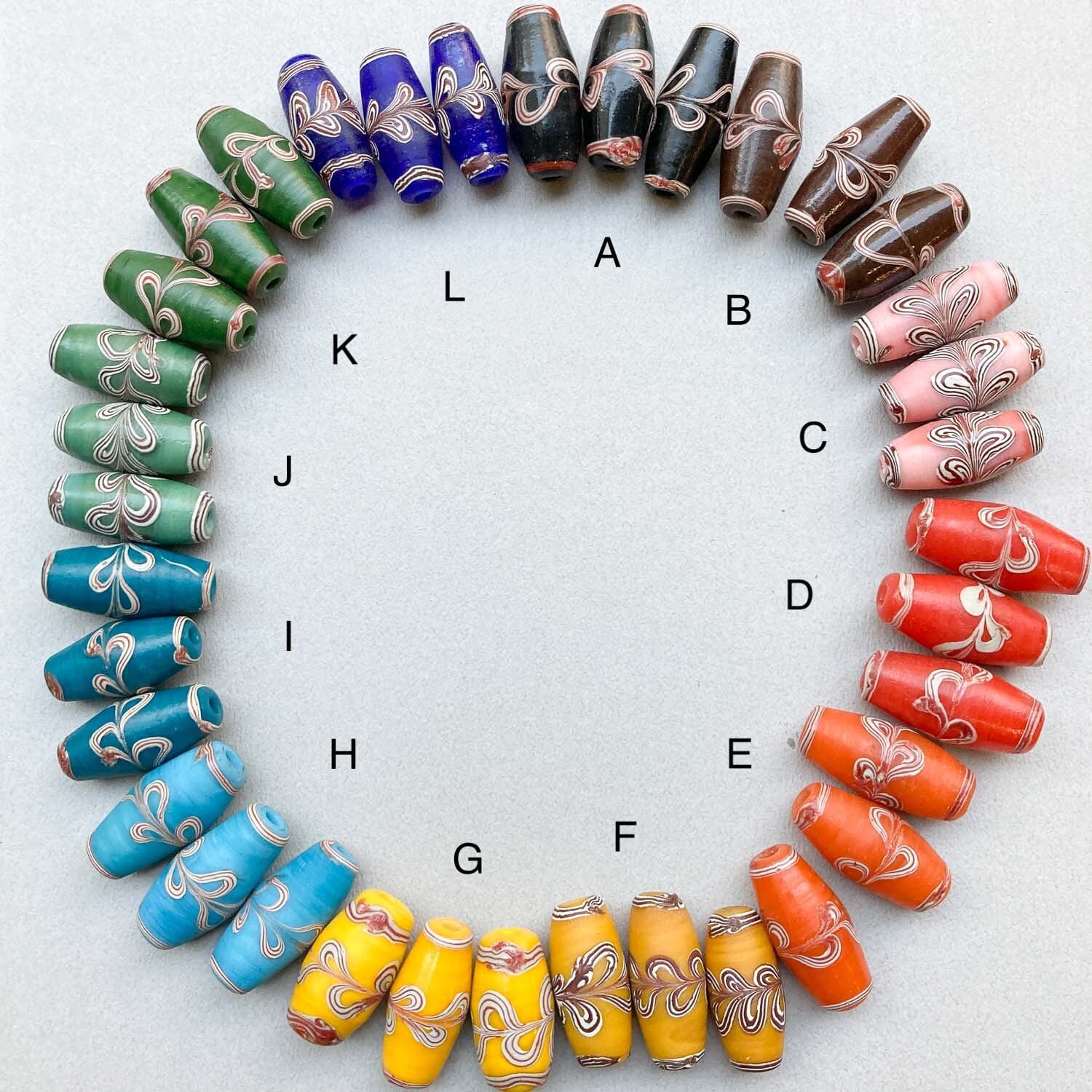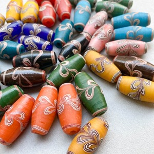 模様が特徴的なインドネシアのガラスビーズ。 大ぶりな紡錘型は、アクセサリーのポイントに◎ ■販売単位:1個 ■種類:A黒、B茶、Cピンク、D赤、E橙、Fマスタード、G黄色、H水色、I青緑、Jミント、K緑、L青 ■サイズ:約28×13×13mm ■素材:ガラス ■輸入元:インドネシア ■模様、形、大きさに個体差がございます。予めご了承ください。 ■商品コード:BE1810088