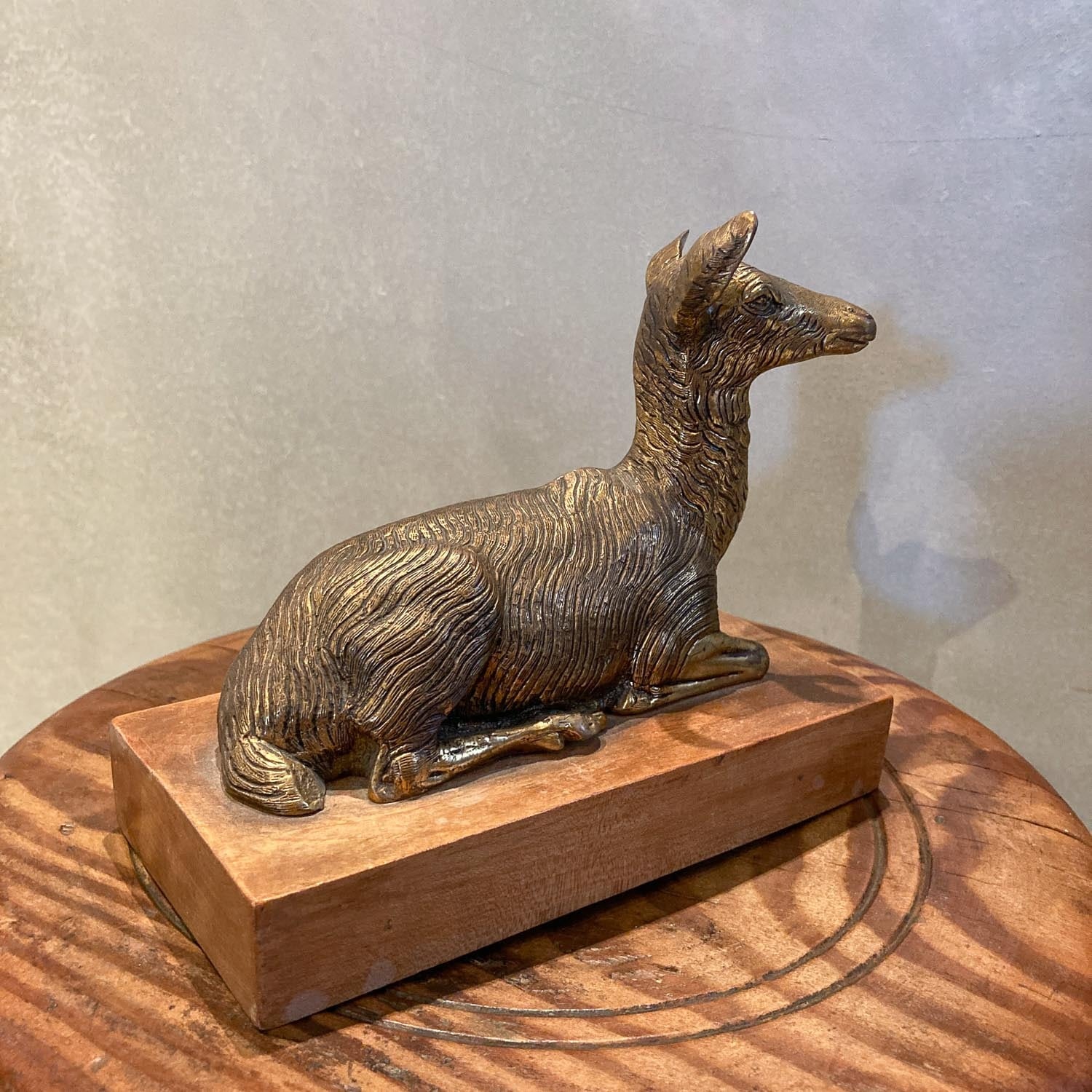 板の上でゆっくりと寛ぐ羊の置物。