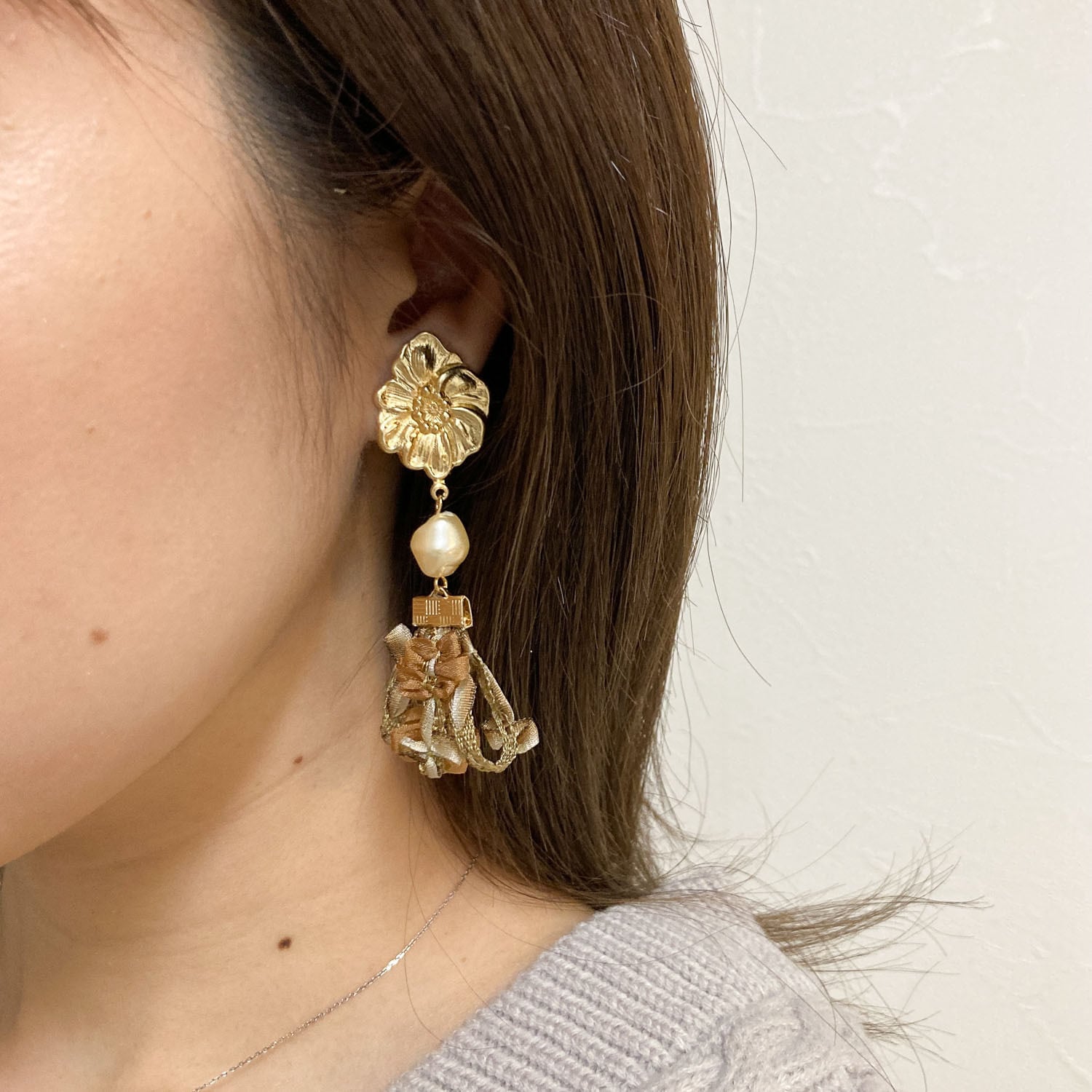 お花真鍮チャームとブラウンリボンタッセルの〈ピアス/イヤリング〉