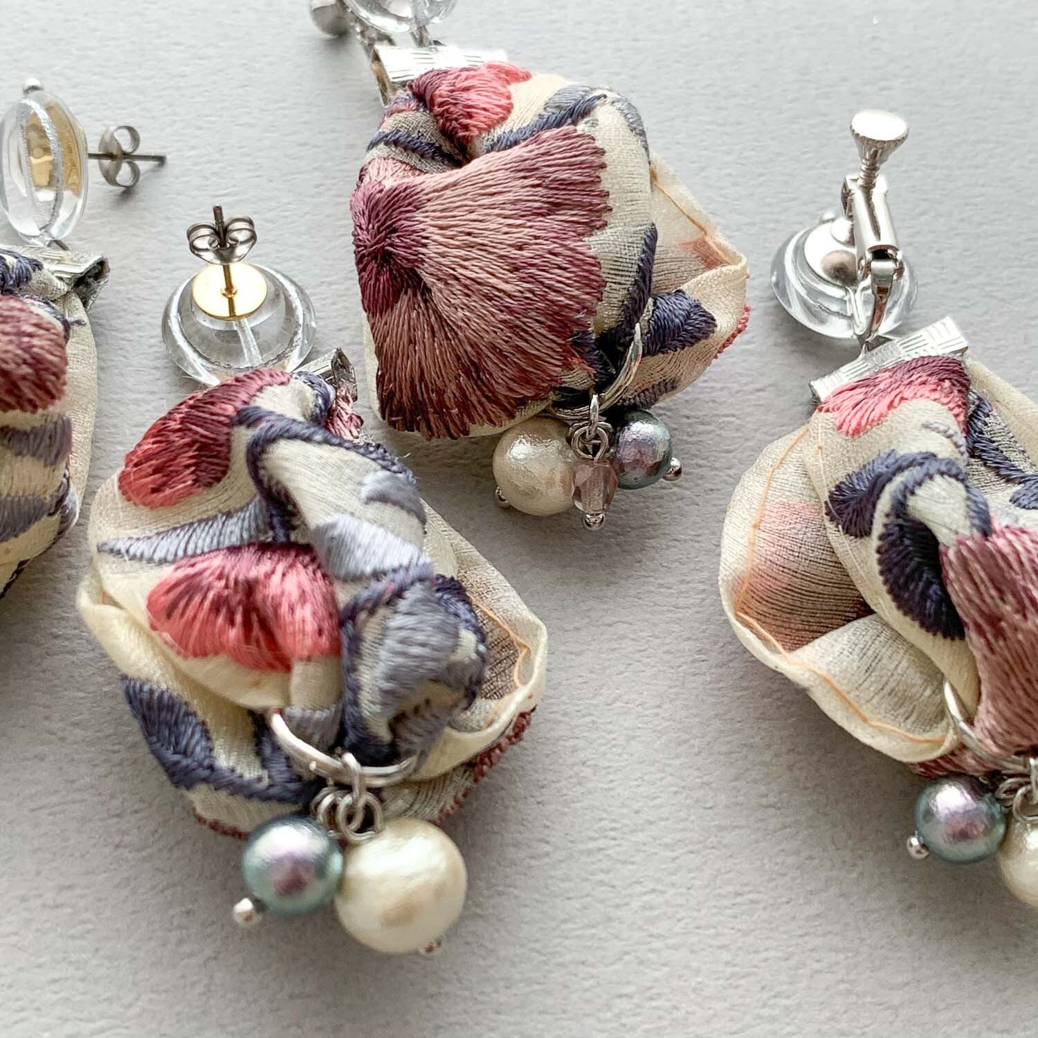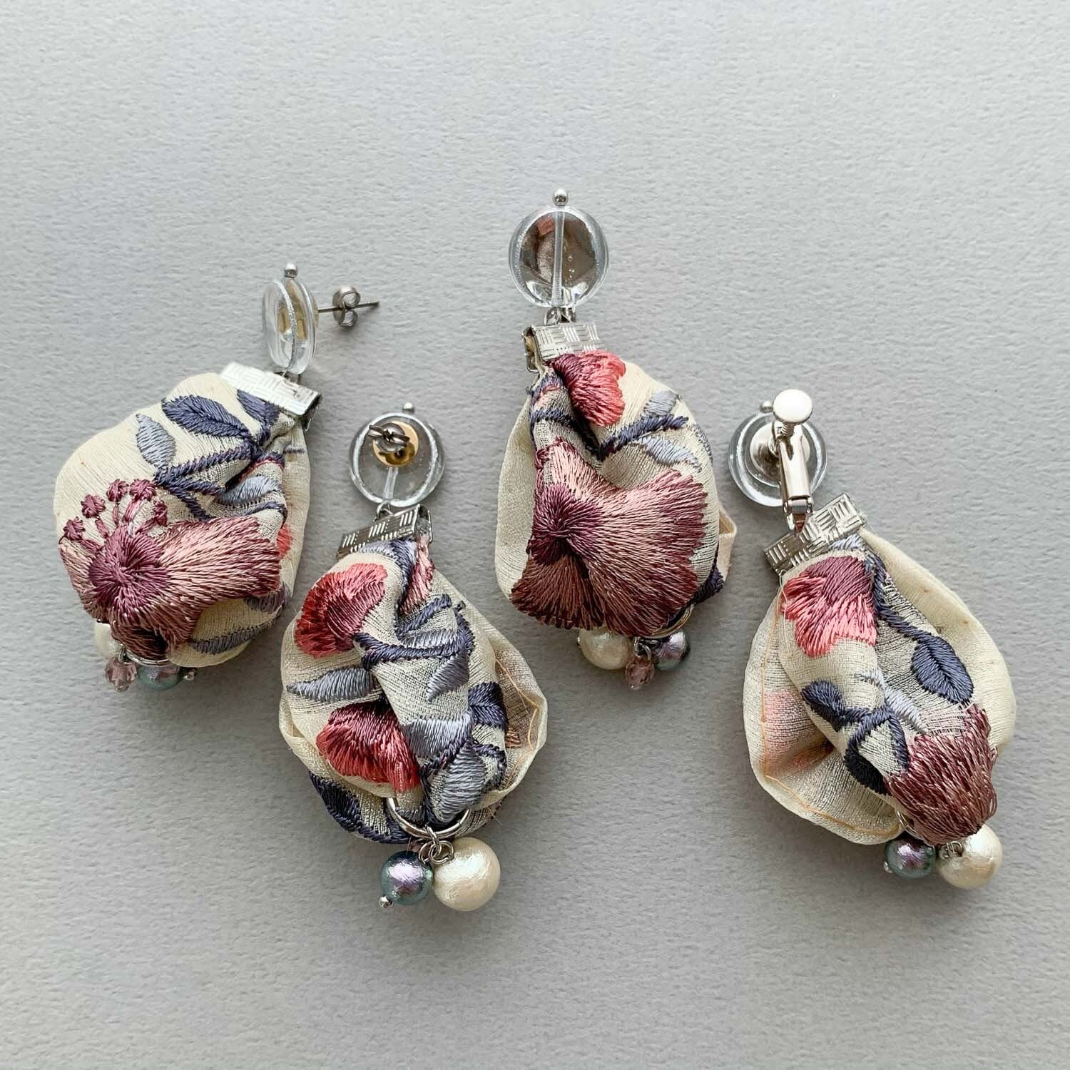 チェコクリアトップとくすみインド刺繍リボン〈ピアス / イヤリング〉
