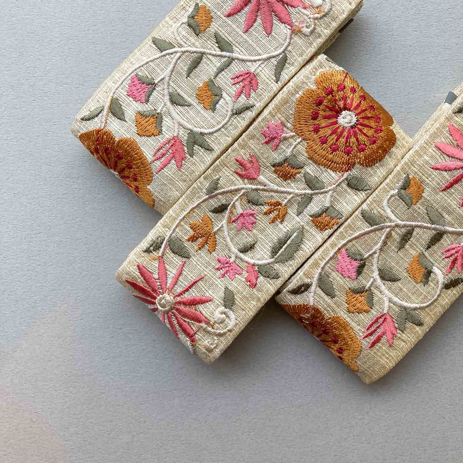2種類のお花の刺繍が施された優しい雰囲気の刺繍リボンです。