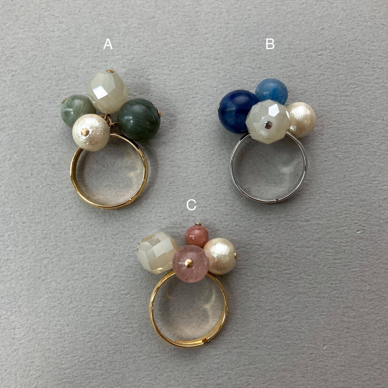 天然石ビーズとコットンパールのリング