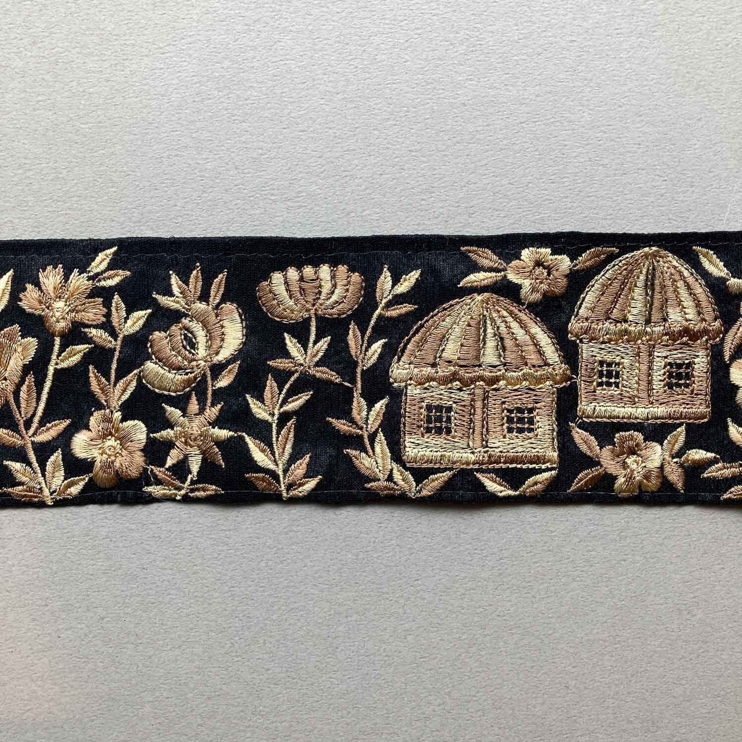 黒地ベージュお家刺繍リボン(1mカット)