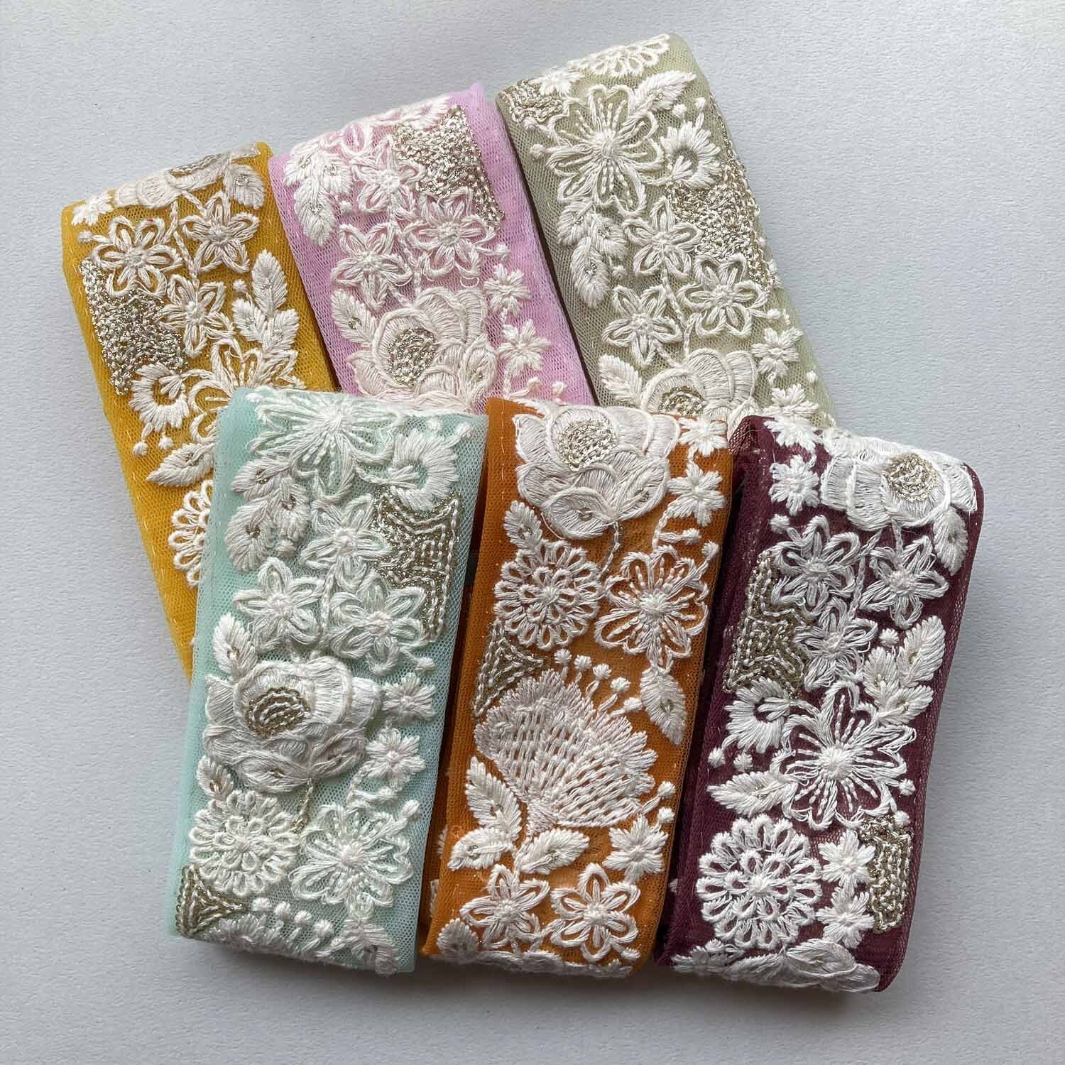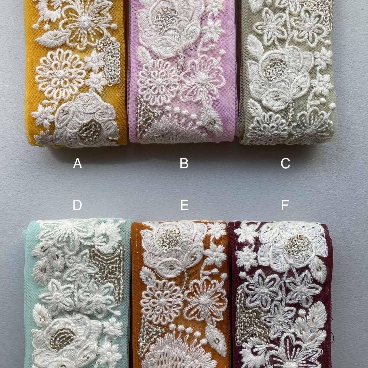 白花とスパンコールのチュール刺繍リボン(1mカット)