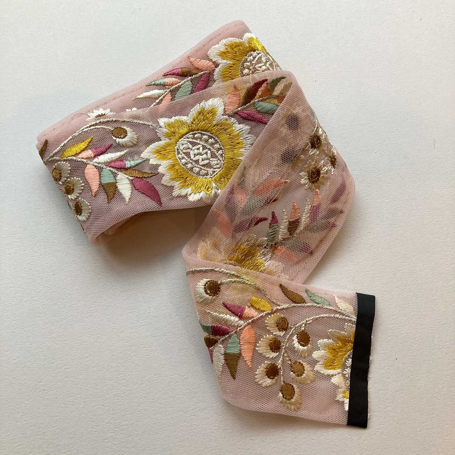 白縁花とカラフルリーフの刺繍チュールレース(1mカット)