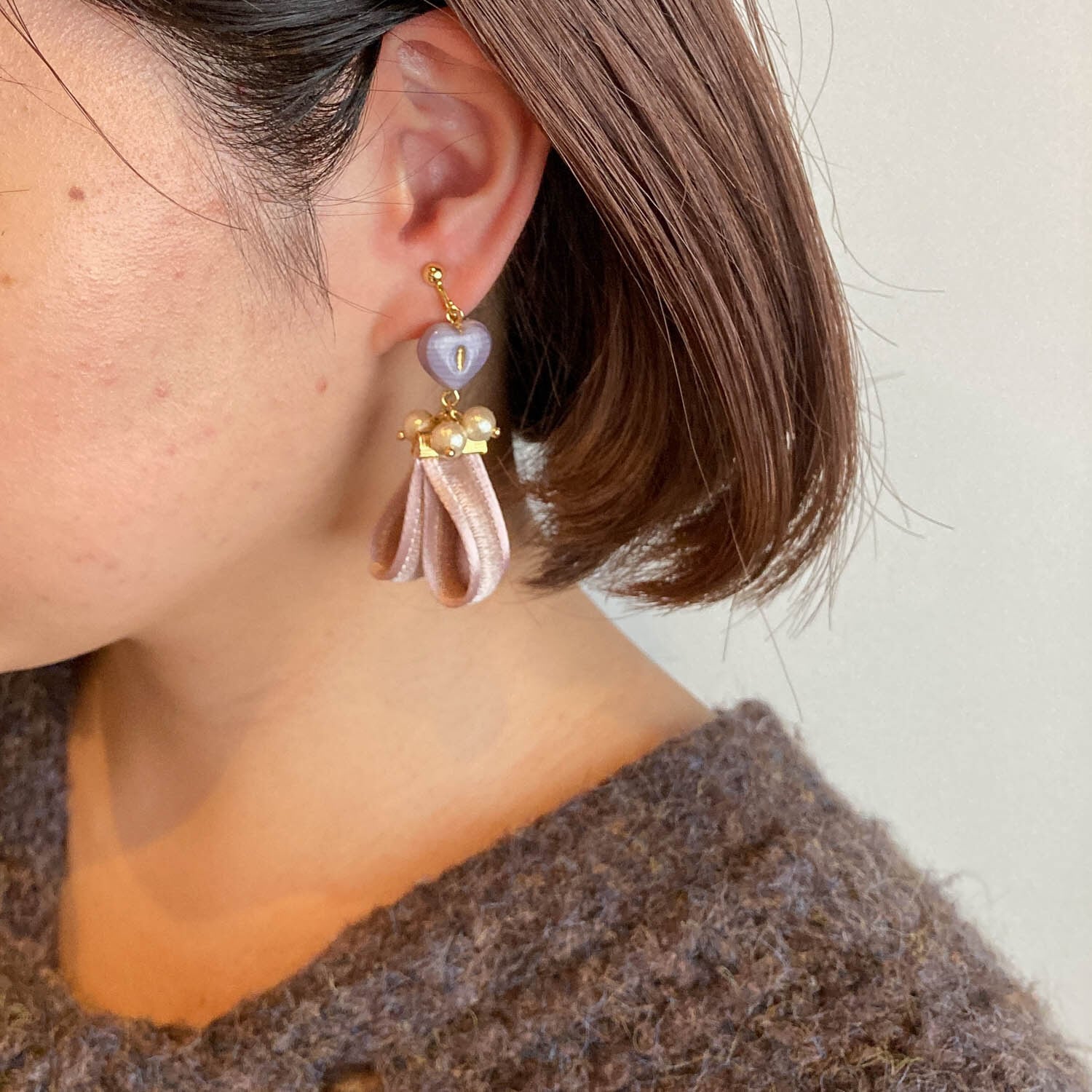 チェコ紫ハートとベロア×サテンリボンの〈ピアス/イヤリング〉