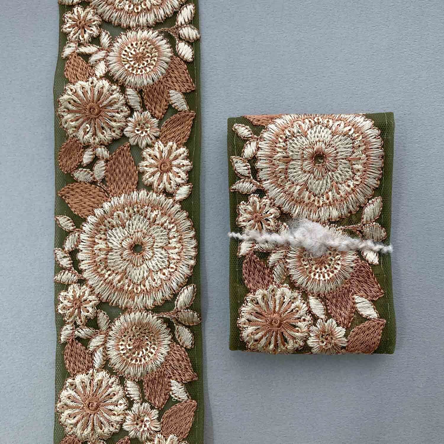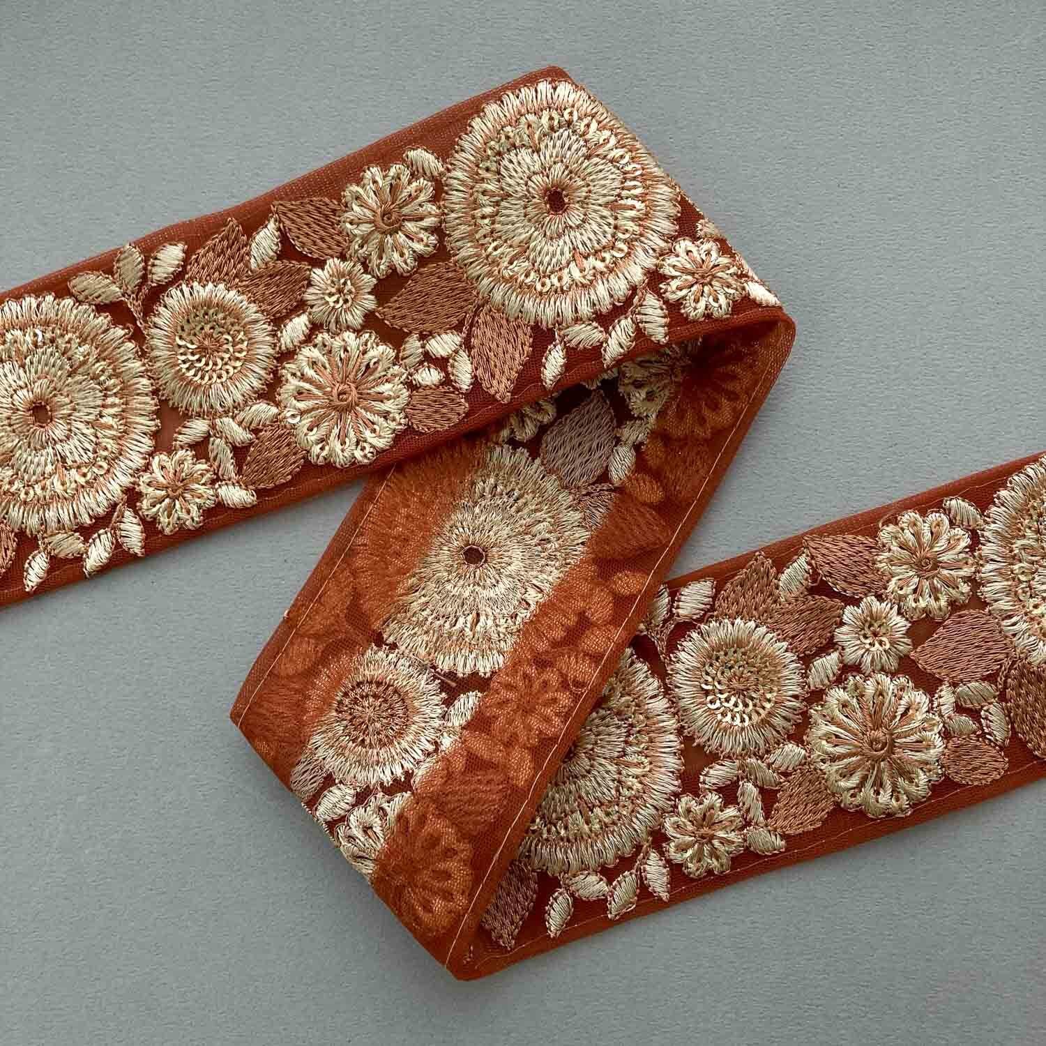 丸い茶縁お花のチュール刺繍リボン(1mカット)