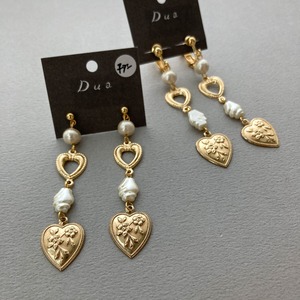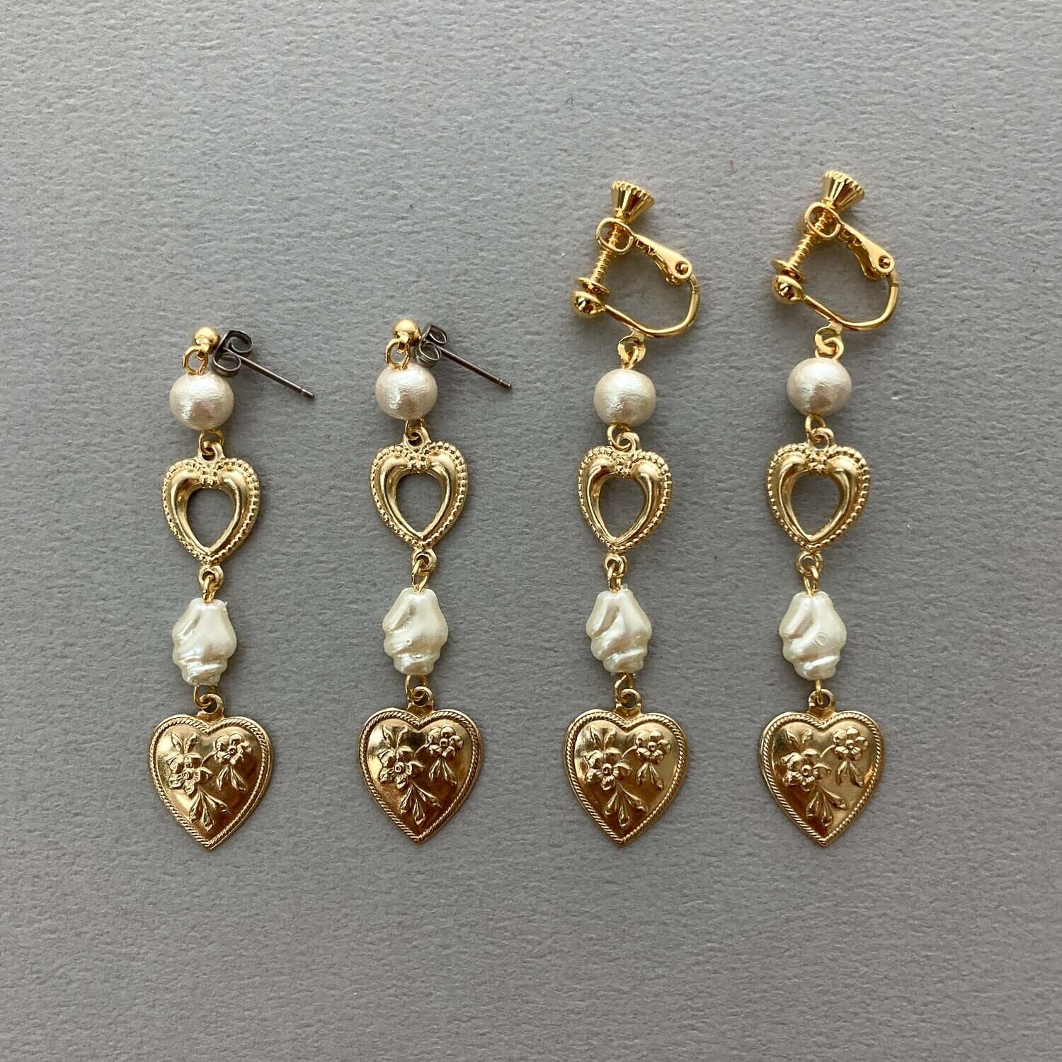 ハート真鍮チャームとコットンパールの〈ピアス/イヤリング〉