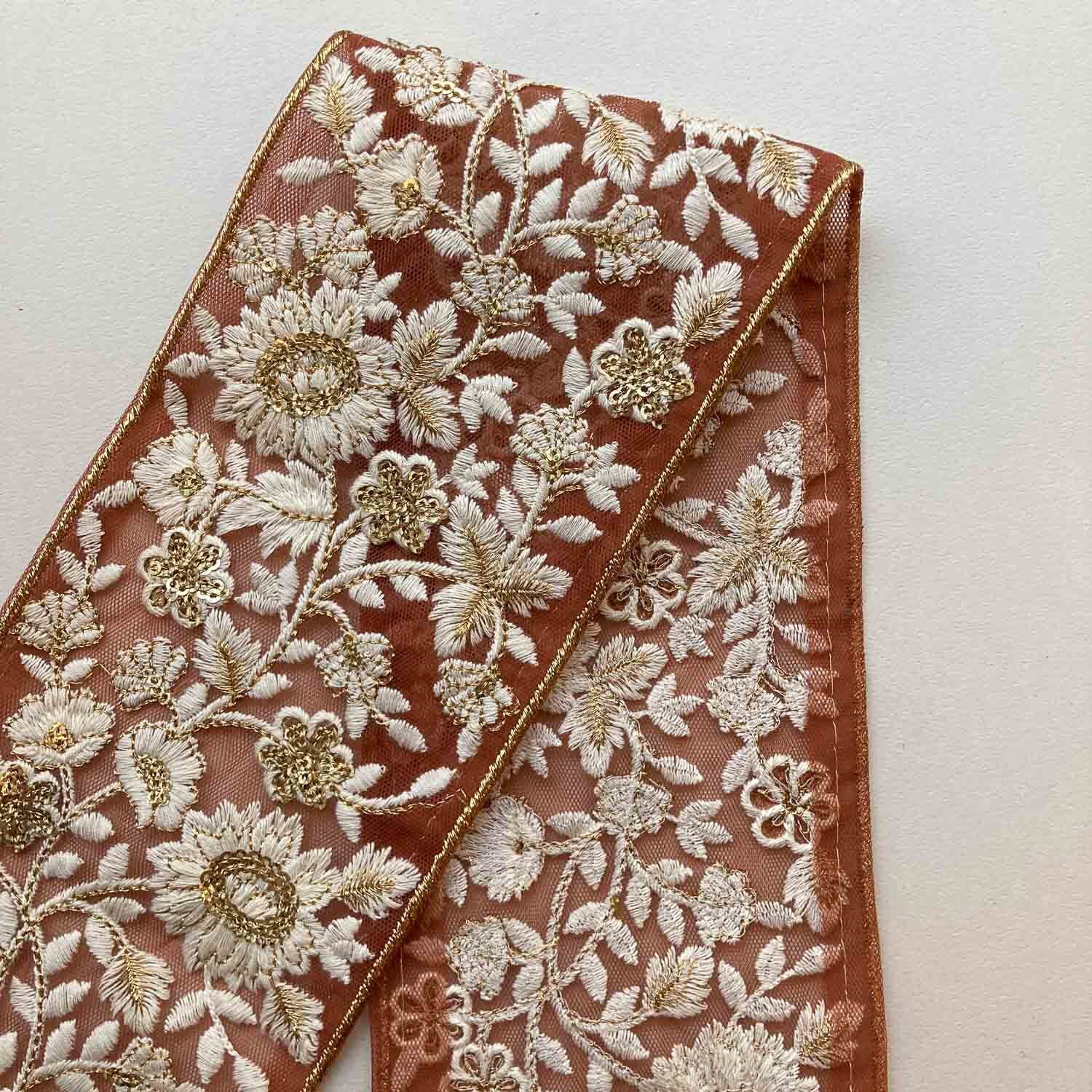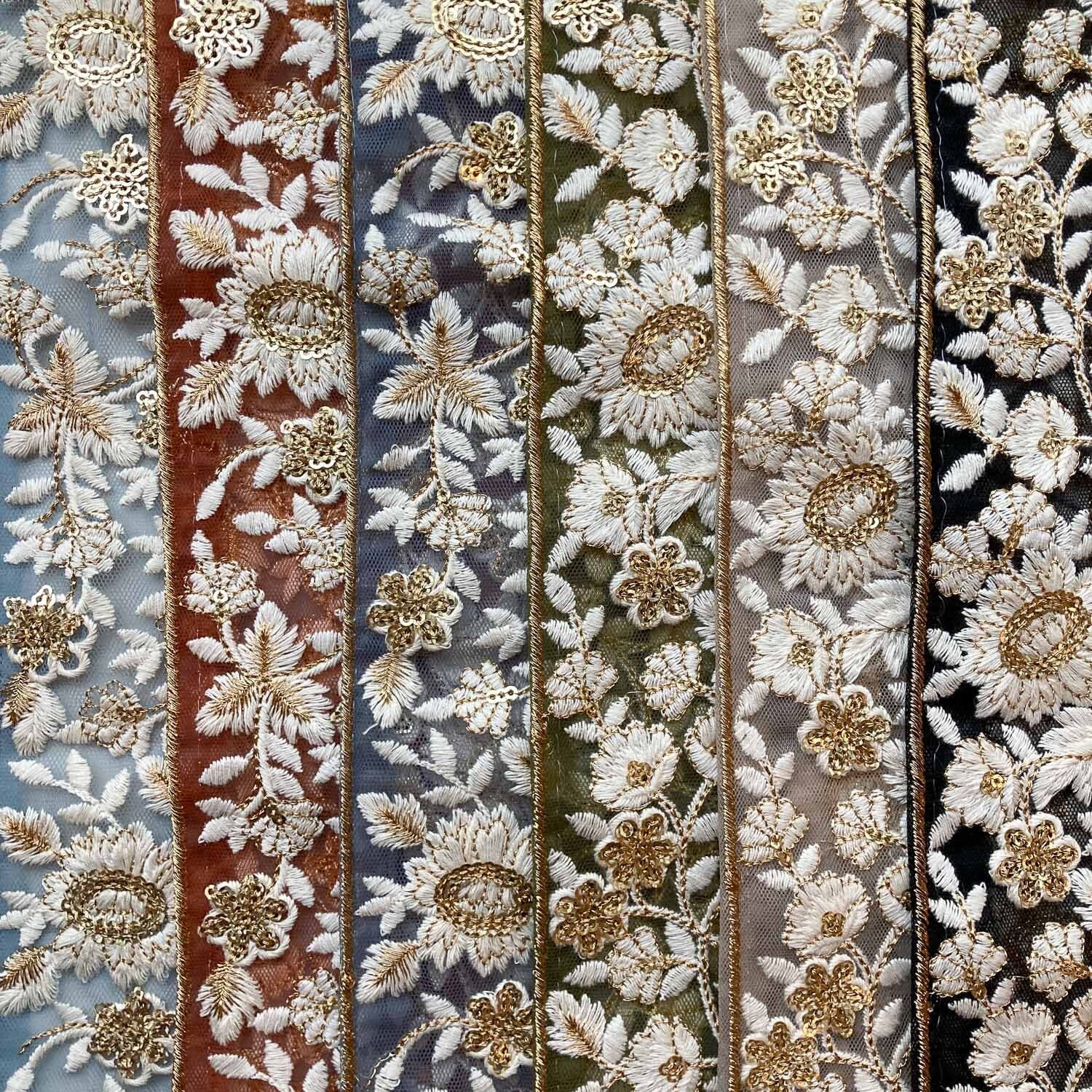 白花ゴールドライン太幅刺繍チュールレース(1mカット)