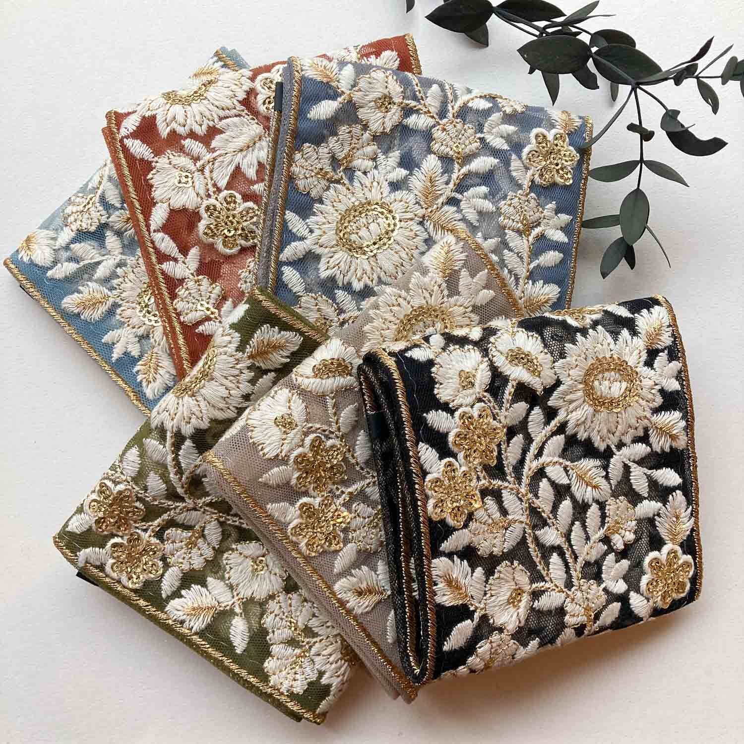 白いお花にスパンコールがアクセントになっている刺繍リボン。