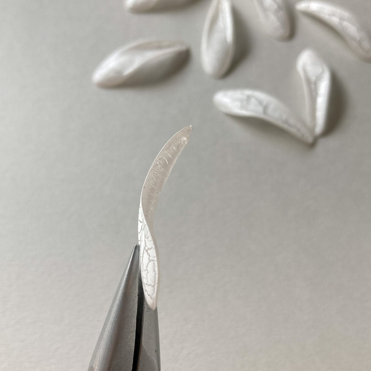 ひびが入ったようなクラック模様がシックな花びらチャーム。