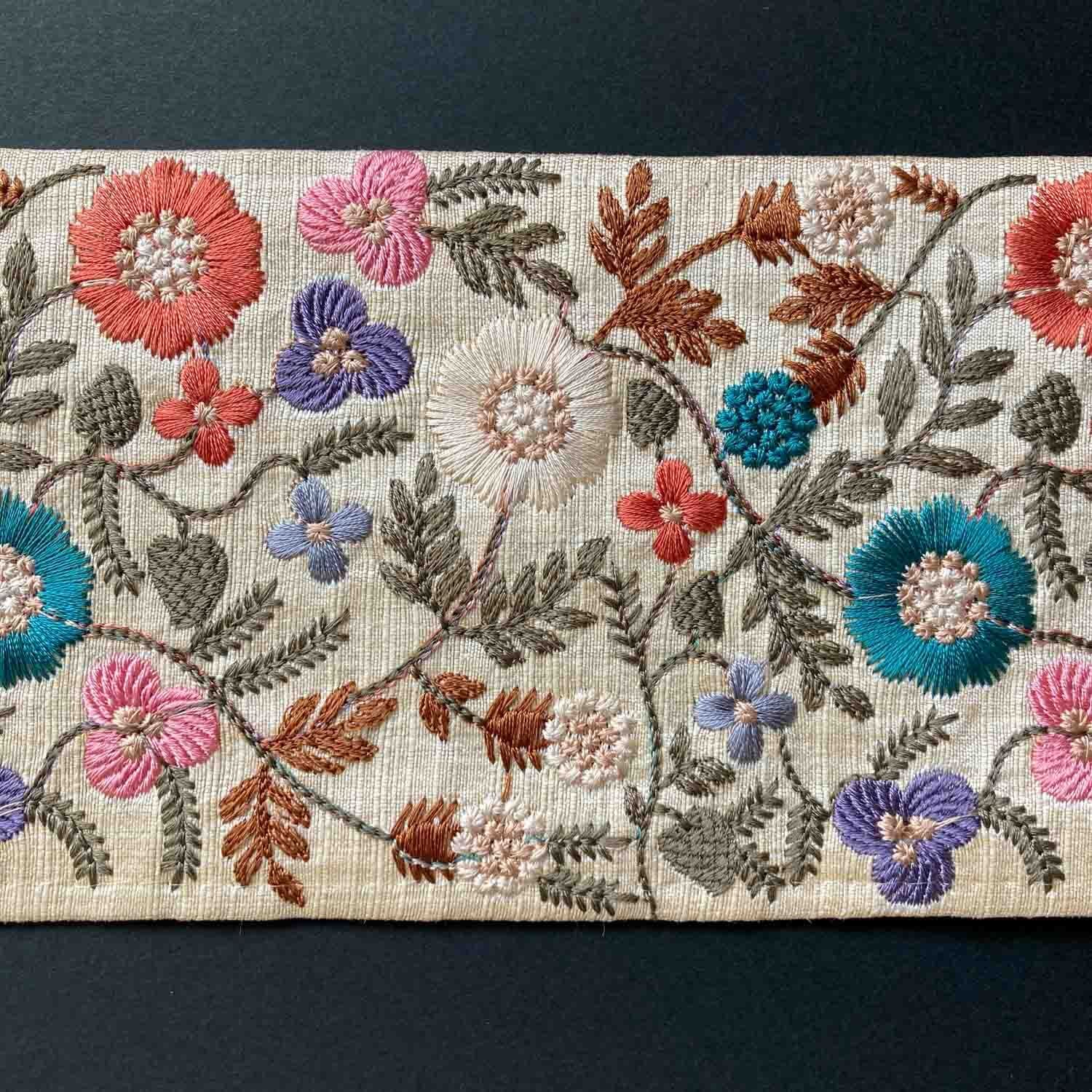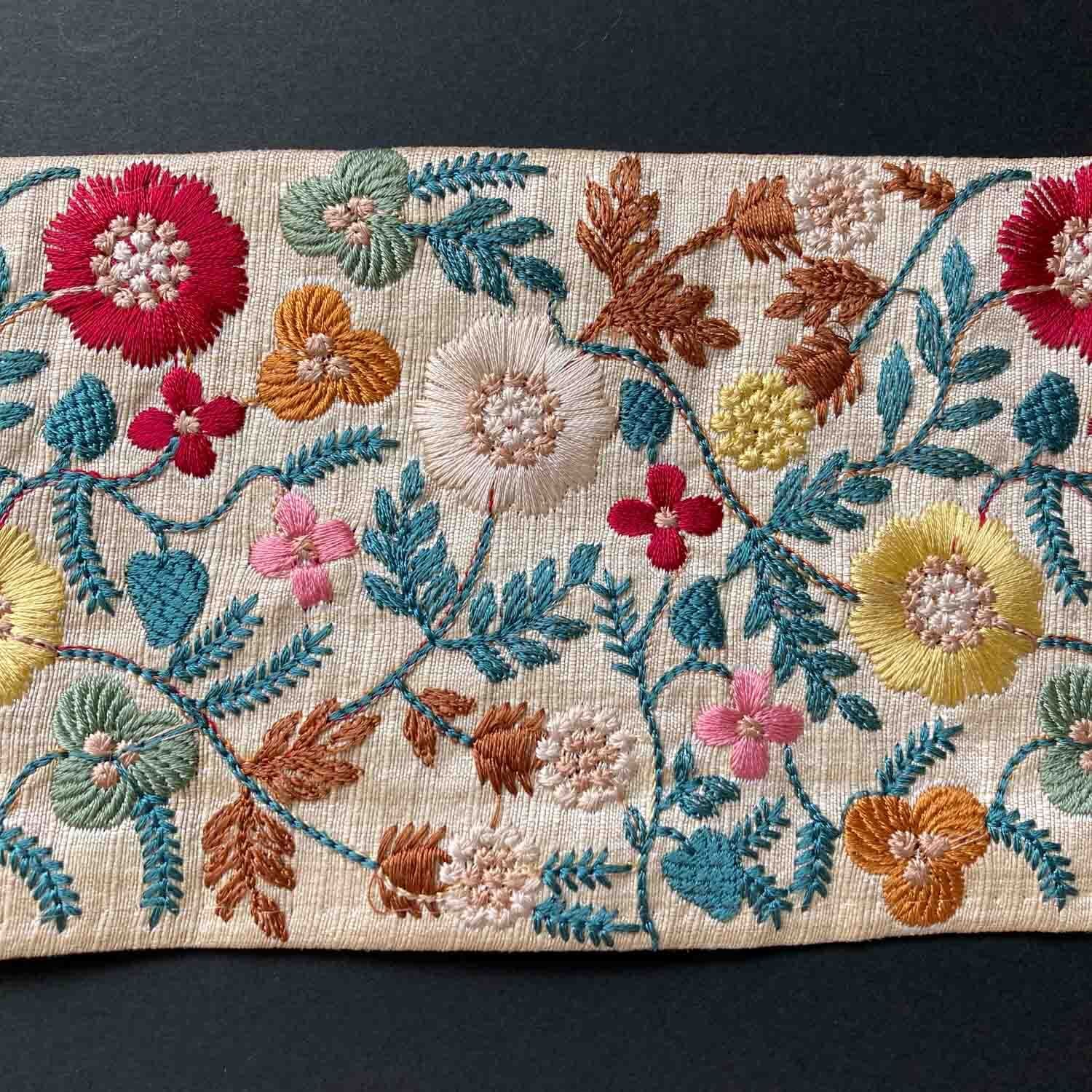 →オーガンジー幅広カラフルお花刺繍リボン(生成り地)