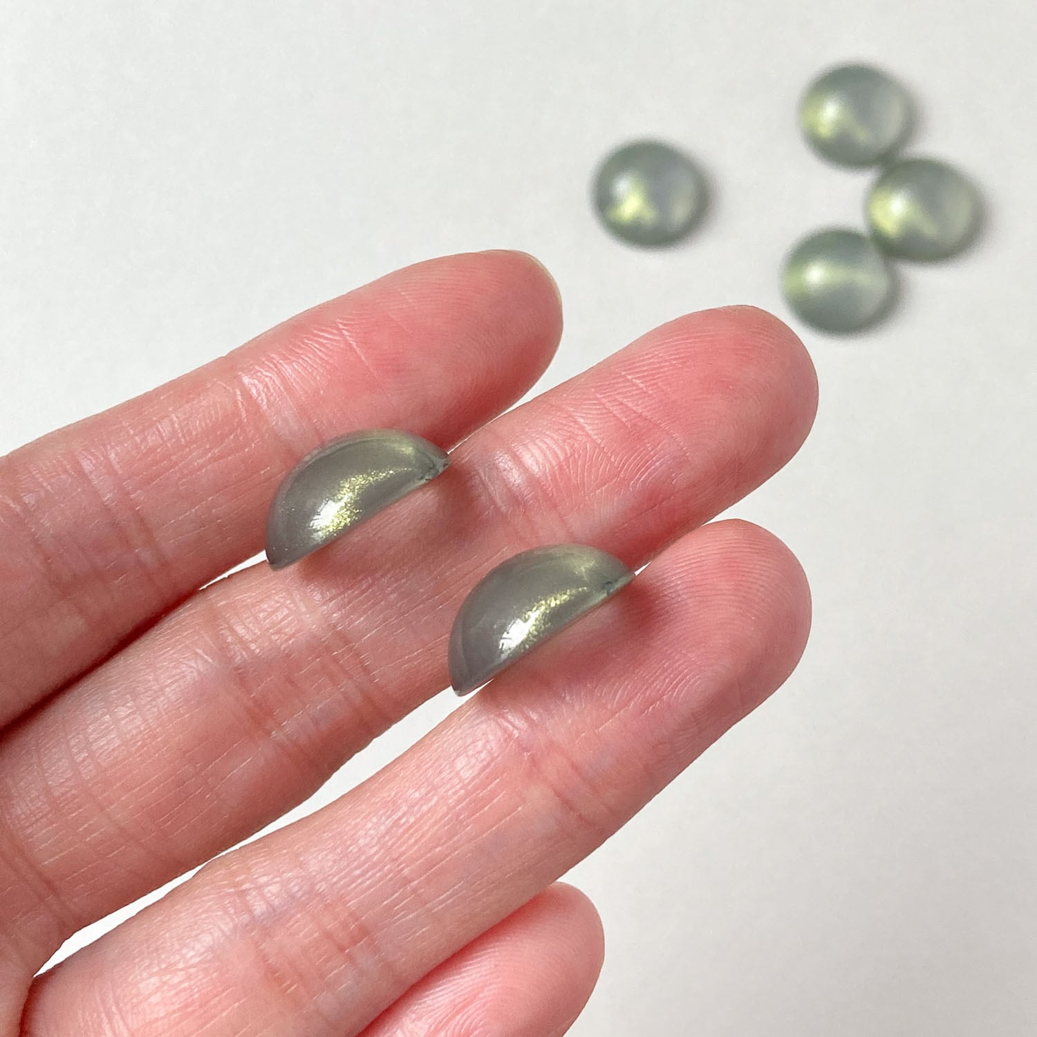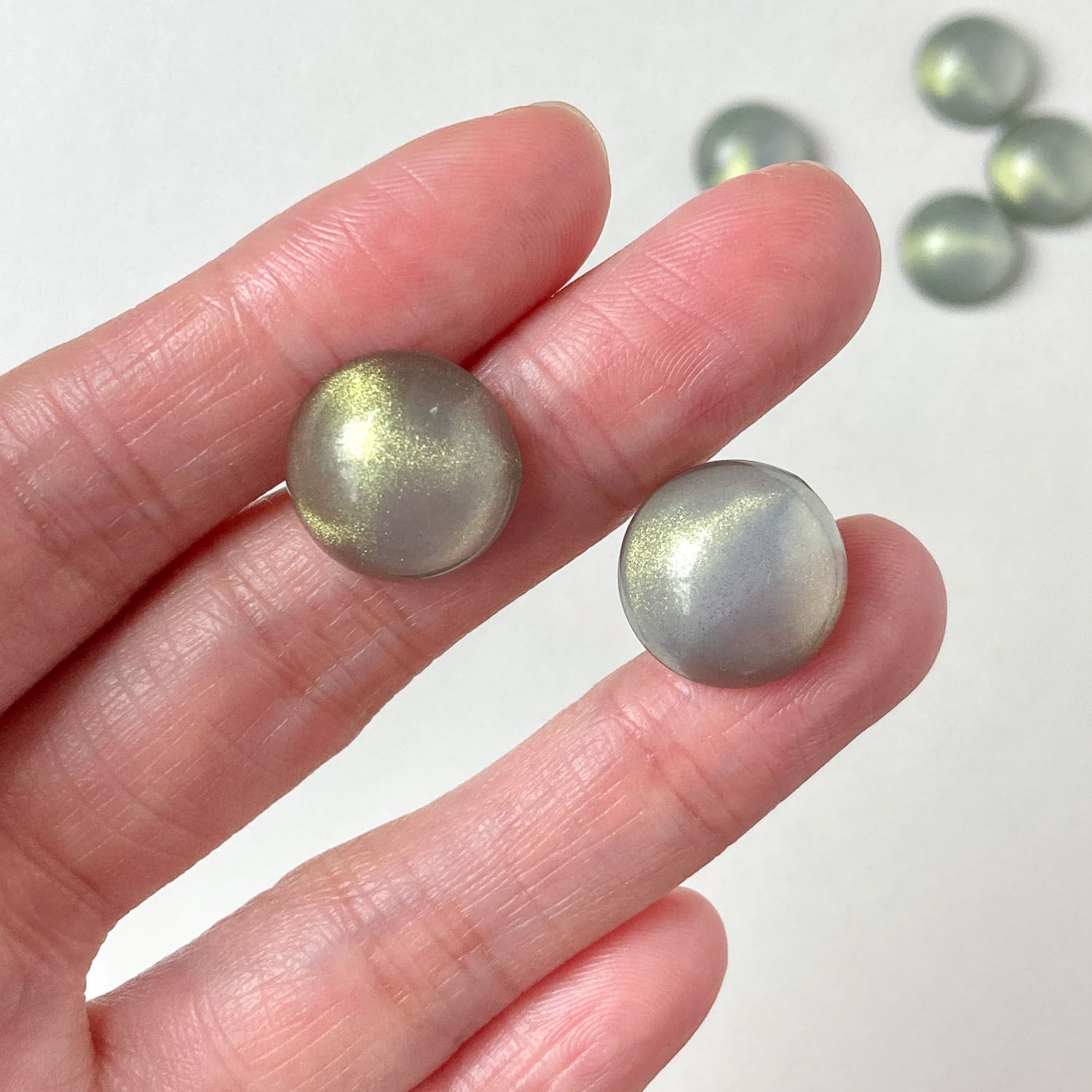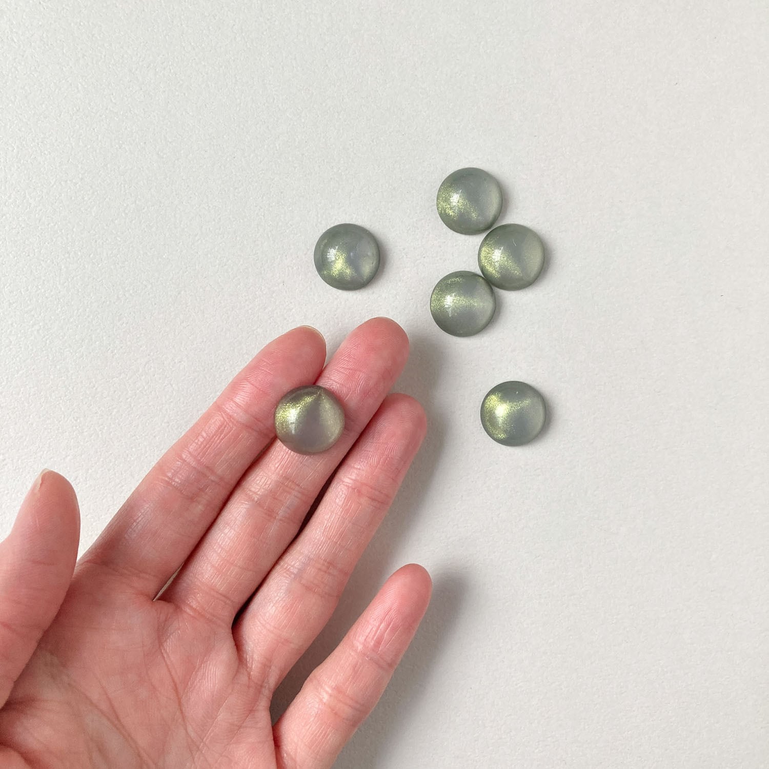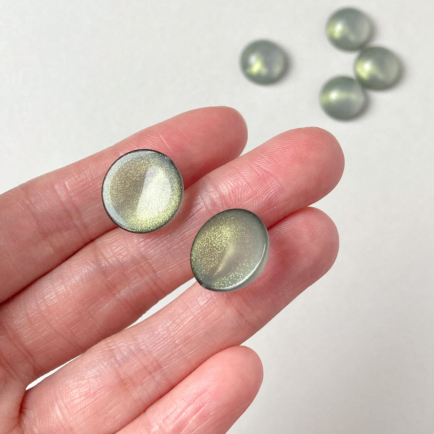 ツヤっとしたクリアカラーにラメが入ったラウンドカボションです。