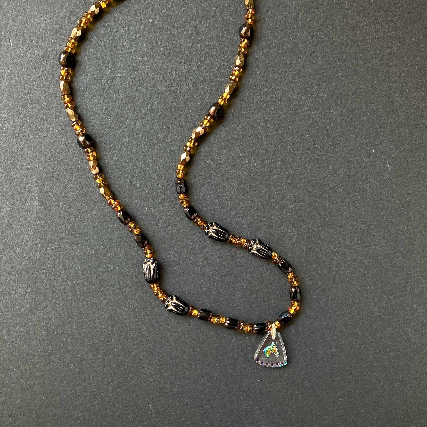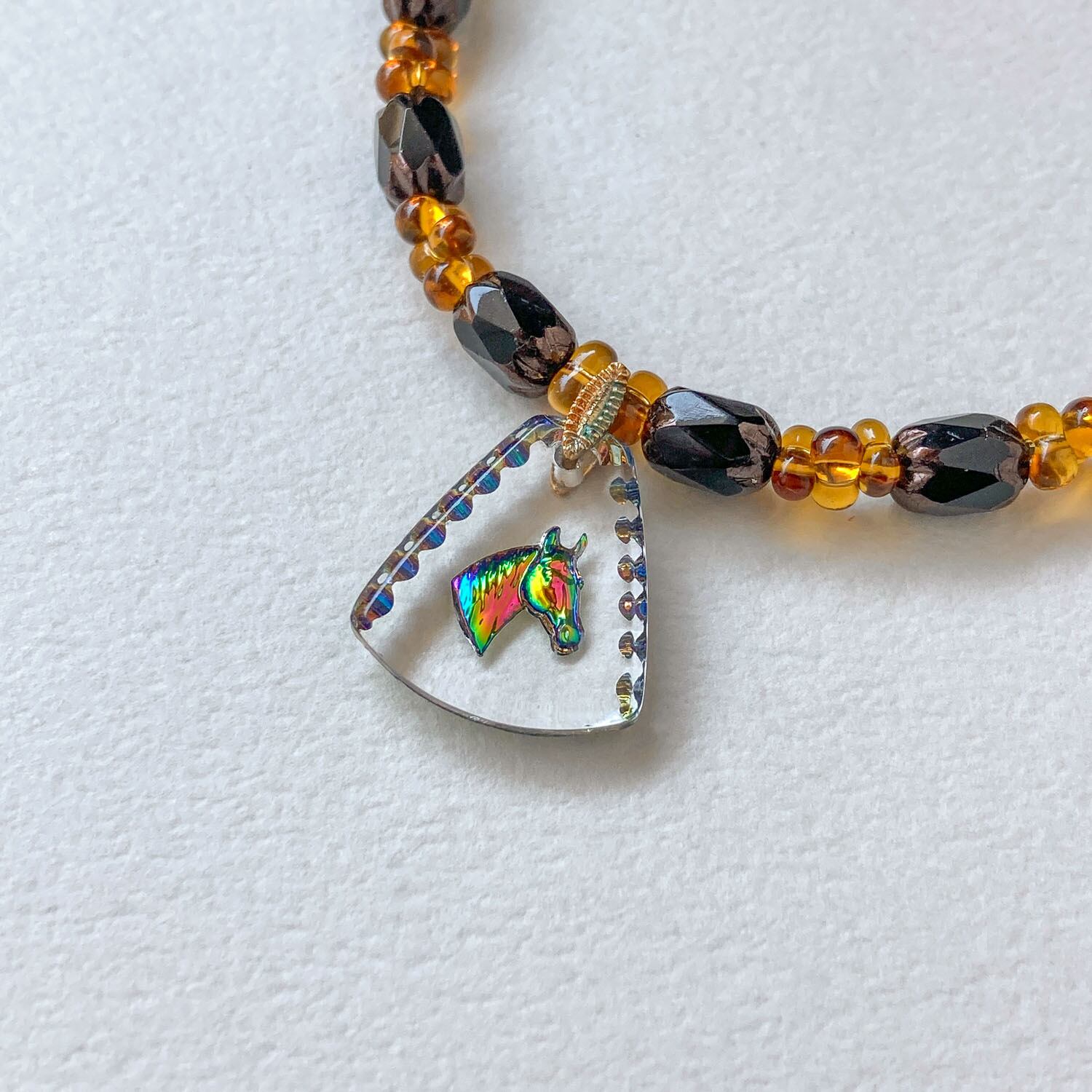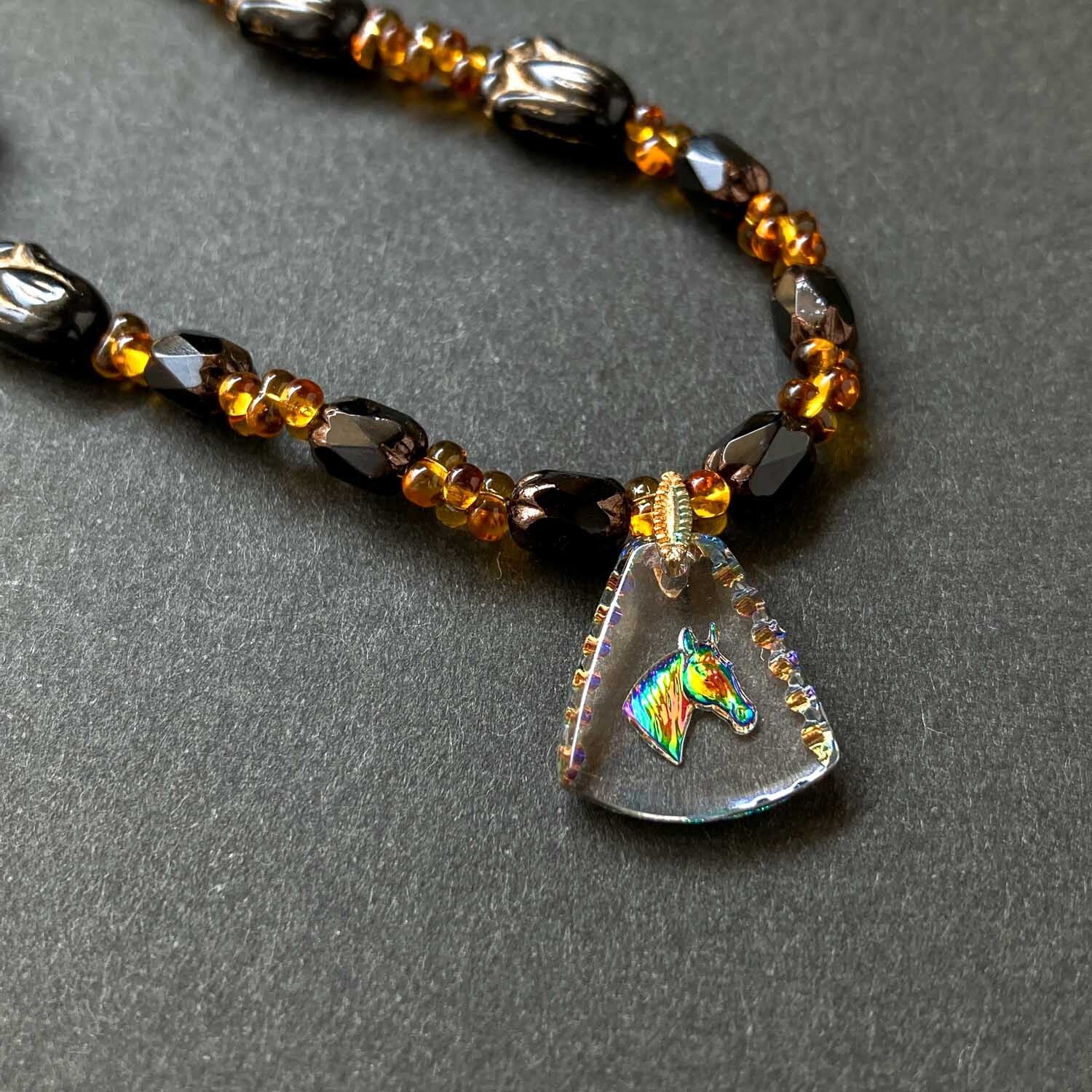 玉虫色に輝く馬の模様が美しいネックレストップと